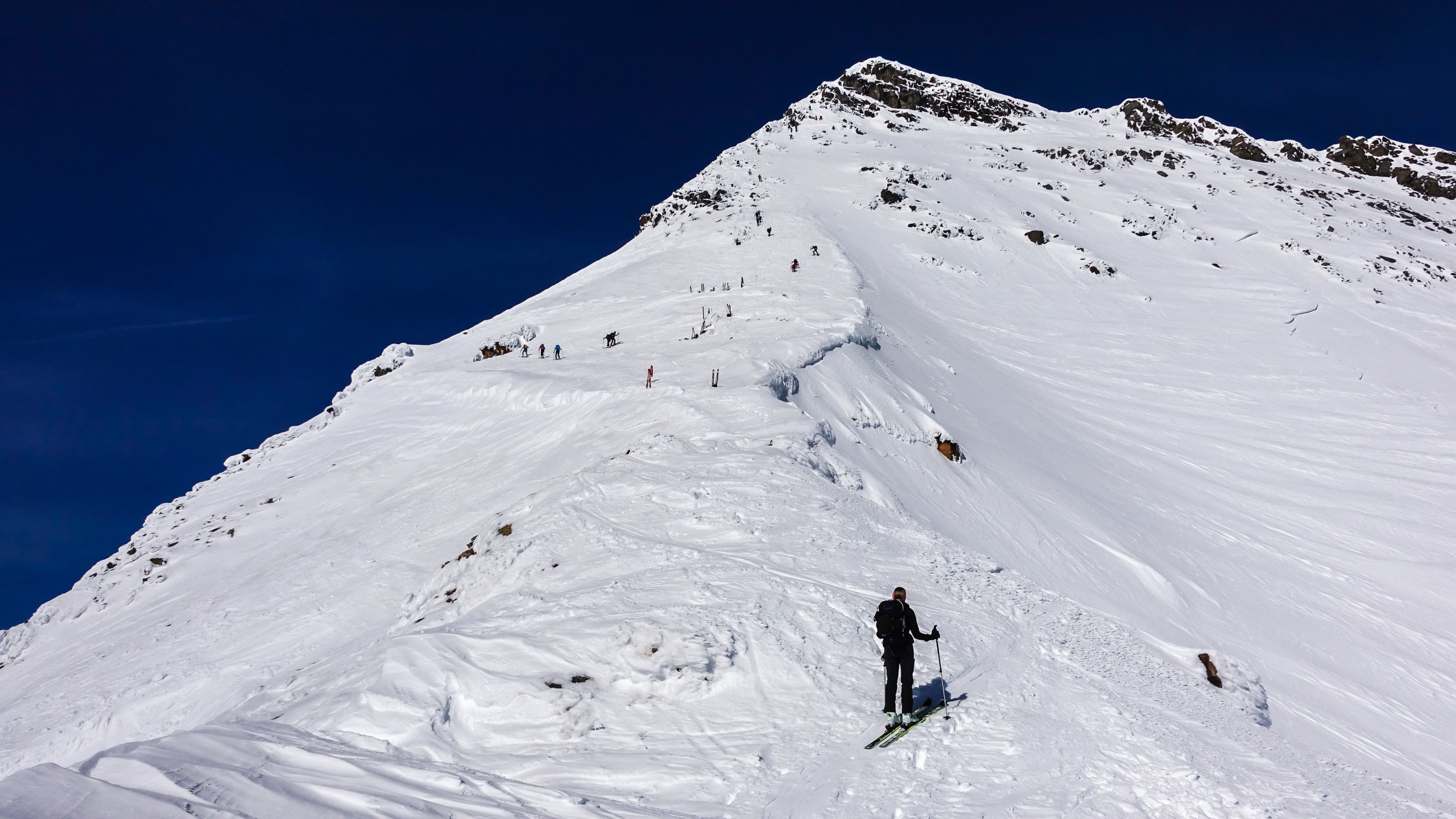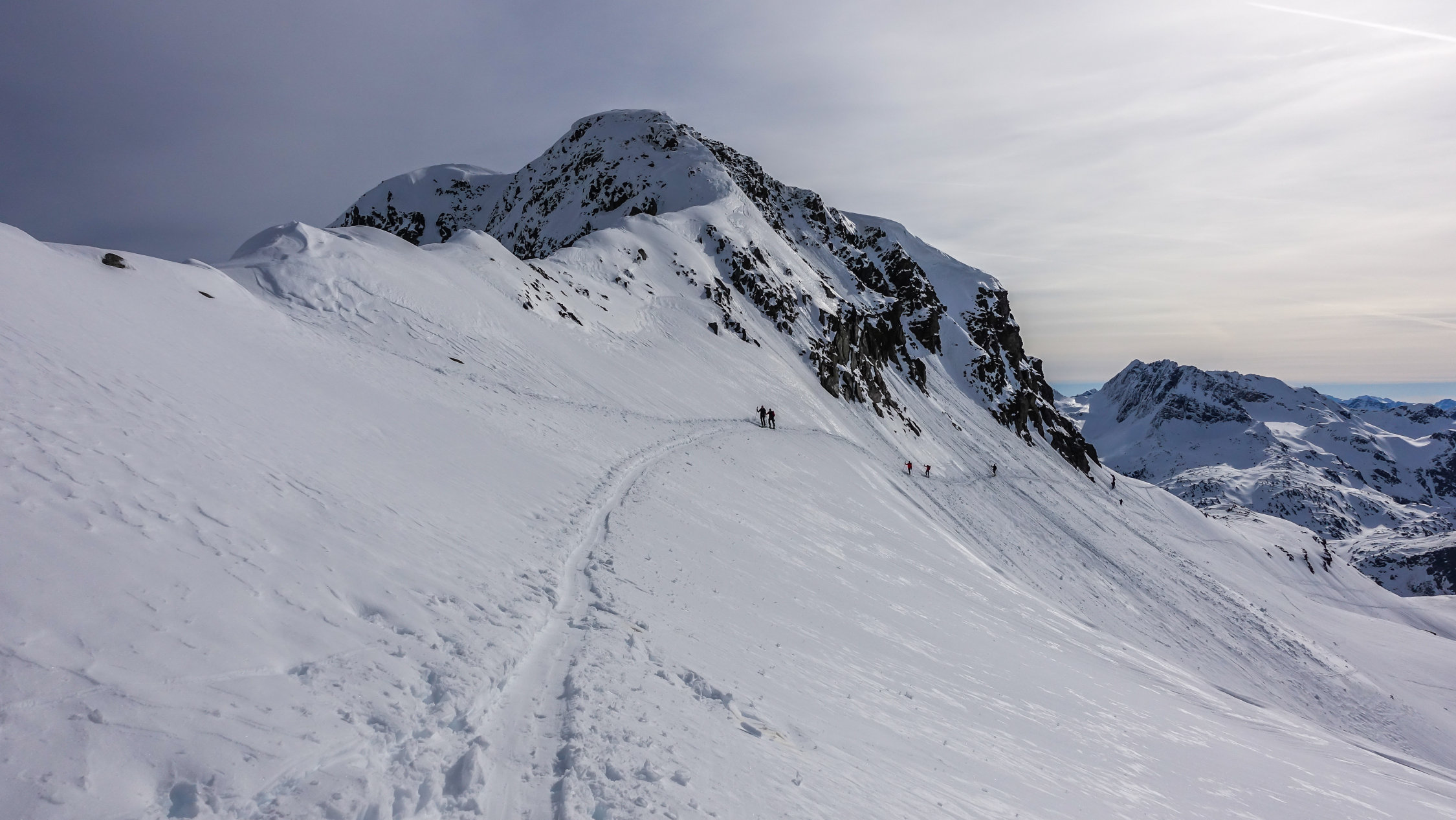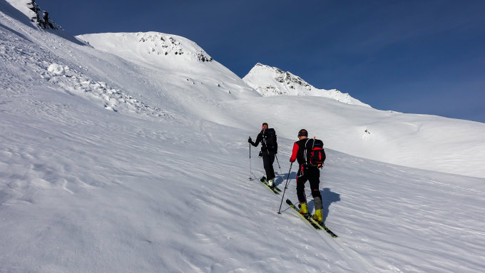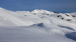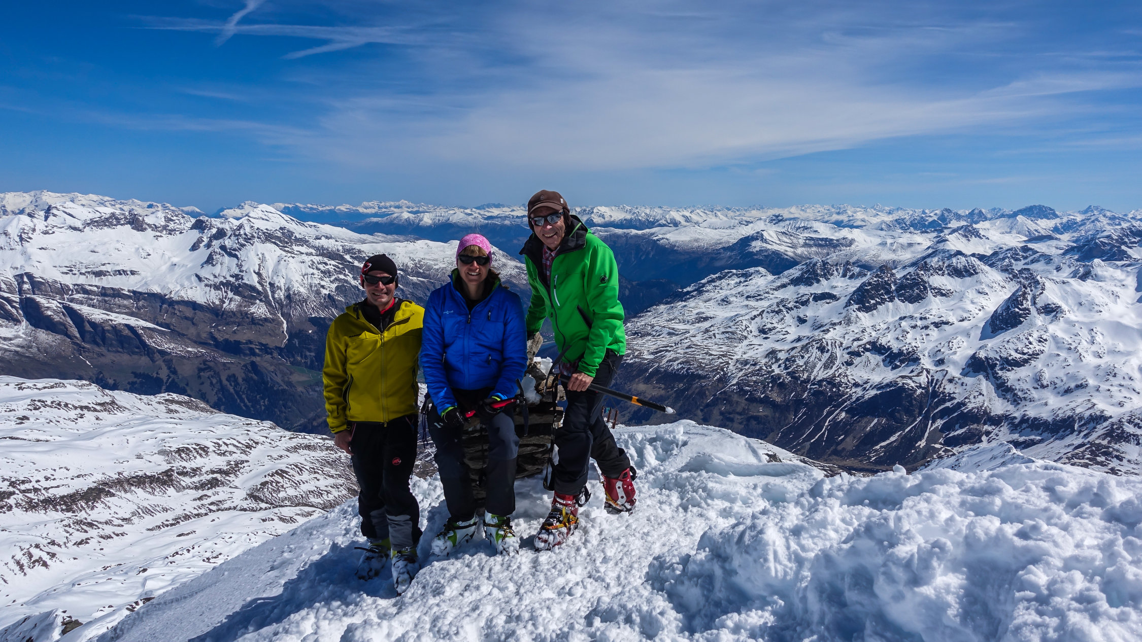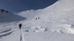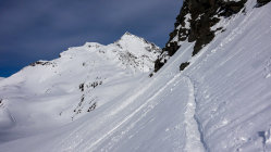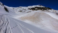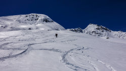 Traumwetter, windstill. Start um 6.30 Uhr beim Berghaus, noch viel Schnee bis zur Passstrasse. Tragende gefrorene Schneedecke. Sehr angenehme Aufstiegsspur. Skidepot momentan relativ weit oben am Gipfelhang. Dann mit Steigeisen und Pickel zum Gipfel (Steigeisen sehr zu empfehlen). Die Verhältnisse am steilen Gipfelaufbau sind momentan sehr günstig; ganzer Aufstieg in gutem, weichen Trittschnee.