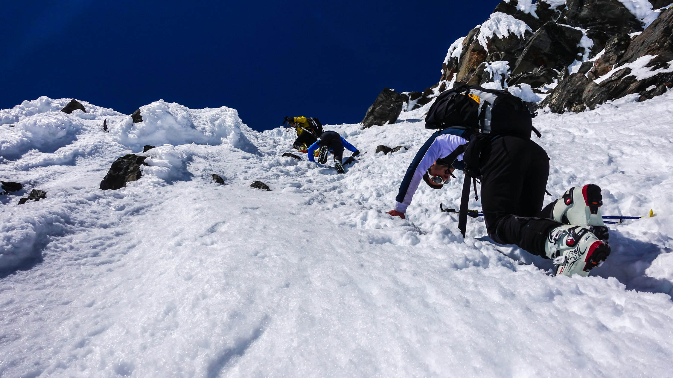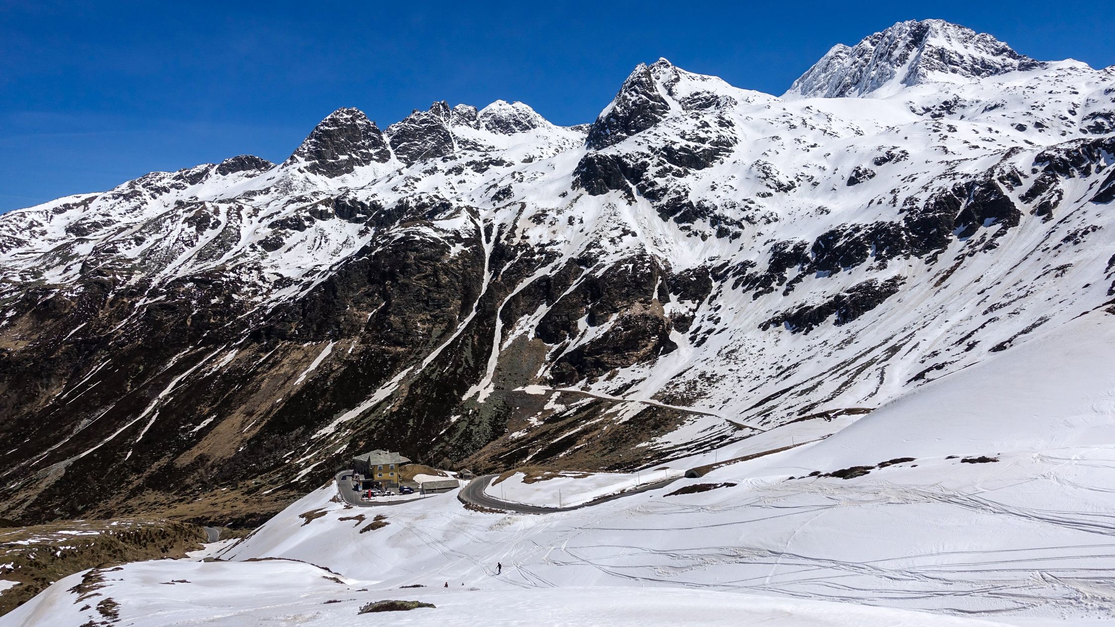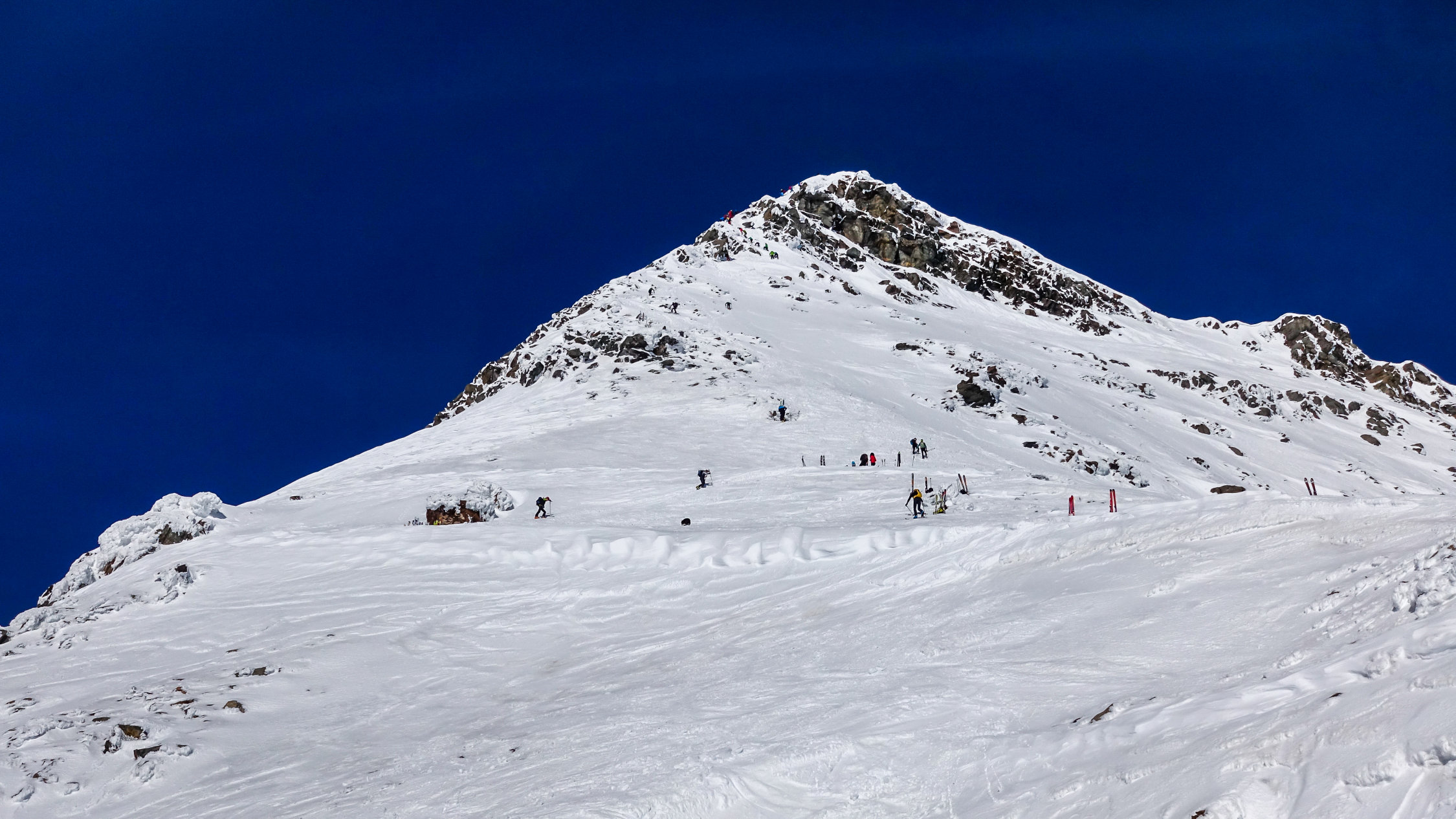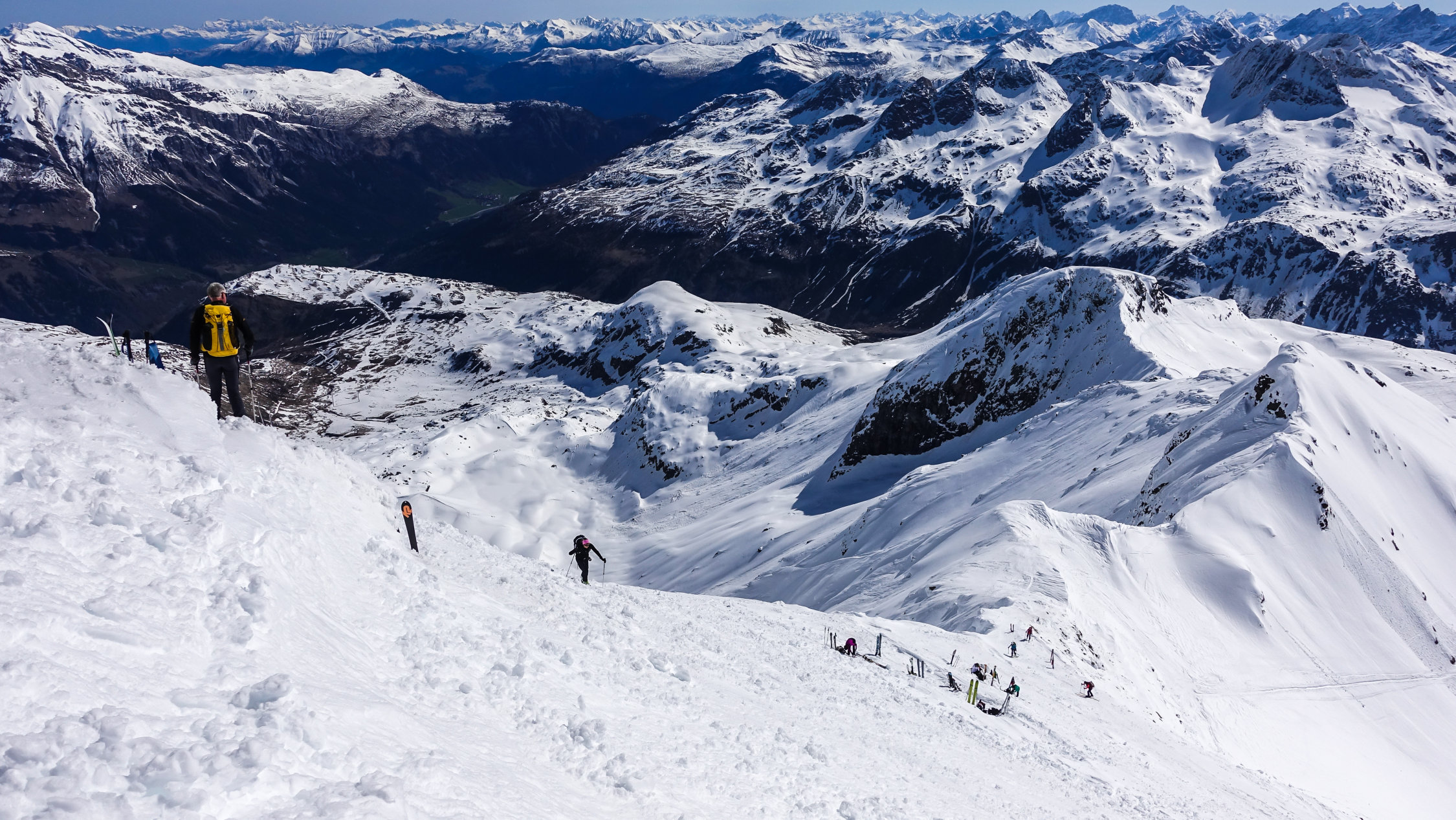 Traumwetter, windstill. Start um 6.30 Uhr beim Berghaus, noch viel Schnee bis zur Passstrasse. Tragende gefrorene Schneedecke. Sehr angenehme Aufstiegsspur. Skidepot momentan relativ weit oben am Gipfelhang. Dann mit Steigeisen und Pickel zum Gipfel (Steigeisen sehr zu empfehlen). Die Verhältnisse am steilen Gipfelaufbau sind momentan sehr günstig; ganzer Aufstieg in gutem, weichen Trittschnee.