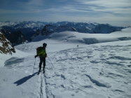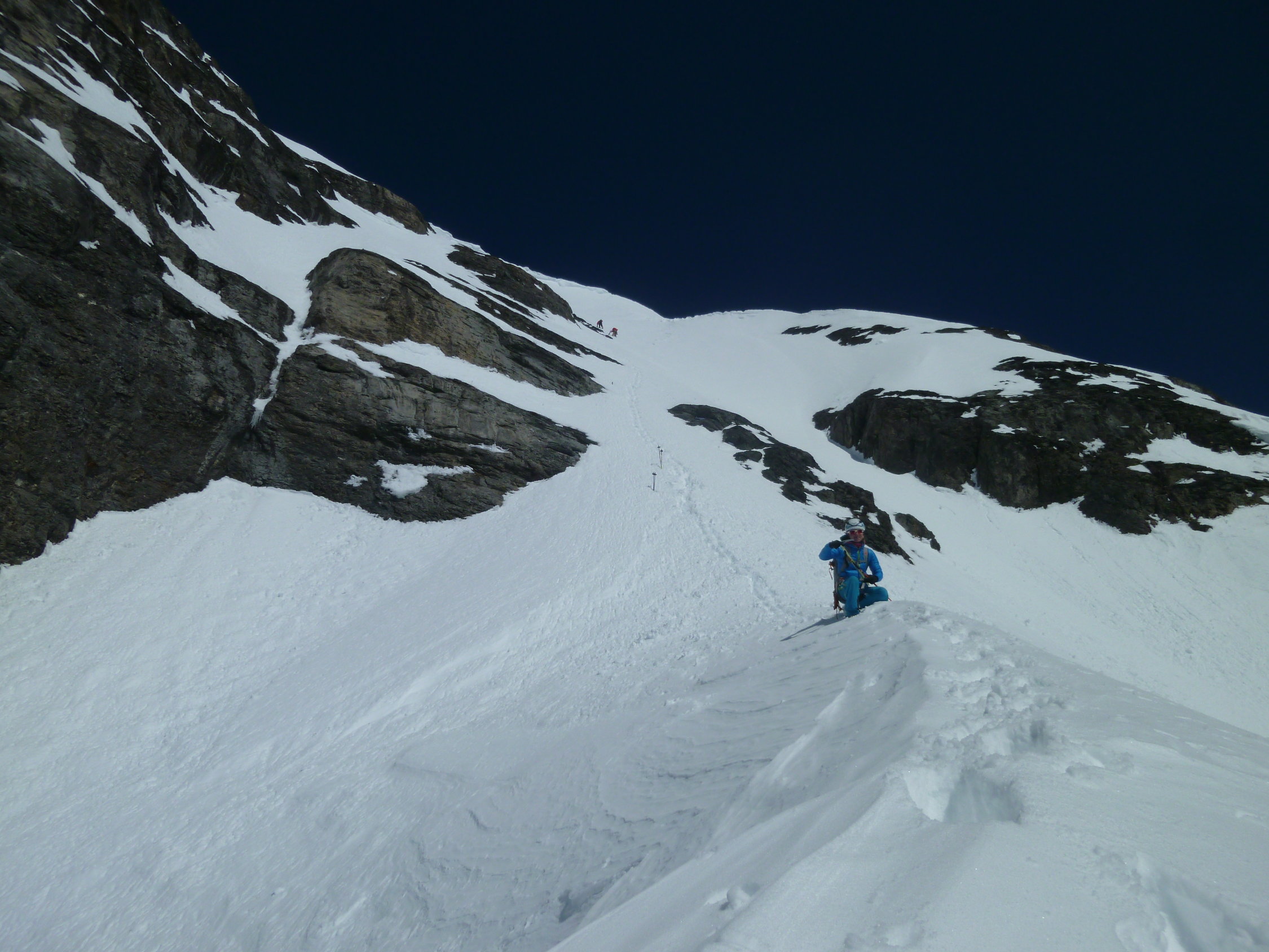 Geplanter Gipfelverzicht weil zu spät dran (Erwärmung), Umkehr ca 100Hm oberhalb Skidepot. "Lieber übervorsichtig als unterlawinig"...wie einst ein anderer Gipfelbuchautor schrieb.