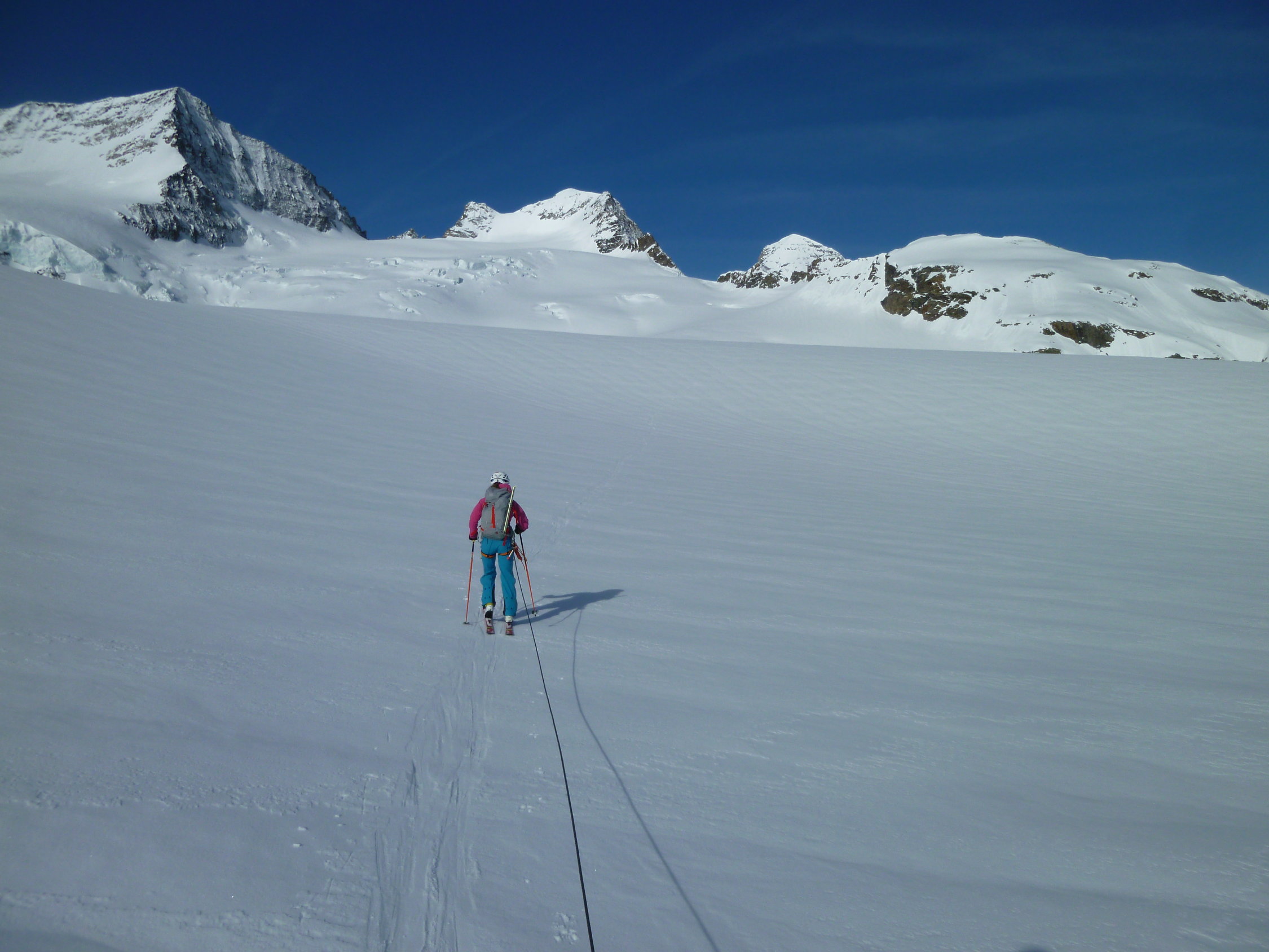 Nach Tragestrecke über den Sommerweg durchgehende Schneedecke ab ca 1850müM, im Aufstieg alles tiptop tragend. Gletscher perfekt eingeschneit.
