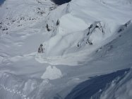 Aufstieg zum Grat hart und steil, mit Harscheisen aber gut machbar bis zur Stange. Von dort die kleine Aufstiegrinne gefunden und mit Steigeisen durchstiegen.