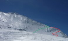 Skidepot bei 2930m, da sich hier in die NW-Wand queren lässt. Gipfelaustieg leider nur selten tragend, mehrheitlich etwas tieferer Trittschnee womit die Kraft am Gipfel dann alle war, 11Uhr. Querung durch den unteren Teil der NW Wand ziemlich hart. Ab Fuorcla Blengias waren wir für eine schöne Abfahrt mindestens 1h zu spät.