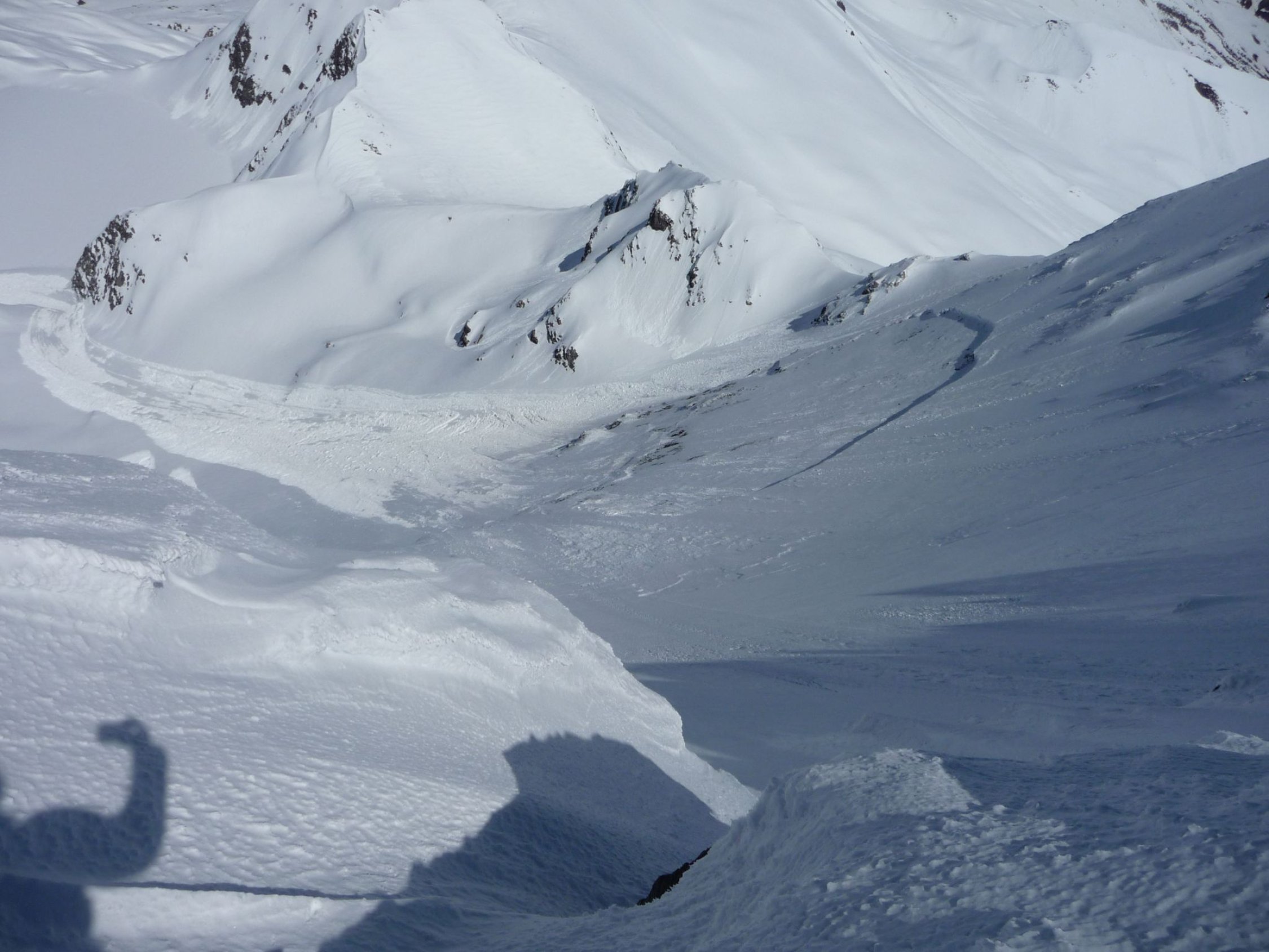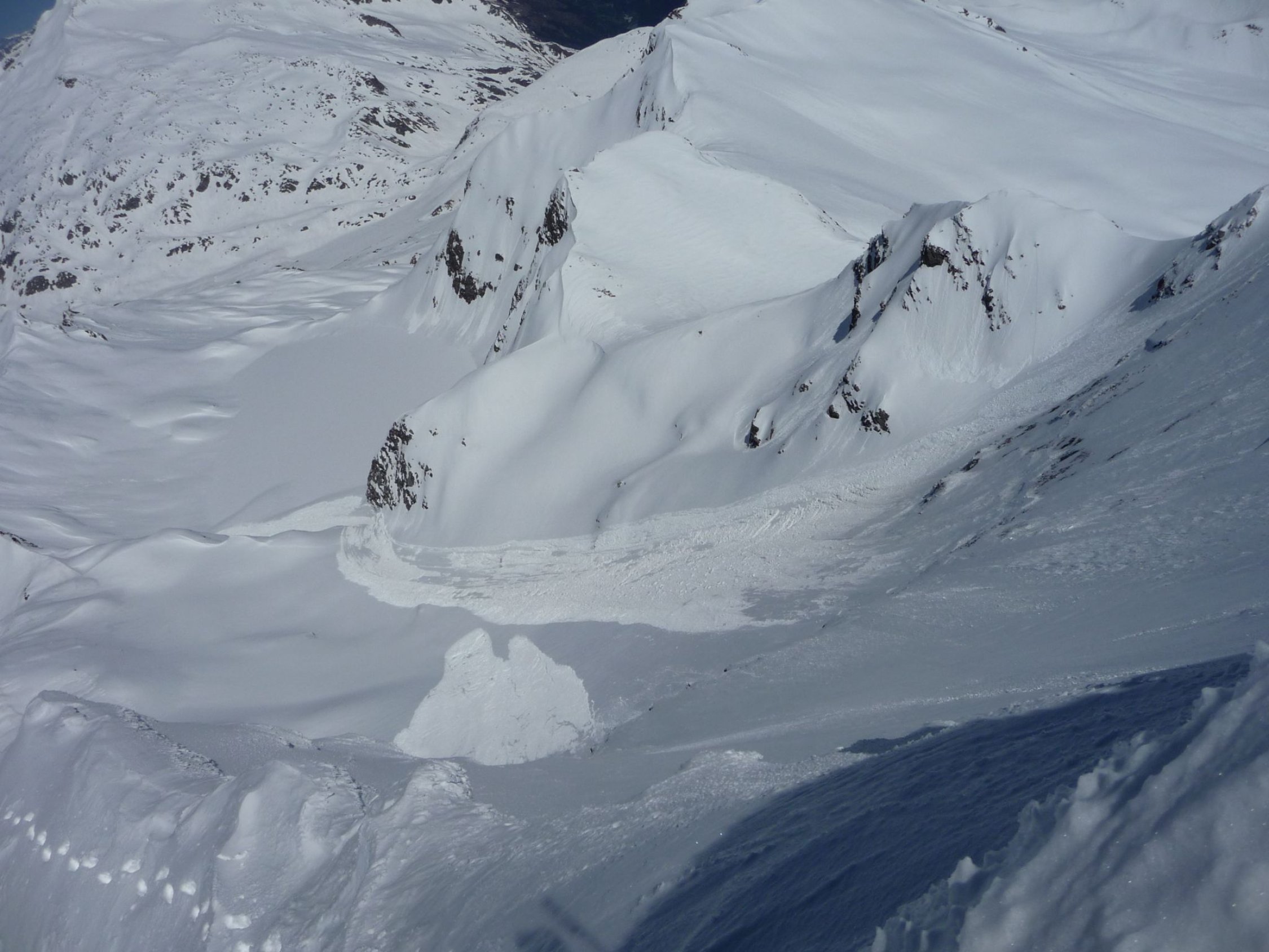 Siehe Bilder. Lawine bis auf den Felsgrund aus der Wand abgegangen. Vermutlich am Nachmittag tags zuvor (Sonneneinfluss). Weitere Anrisskanten zu verschiedenen Schichten waren in der Wand zu sehen. Beeindrucken ist, dass sich die Lawine durch das flache Gelände auf Gleitschichten bis zum See geschoben hat.