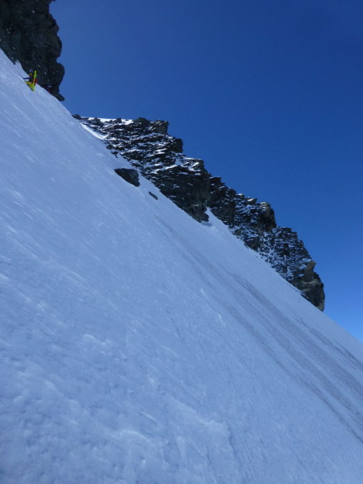 Nach klarer Nacht morgens kühl, dann mild und warm. Strasse bis Cordonna offen. Unterhalb der Schneegrenze auf ca. 2250 Ski je ca. 1h getragen. Schnee bis unter den Col des Maisons Blanches morgens gefroren, ab Mittag (überreifer) Sulz. Ab ca. 3200m und in der NW-Flanke gesetzter Pulver, der im Aufstieg anstrengend zum Spuren, bei der Abfahrt aber gut zu fahren ist. Der Bergschrund kann z.Z. problemlos überschritten und -fahren werden. Die obersten ca. 70Hm der NW-Flanke haben z.T. nur eine dünne Schneeschicht auf Eis oder sind sonst hart: ich bin dort die ersten 10Hm mit Steigeisen und Eisgeräten abgeklettert und die restlichen 60Hm mit Ski und einem Eisgerät abgerutscht.