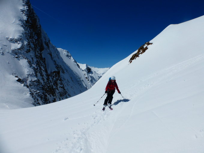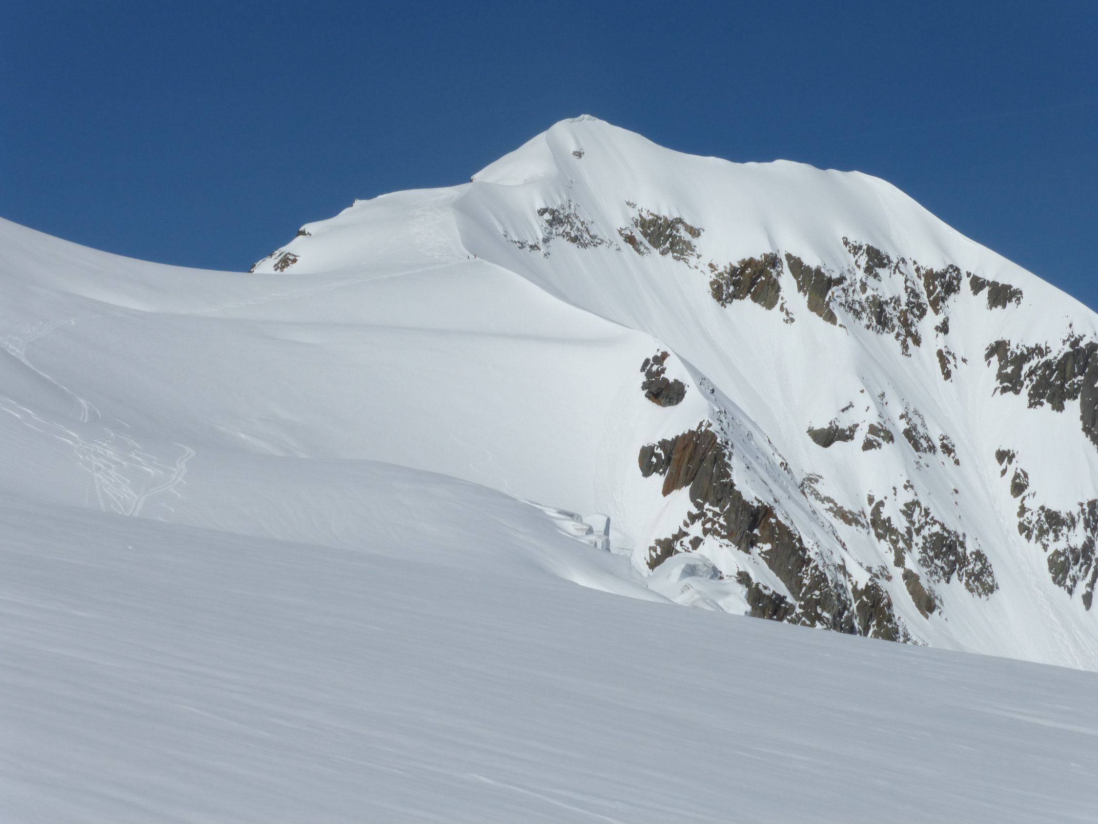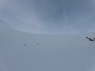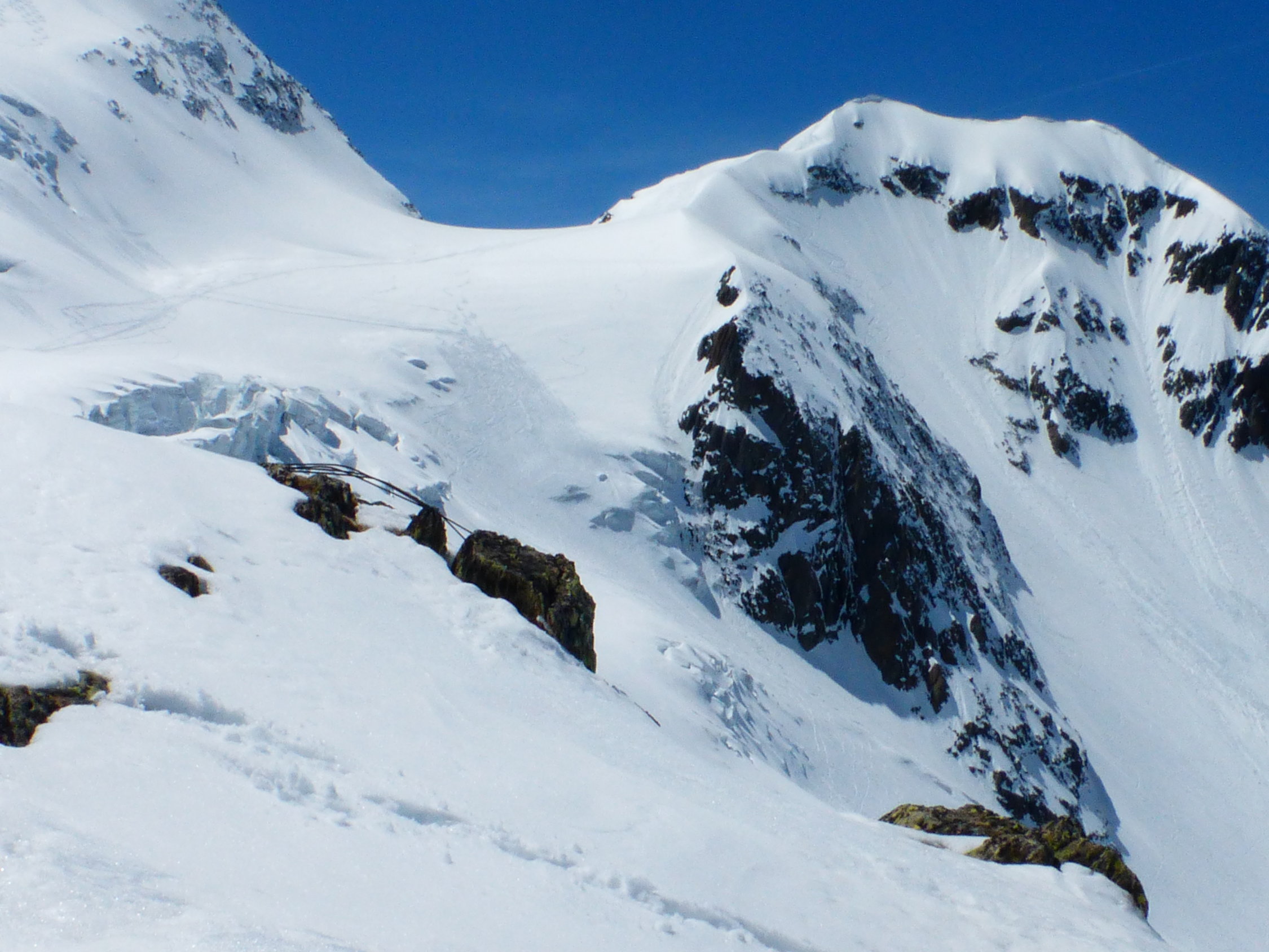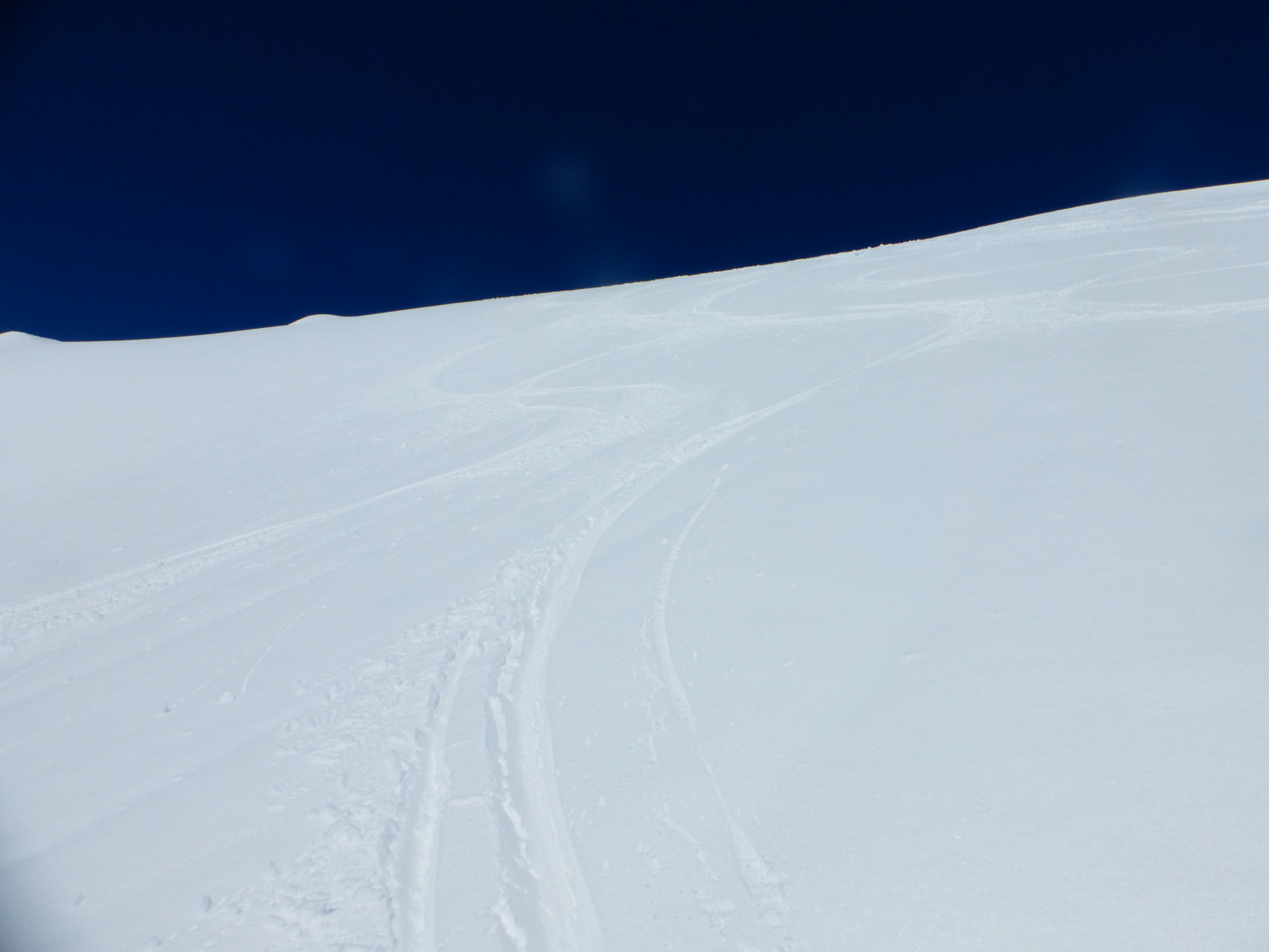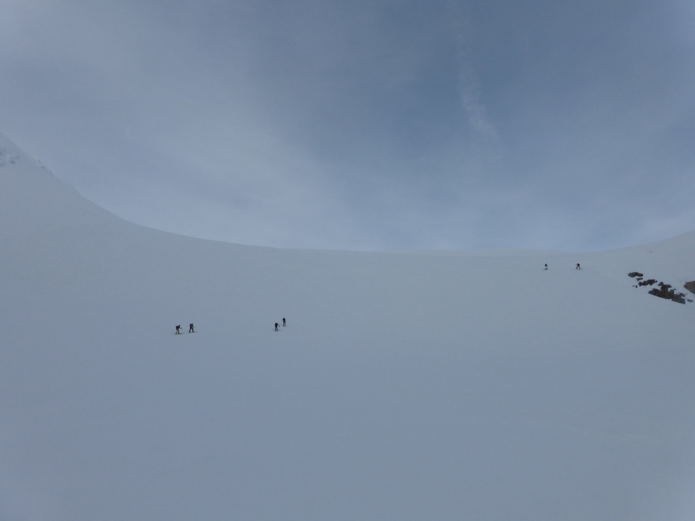 Gipfelhang am Schluss nicht gemacht, a) die letzten 3 Spitzkehren sind doch etwas ausgesetzt und der ganze Hang war schon länger von der Sonne beschienen. ( siehe auch Bild) Abfahrt zur Tierberglihütte zwar kurz, aber doch noch einige Sulzschnee Schwünge gemacht