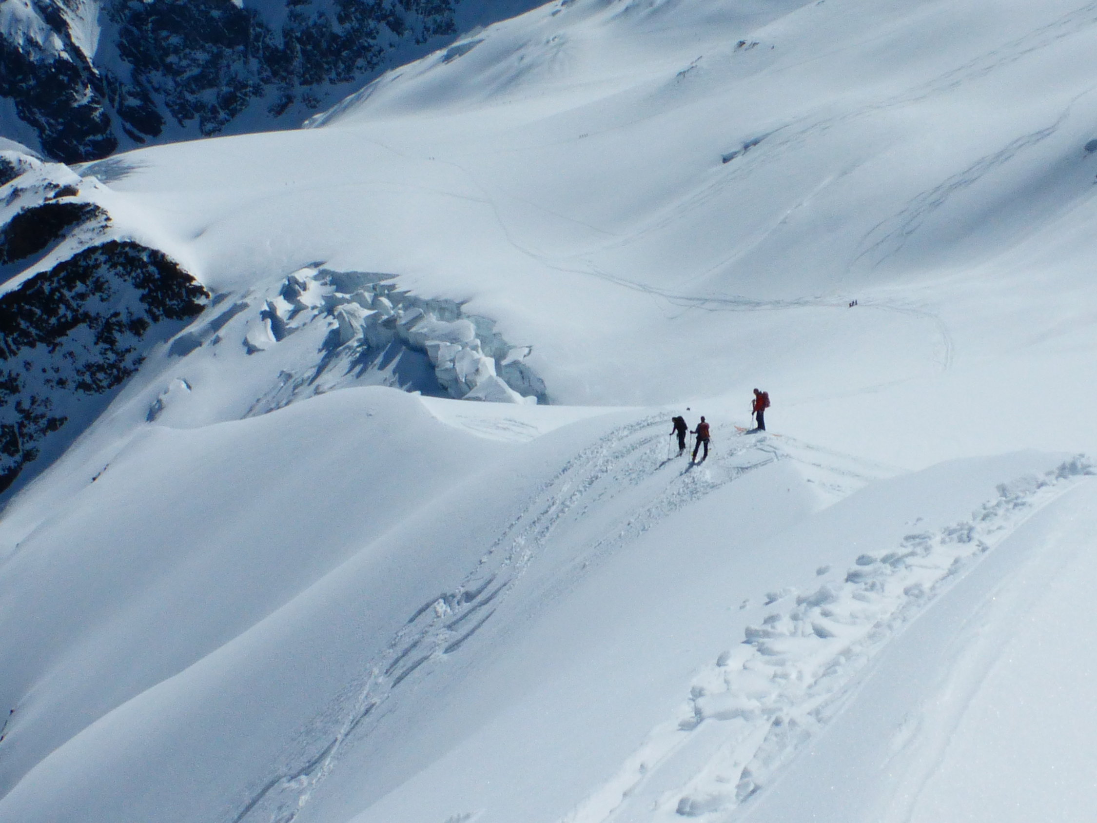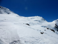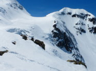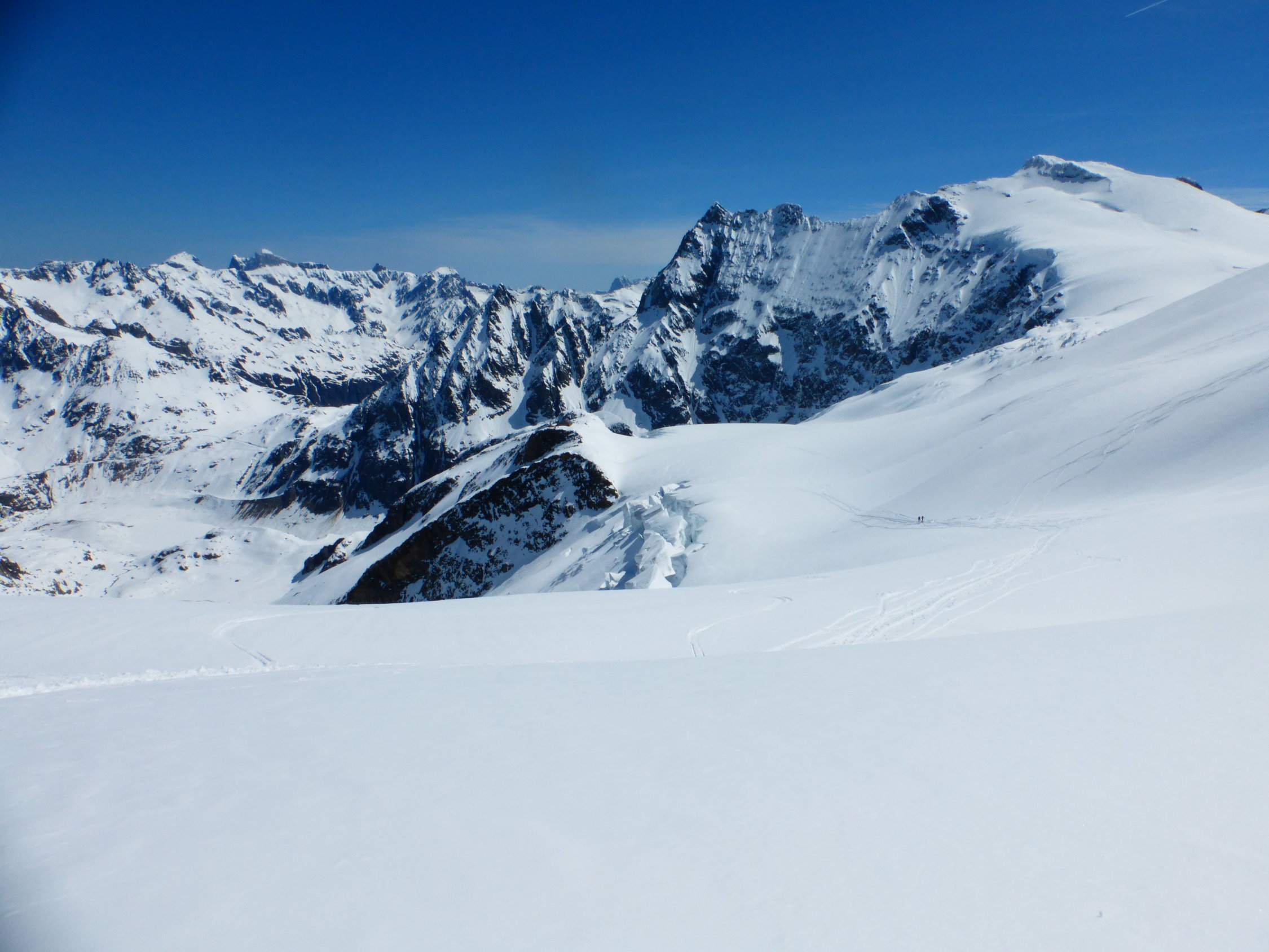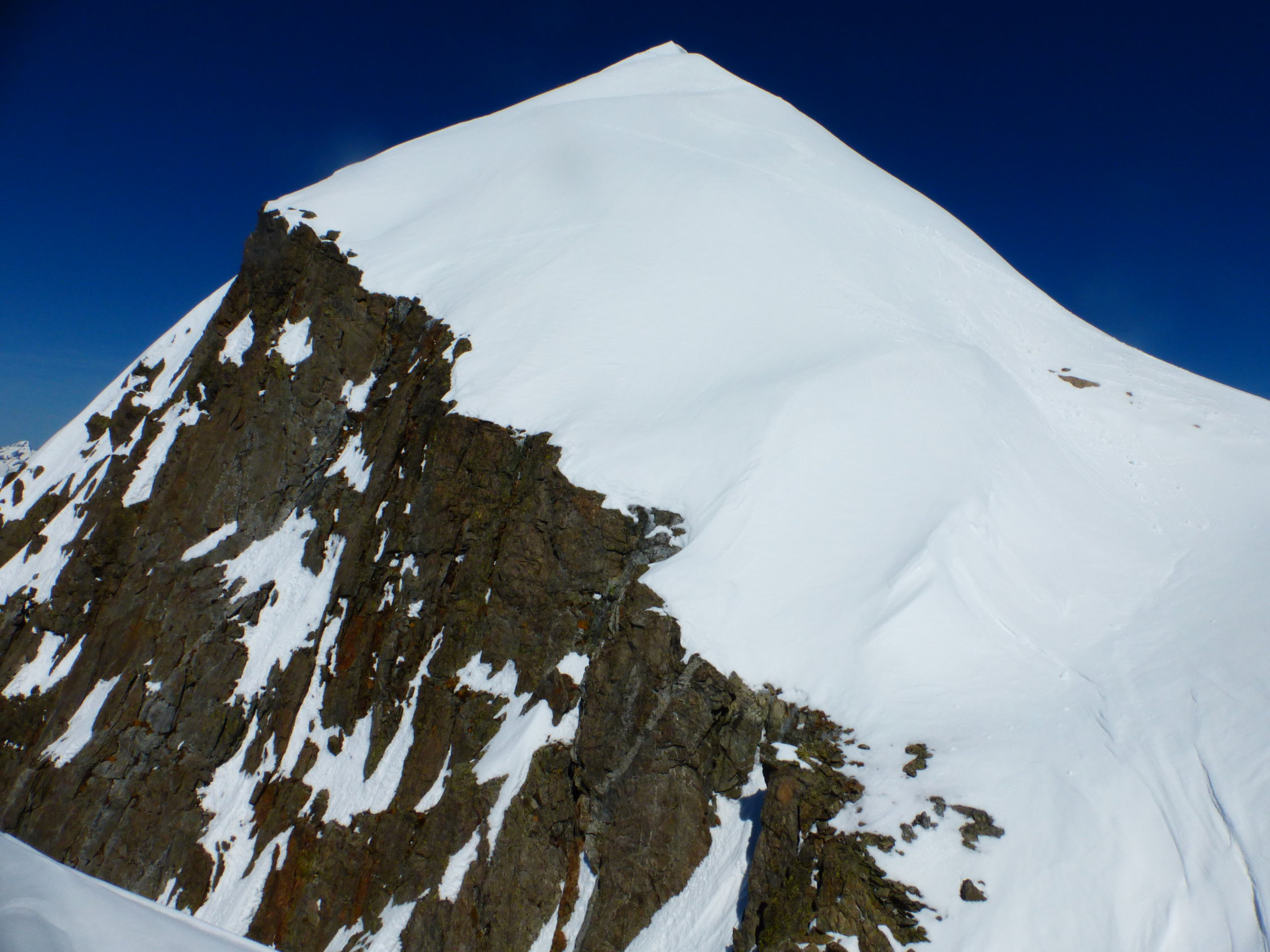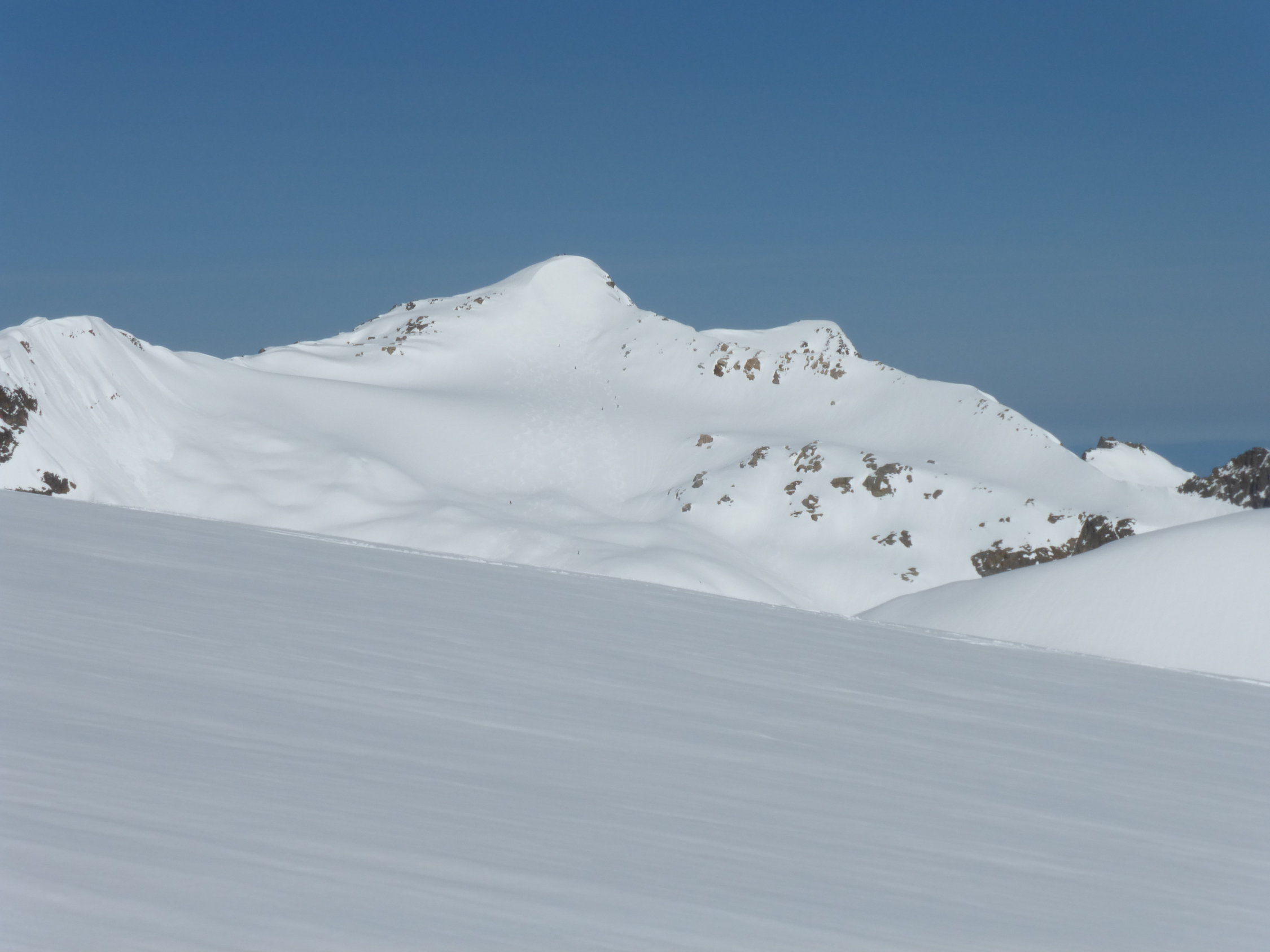 Gipfelhang am Schluss nicht gemacht, a) die letzten 3 Spitzkehren sind doch etwas ausgesetzt und der ganze Hang war schon länger von der Sonne beschienen. ( siehe auch Bild) Abfahrt zur Tierberglihütte zwar kurz, aber doch noch einige Sulzschnee Schwünge gemacht