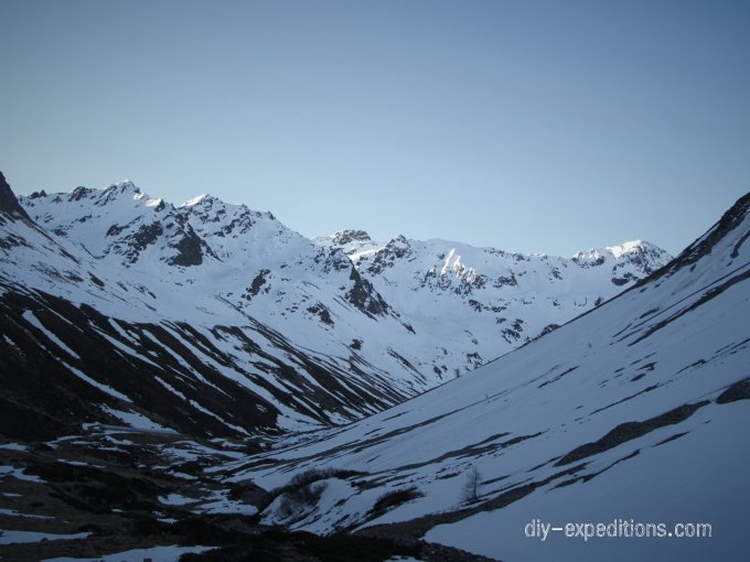 Die Ski trägt man ins Chüealptal bis ca. der Alpe. Von dort ist der Schnee mehr oder weniger durchfeuchtet. Der Aufstieg ist entsprechend schwerer durch das ständige Einbrechen durch den wenige Zentimeter tiefen Deckel. Erst ab ungefähr Mitte des Gletschertälli wird die Schneedecke kompakter und hart. Auf dem Chüealpgletscher und noch mehr beim Gipfelaufstieg ist der Schnee patzig, Rutsche kommen ständig aus den Flanken (9.30). Die Abfahrt ist nicht besonders - Bruchharsch. Weiter unten sulzig, was wenigstens leicht zu fahren ist.