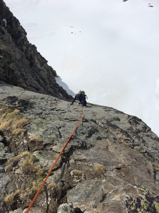 Tolle Klettertour im warmen Fels. Der Zustieg führt über die Schneefelder und gutes Schuhwerk ist von Vorteil.
