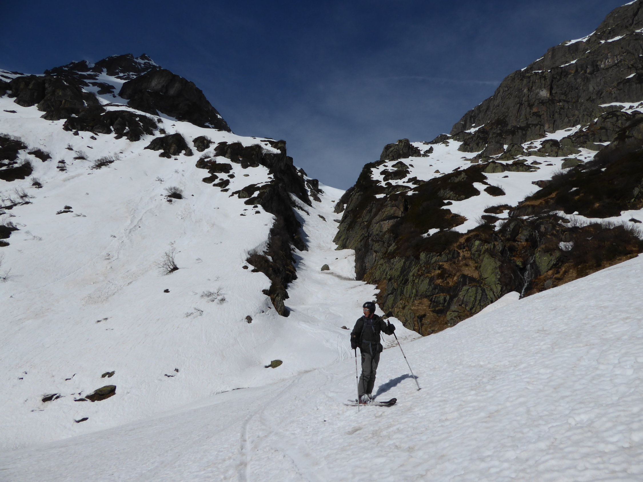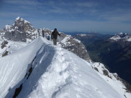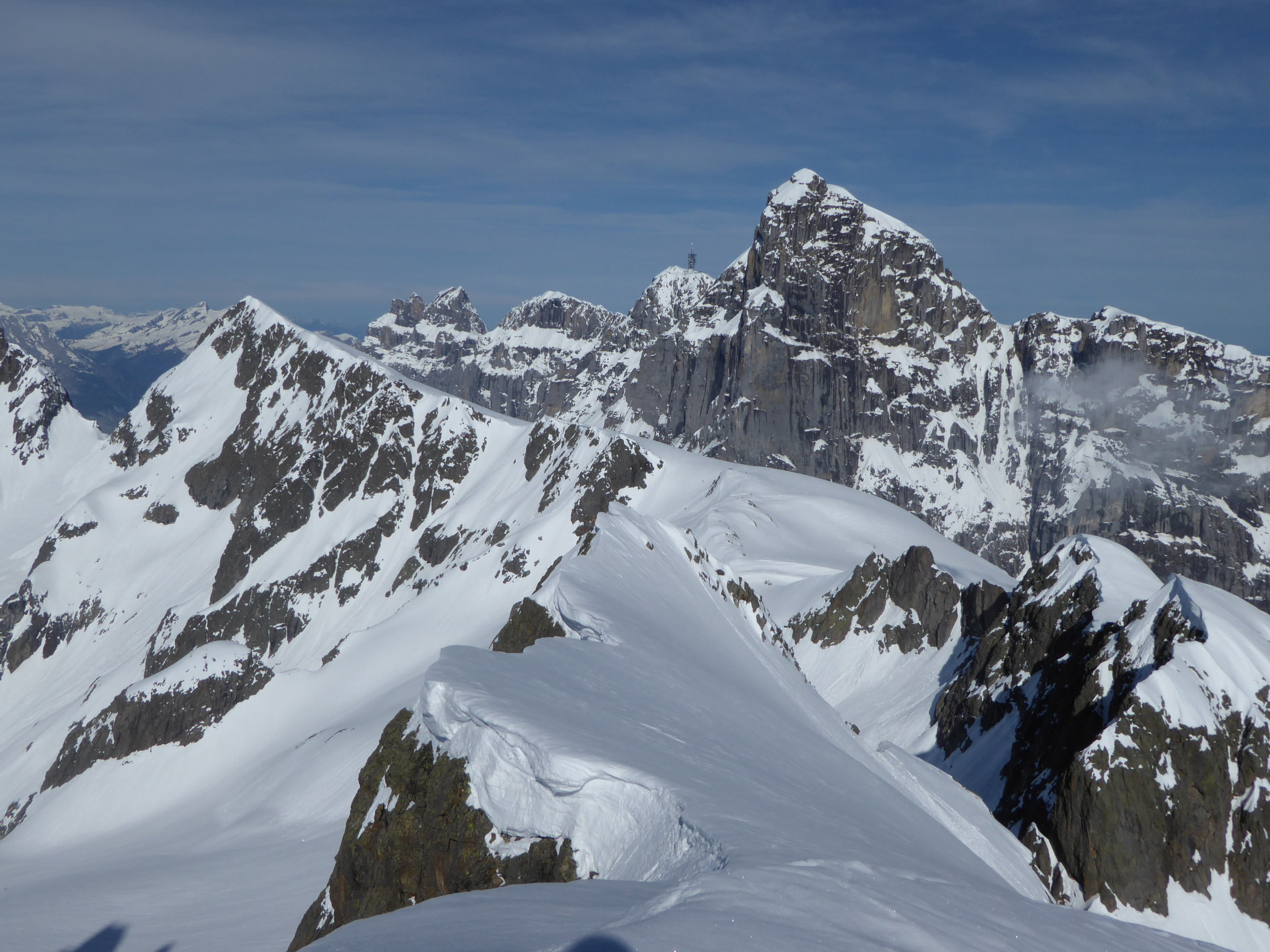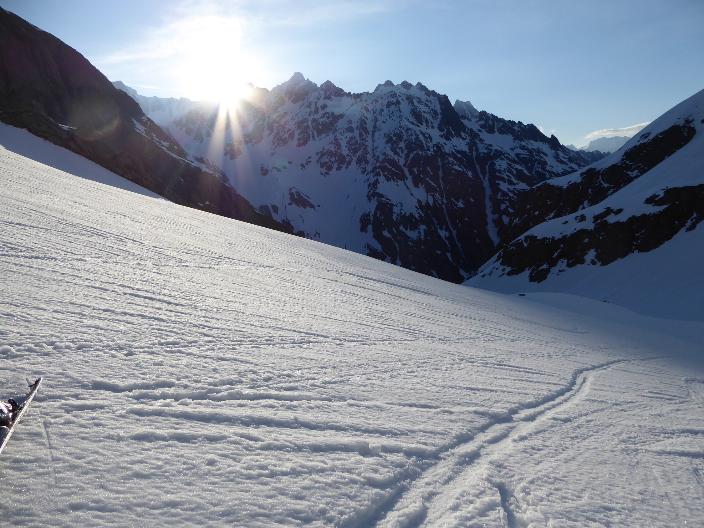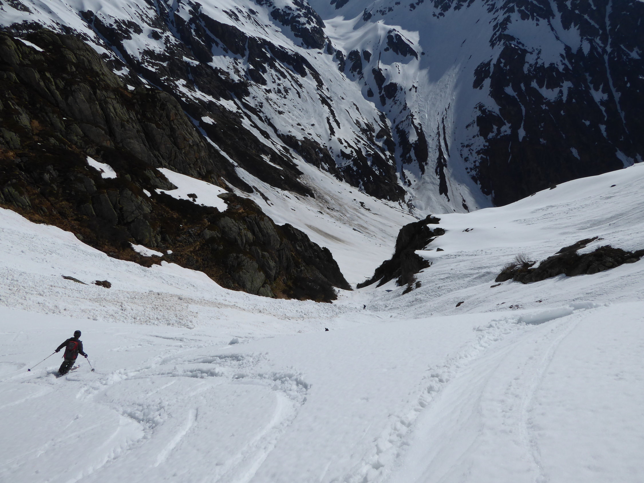 Das Meiental hat sich als gutes Tourengebiet wie immer bei Föhn bewährt. Nach zehn Minuten skitragen konnte mit genügend Schnee den richtigen Ski-Aufstieg beginnen. Die Schneedecke war recht gut gefroren und trotzdem griffig so genossen wir den Aufstieg und mussten keine Harsteisen montieren bis zum Skidepot das wir kurz unter dem Sattel machten. Der Aufstieg zum Sattel wurde etwas mühsam da der Schnee recht weich und unstabil ist und sich der Bergschrund noch etwas öffnete. Weiter konnten wir ohne Steigeisen im Trittschnee zum Gipfel aufsteigen wo noch 3 weitere Türeler droben waren. Der Wind war nur leicht zu spüren, so das wir das Panorama in aller Ruhe geniessen konnten. Die Abfahrt war super der Zeitpunkt am 9.30 Uhr gerade recht, der Schnee war fast bis nach unten ins grüne Tal gut tragend und schön zum befahren. Es waren nicht mehr viele Tourengänger im Gebiet unterwegs. Wir liefen um 5.45 Uhr los, etwa ein halbe Stunde früher währe jedoch besser wegen der Sonneneinstrahlung.