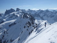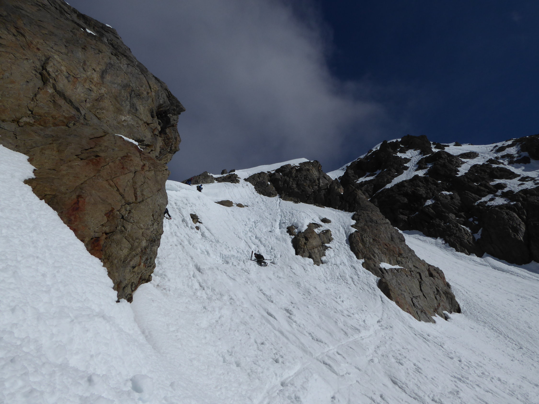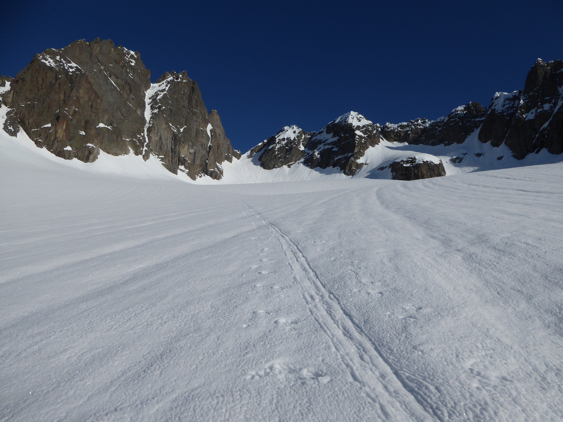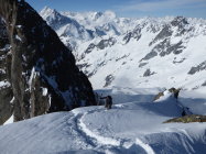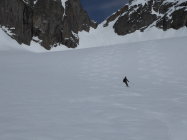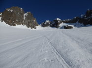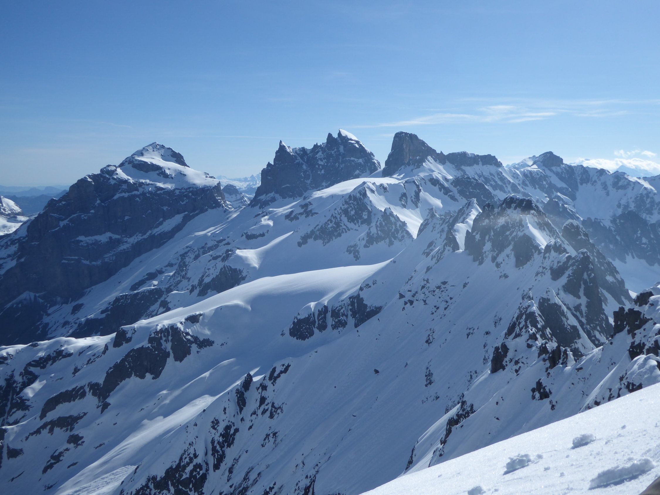 Das Meiental hat sich als gutes Tourengebiet wie immer bei Föhn bewährt. Nach zehn Minuten skitragen konnte mit genügend Schnee den richtigen Ski-Aufstieg beginnen. Die Schneedecke war recht gut gefroren und trotzdem griffig so genossen wir den Aufstieg und mussten keine Harsteisen montieren bis zum Skidepot das wir kurz unter dem Sattel machten. Der Aufstieg zum Sattel wurde etwas mühsam da der Schnee recht weich und unstabil ist und sich der Bergschrund noch etwas öffnete. Weiter konnten wir ohne Steigeisen im Trittschnee zum Gipfel aufsteigen wo noch 3 weitere Türeler droben waren. Der Wind war nur leicht zu spüren, so das wir das Panorama in aller Ruhe geniessen konnten. Die Abfahrt war super der Zeitpunkt am 9.30 Uhr gerade recht, der Schnee war fast bis nach unten ins grüne Tal gut tragend und schön zum befahren. Es waren nicht mehr viele Tourengänger im Gebiet unterwegs. Wir liefen um 5.45 Uhr los, etwa ein halbe Stunde früher währe jedoch besser wegen der Sonneneinstrahlung.