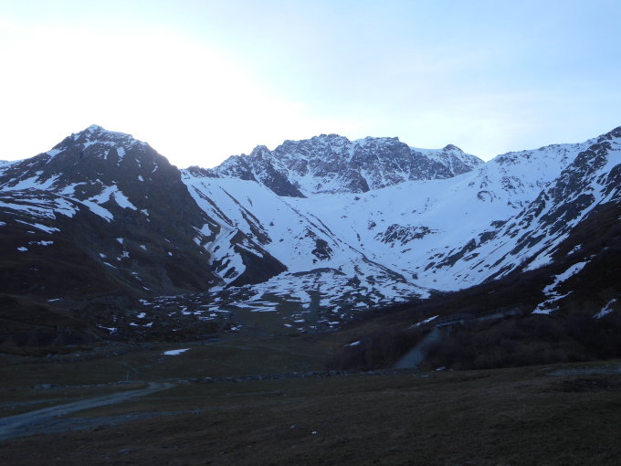 Aufstieg: Schneedecke durchgehend tragend. Der bis 35 gradige Steilhang von Les Darreys, links vom Bach T. Perche ist mit Harscheisen gut zum Aufsteigen.