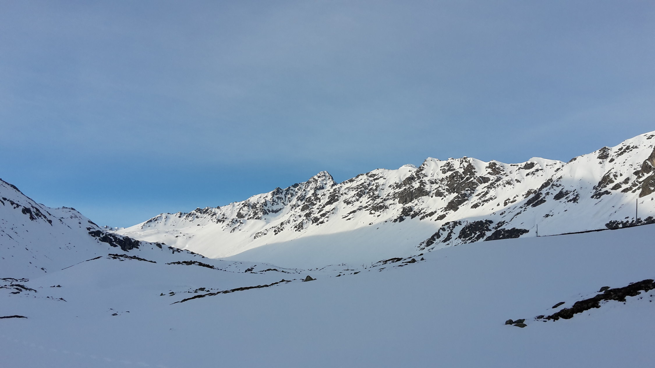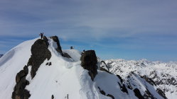 Start der Tour am 6.45 Uhr beim Wägerhaus, das Wetter schön leicht Milchig auf der Südseite, die Schneedecke war durchgehend tragend gefrohren, der heutige Tag war für einmal wieder Windstill, der Neuschnee der letzten Tage hielt sich im Flüelägebiet in Grenzen, schon bald wurde das Skidebot vom Nordostgrat erreicht, nach montieren der Steigeisen zu Fuss zum Vorgipfel, vorbei an der Schlüsselstelle am Grat, diese kurze Stelle ist auch ausgesetzt, zum Gipfel des Flüela Wisshorn.