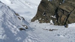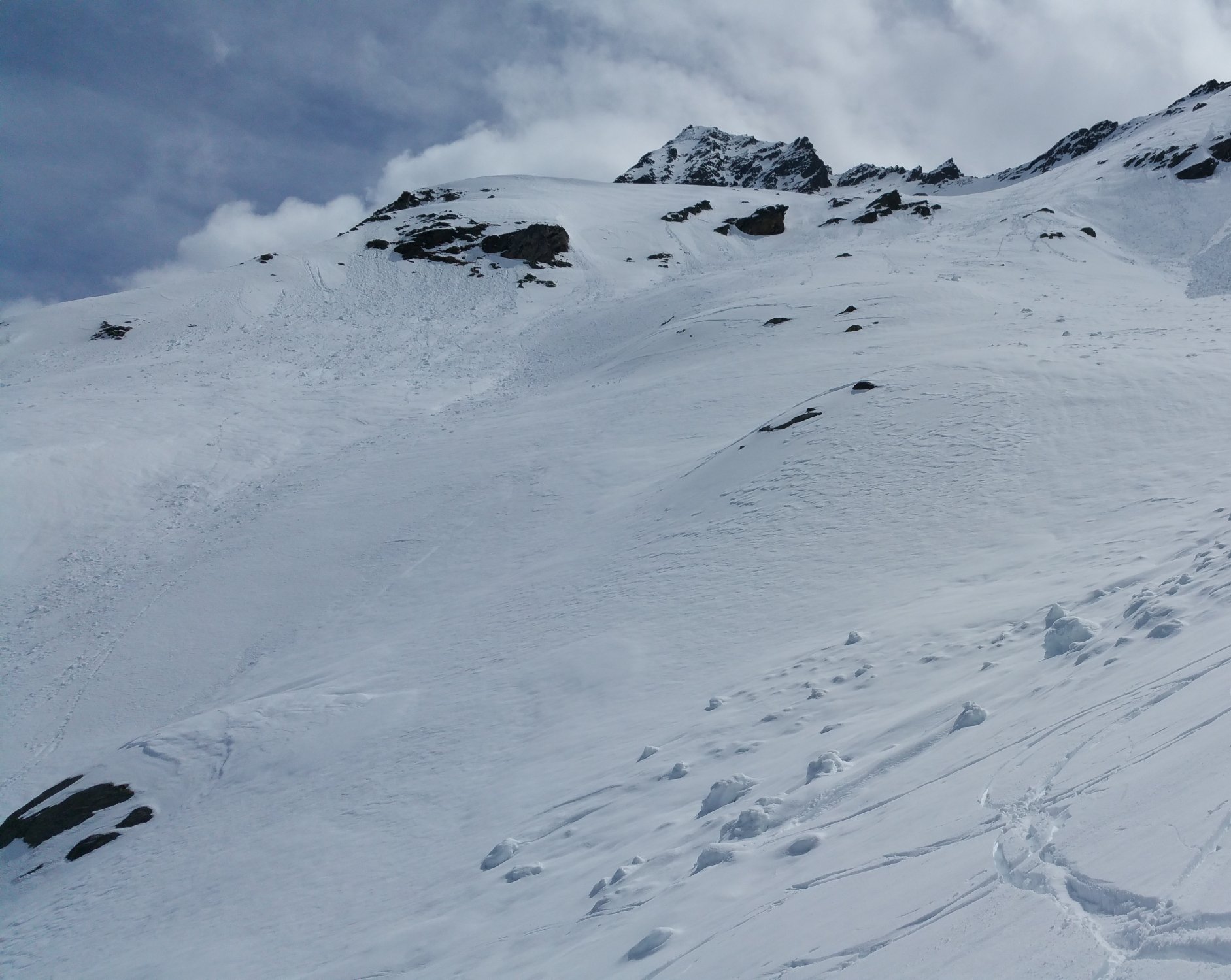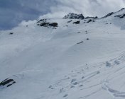 Zurück bei den Skis fährt man auf den schönen Südwestflanke hinunter ins Wasmertälli. Nicht zu weit rechts halten, da man sonst in die Felsbänder geraten kann.