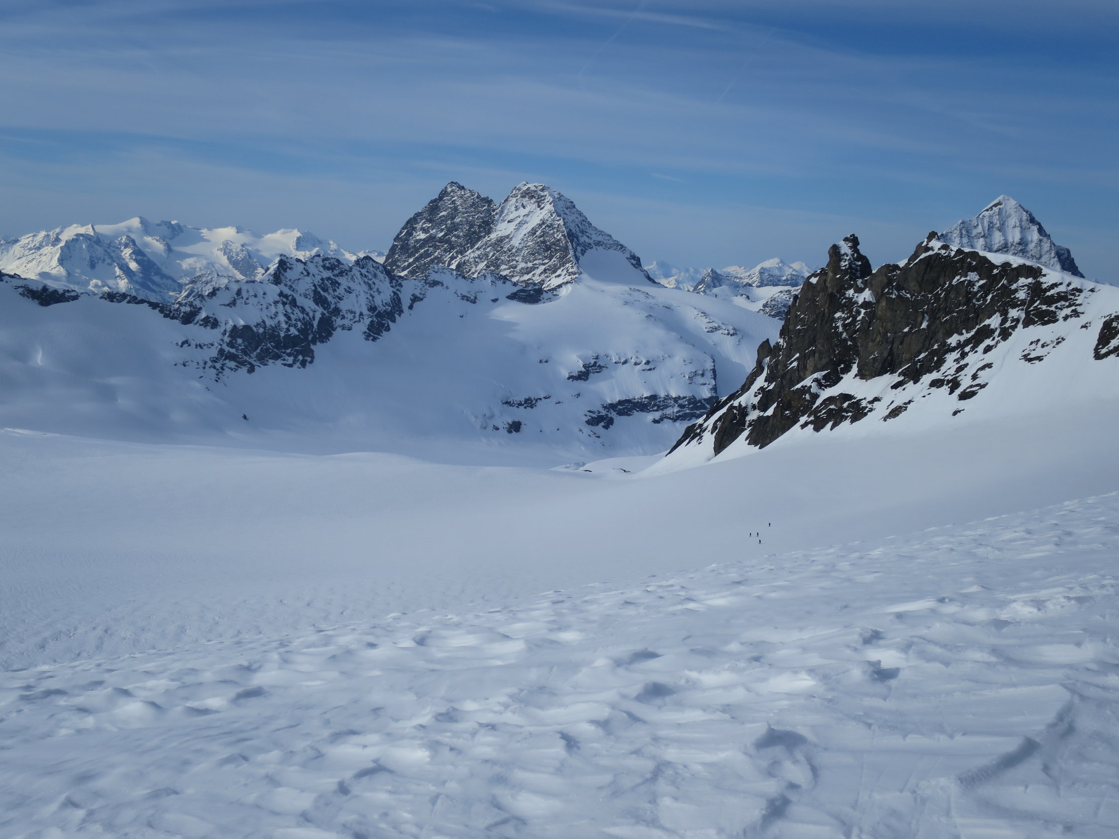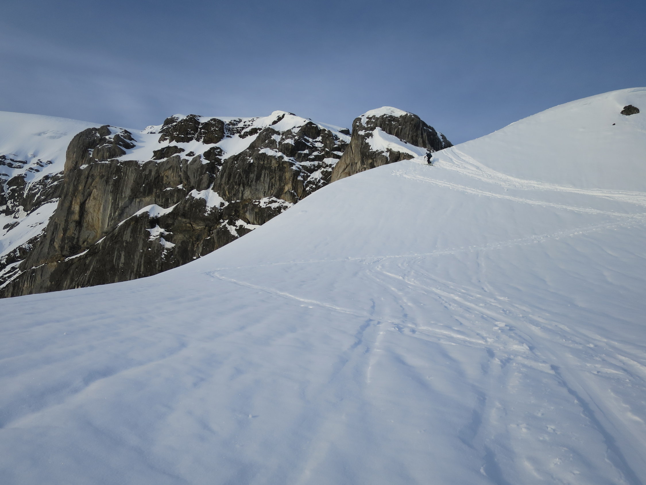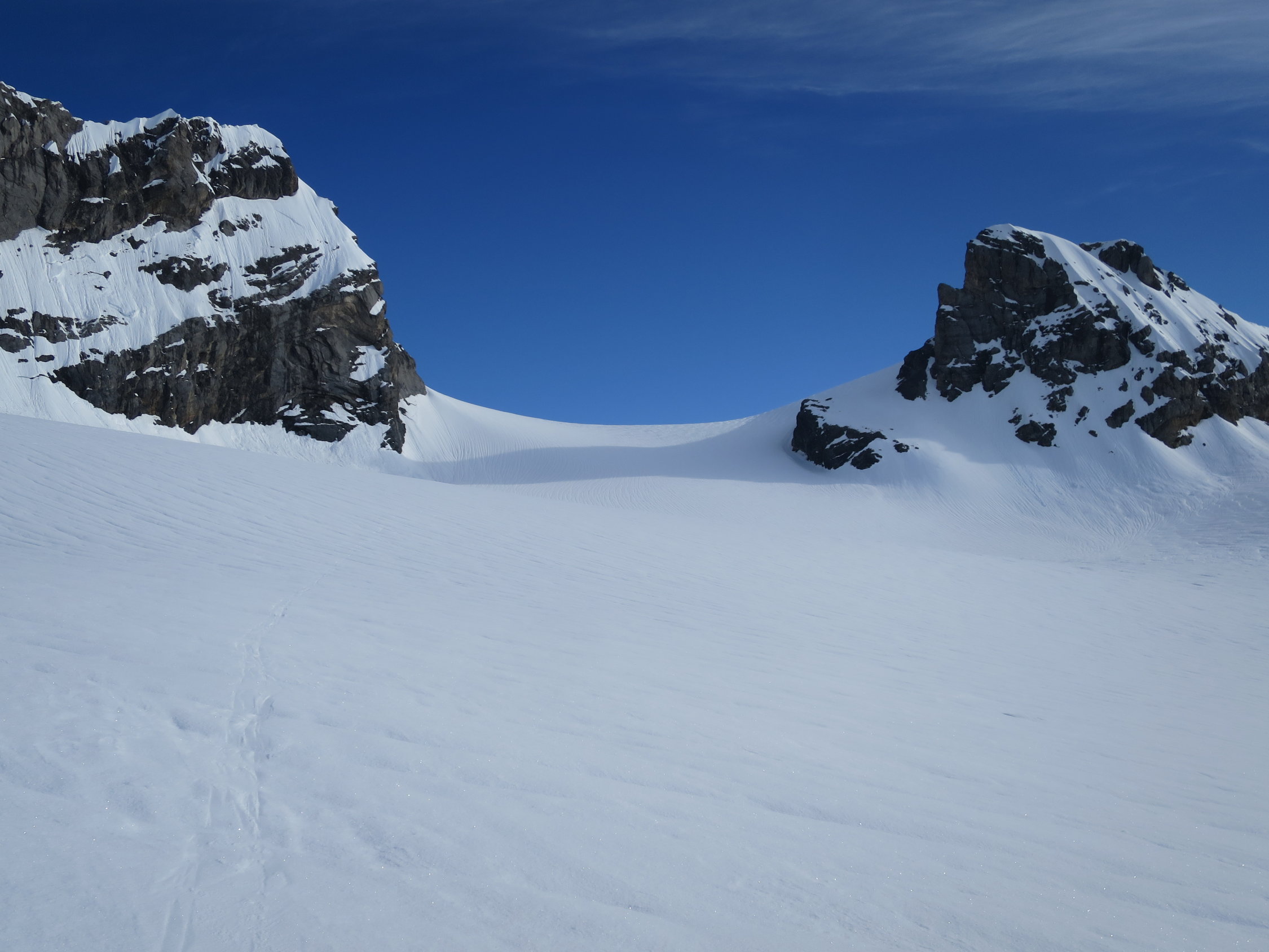 Noch viel Schnee im Gebiet, wenn er noch ein paarmal gefrieren könnte, wird es richtig gut. Die Schärhorn Nordabfahrt nach Chammli, zurzeit nicht empfehlenswert. Besser wäre diese Tour in umgekehrten Reihenfolge.