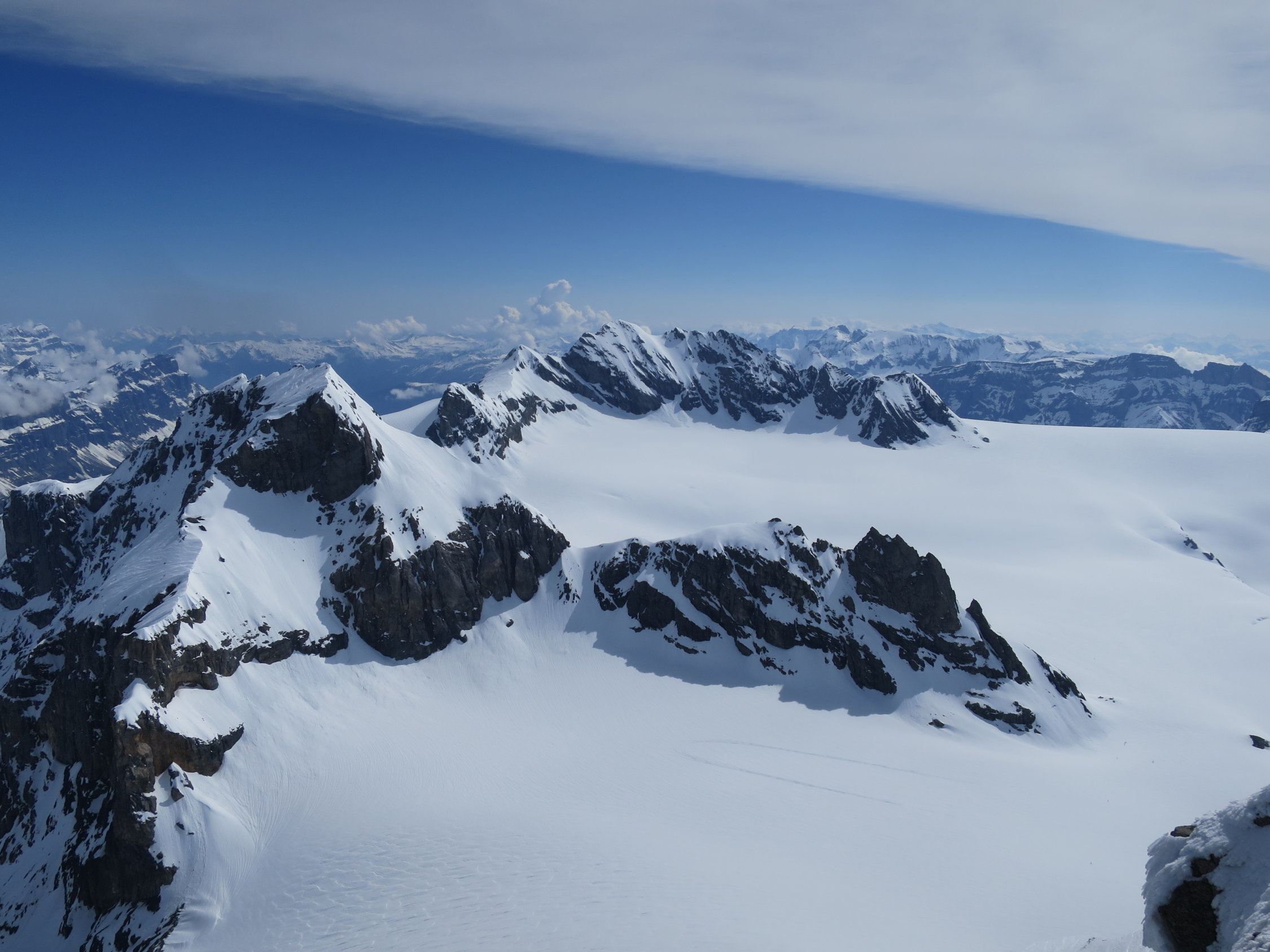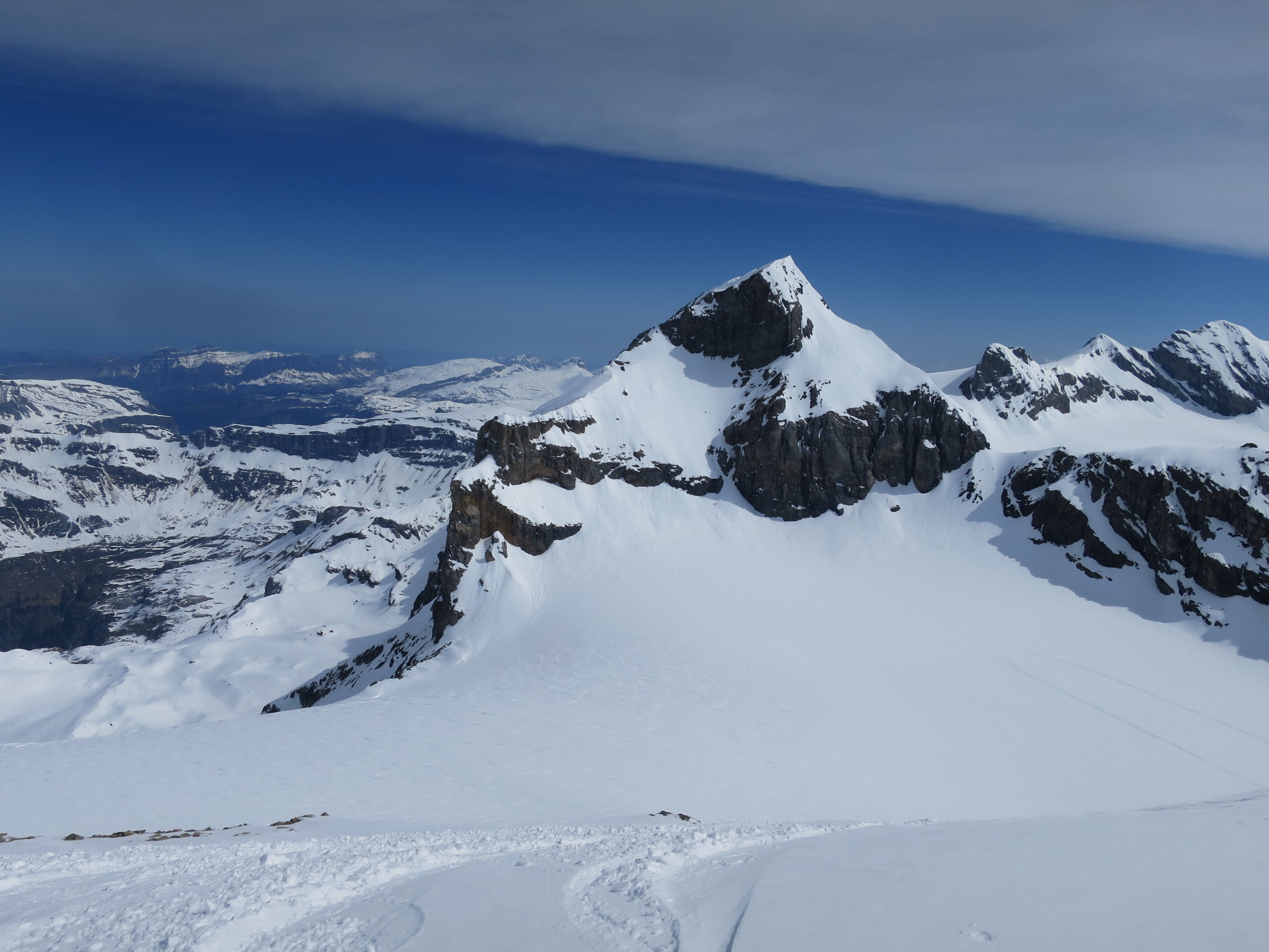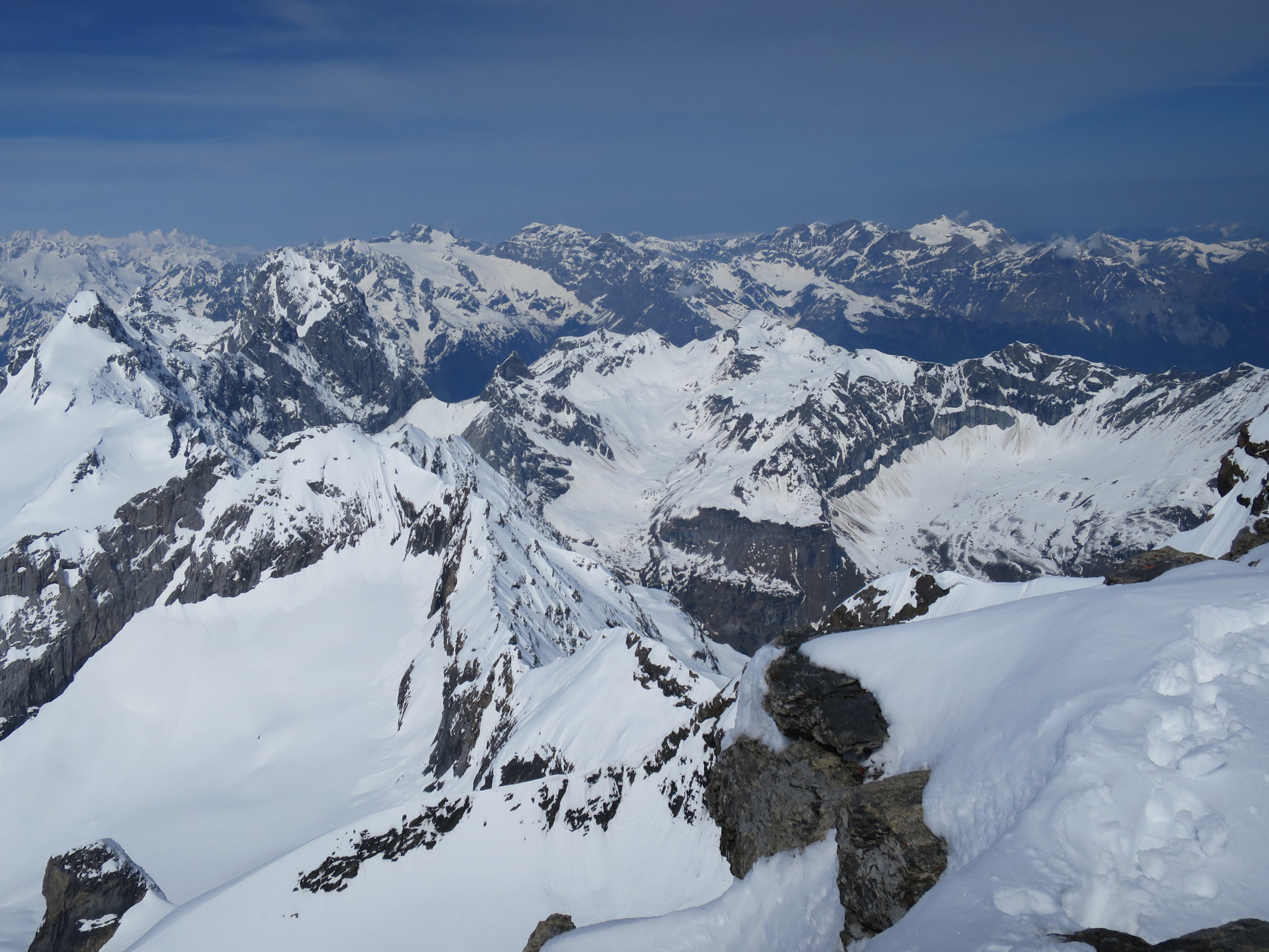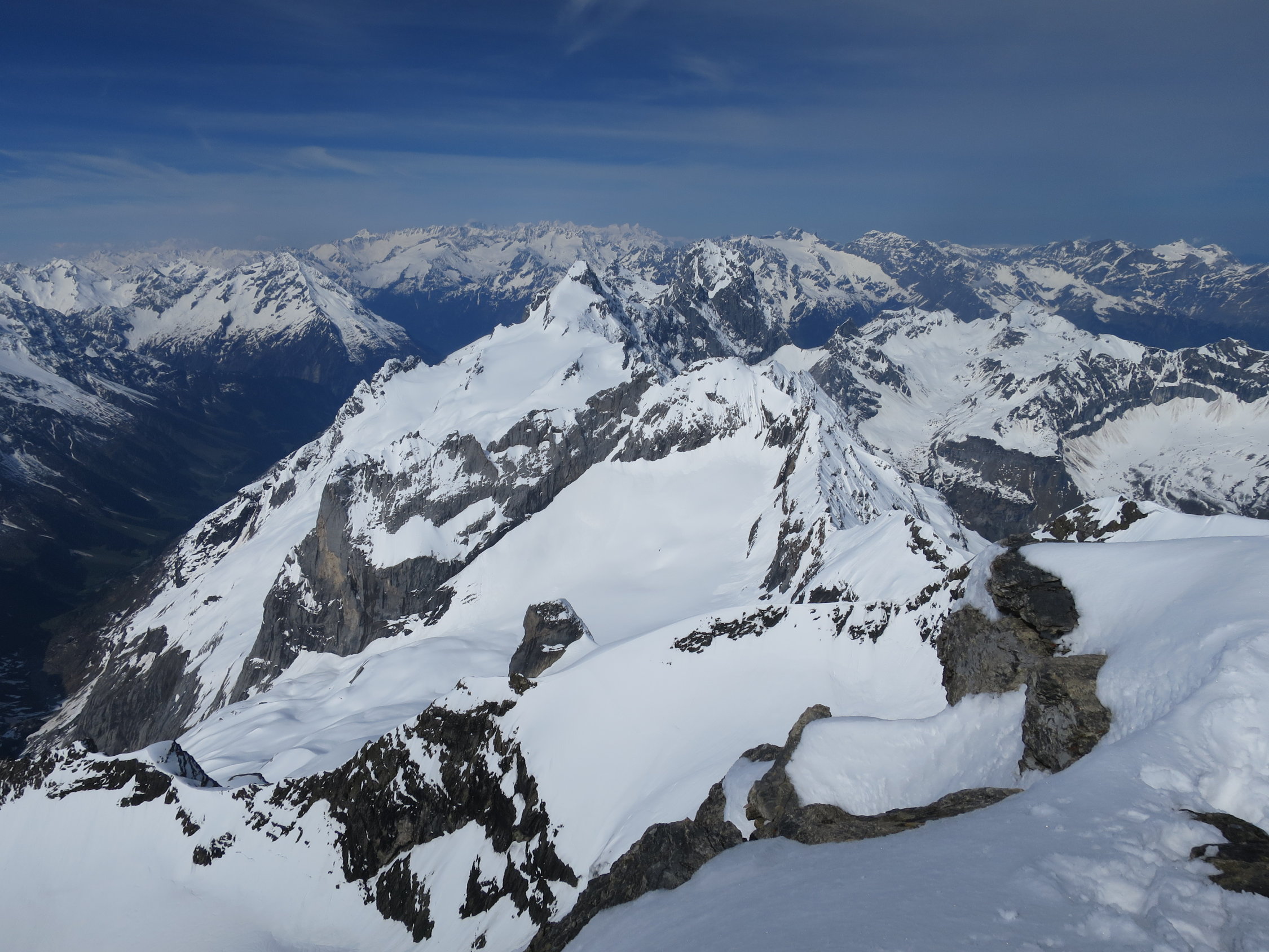 Im Fussaufstieg zum Gross Schärhorn Gipfel, tiefer pulvriger Schnee nur am Gratrand trittfest. Bei meinem Eintreffen war der grosse Rush schon vorbei, war daher eine ganze Weile mit einem waschechten Glarner solo am Gipfel. Phänomenale Fernsicht in alle Himmelsrichtungen. In der Abfahrt via Bocktschingelgrat und Chammlilücke zum Griessbödemli so alle möglichen Schneearten angetroffen. Noch einmal angefellt und in tiefem, sumpfigen Nassschnee zur Chammlialp, von dort mit viel Stockeinsatz über Chrächen zum Pass zurück.