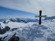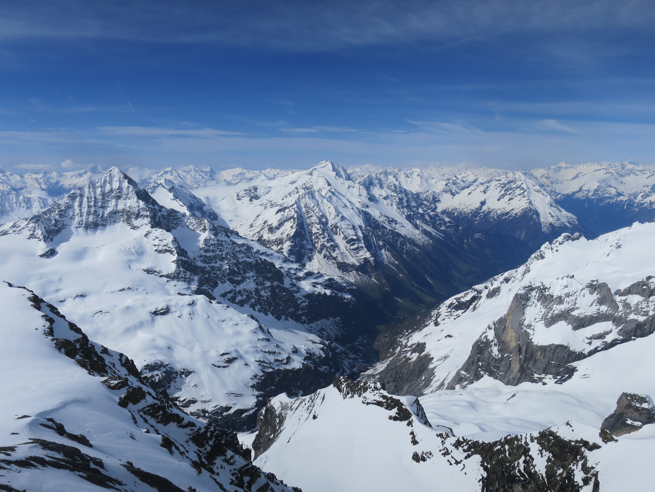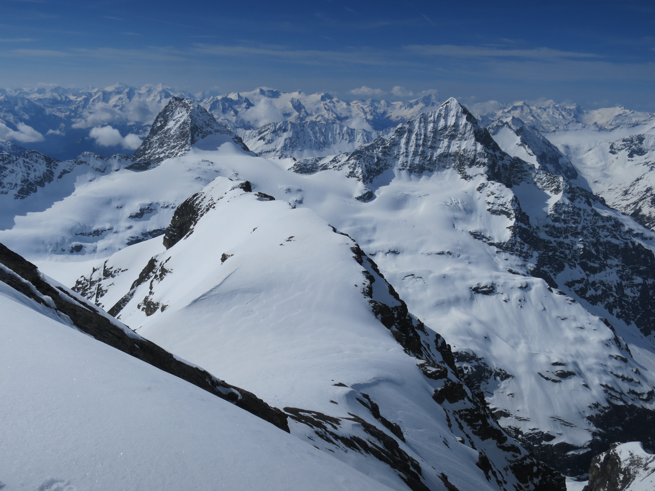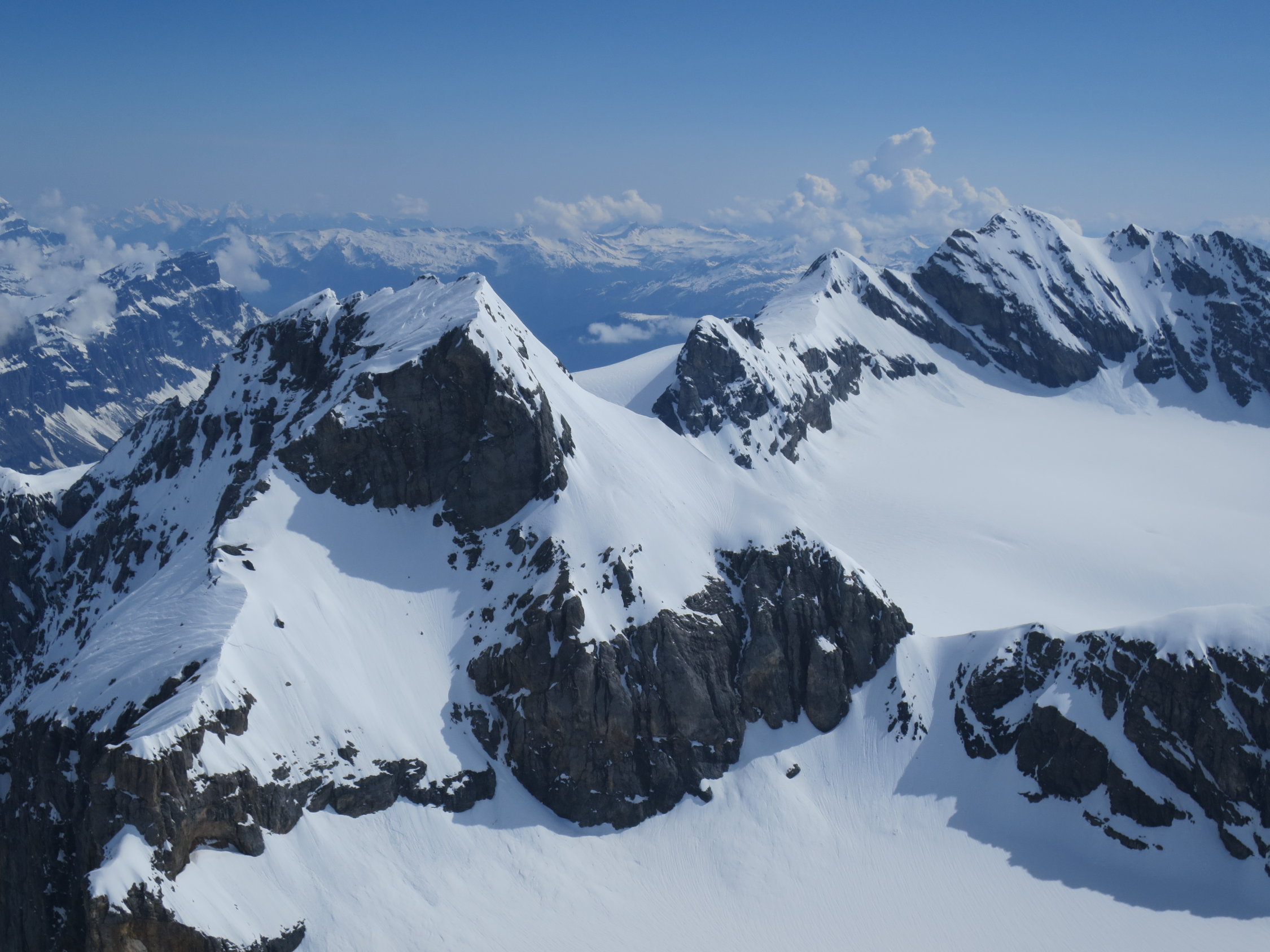 Im Fussaufstieg zum Gross Schärhorn Gipfel, tiefer pulvriger Schnee nur am Gratrand trittfest. Bei meinem Eintreffen war der grosse Rush schon vorbei, war daher eine ganze Weile mit einem waschechten Glarner solo am Gipfel. Phänomenale Fernsicht in alle Himmelsrichtungen. In der Abfahrt via Bocktschingelgrat und Chammlilücke zum Griessbödemli so alle möglichen Schneearten angetroffen. Noch einmal angefellt und in tiefem, sumpfigen Nassschnee zur Chammlialp, von dort mit viel Stockeinsatz über Chrächen zum Pass zurück.