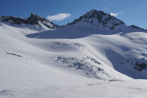 Tour derzeit nicht mehr sehr beliebt, da für Ski lange Tragestrecken und für spät aufbrechende Fußgänger Weichschneekampf, daher niemanden gesehen.
