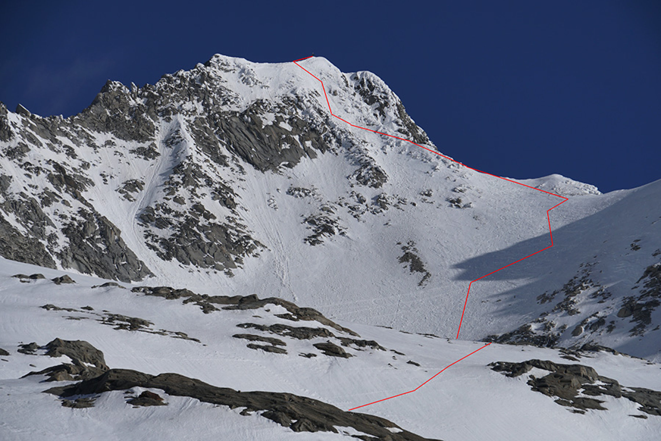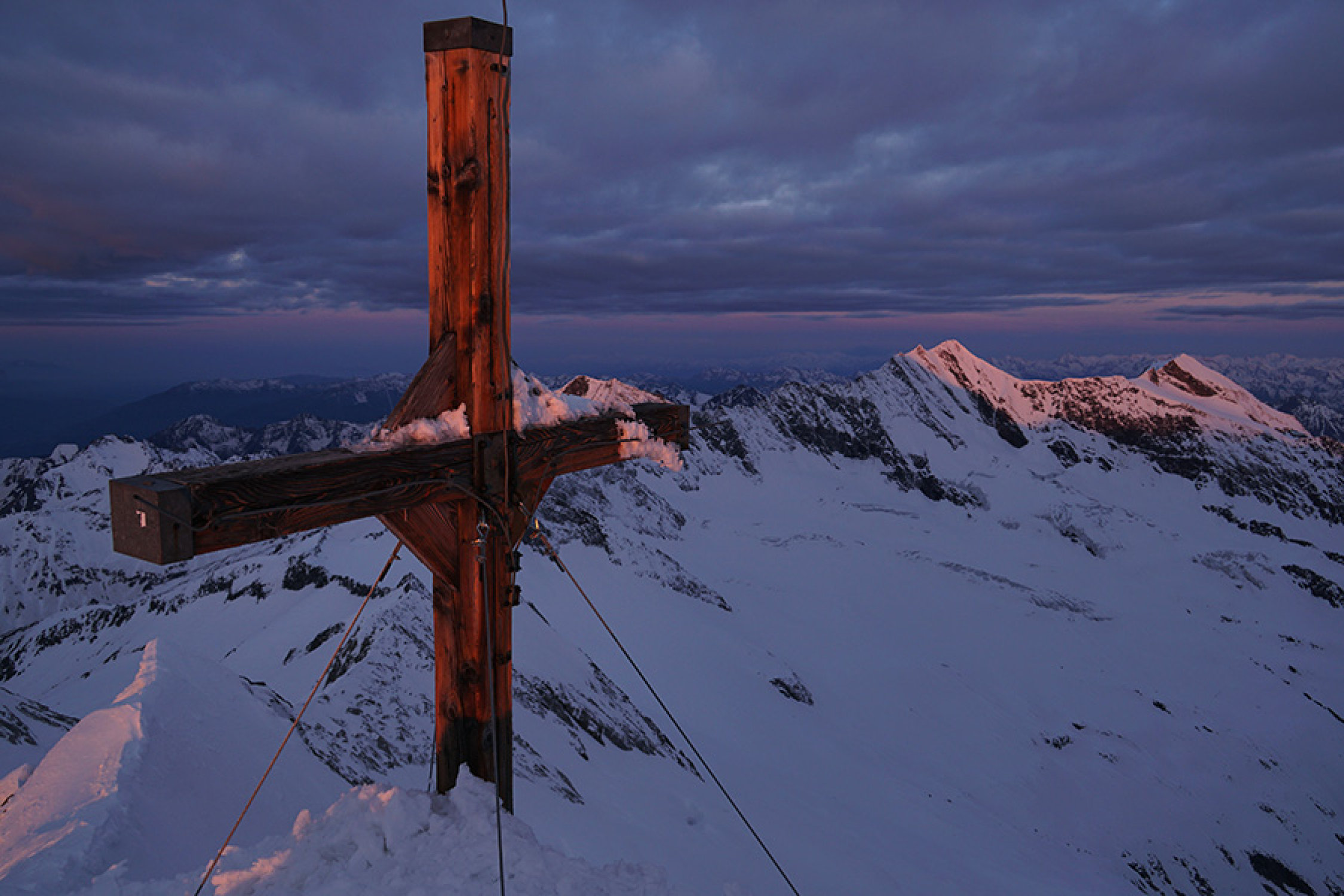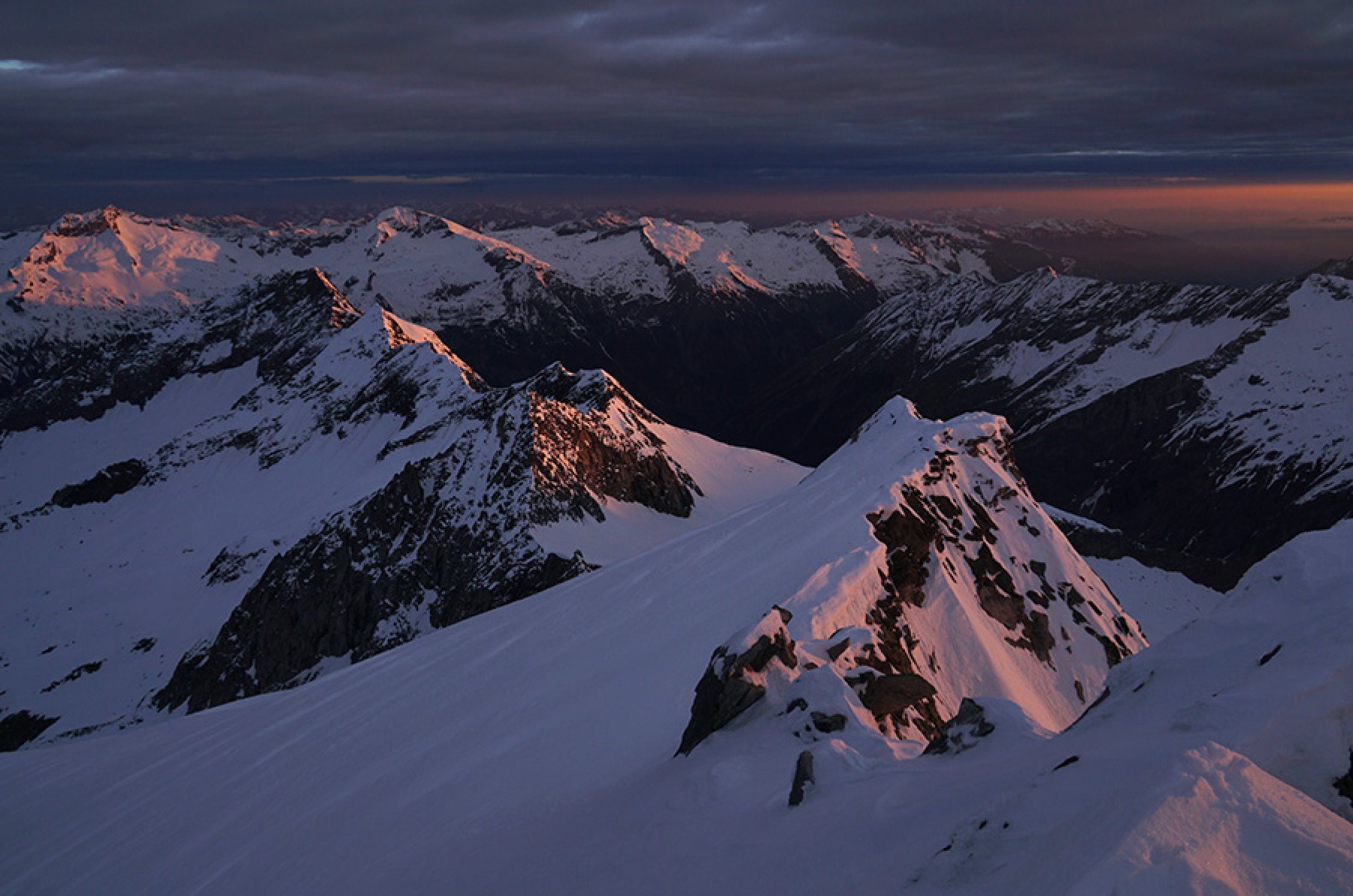 Vom Neves-See direkt nach N und um den Möselenock rechts herum. Nachtaufstieg mit Schneeschuh und zu Fuß. Zum Sonnenaufgang um 5:20h am Gipfel. Bis 2300m im wesentlichen schneefrei, drüber nicht tragender Harschdeckel, ab 2700m durchgefroren und gut tragend, Gipfelhang Trittschnee gespurt.