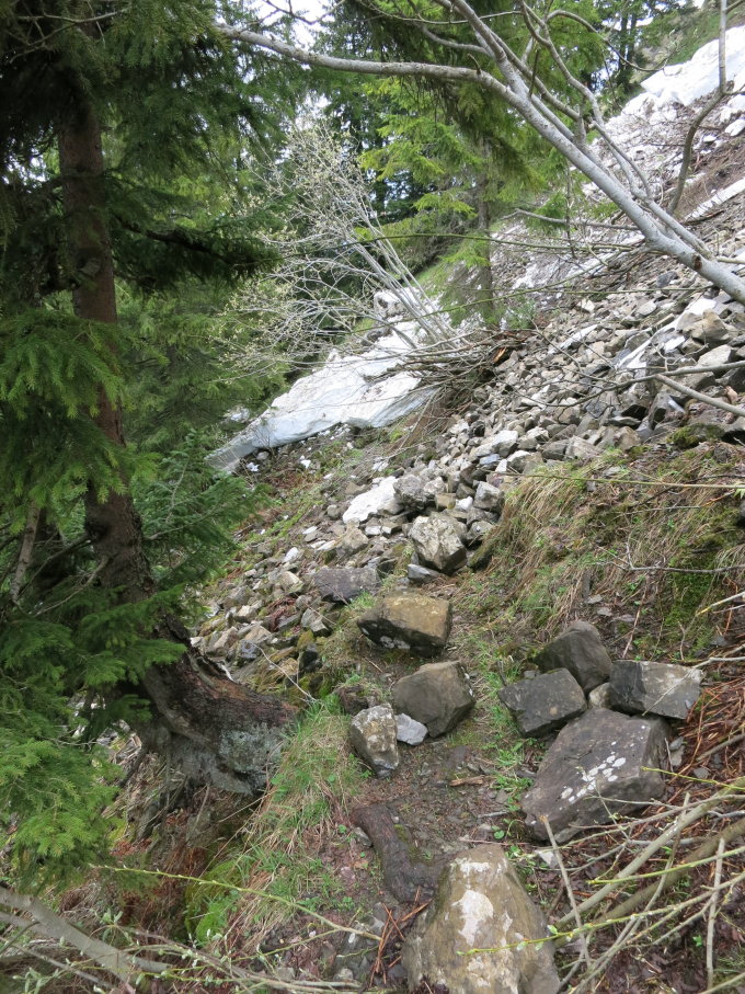 Es sind noch Spuren vom Winter zu sehen (Schneereste und Geröll). Ab ca. 1800 m sind noch kleinere Schneereste zu queren. Je nach Verhältnissen sollte man aufpassen (oder wenn es gefriert Grödel oder Steigeisen zur Sicherheit mit dabei haben).