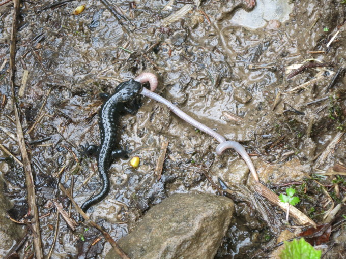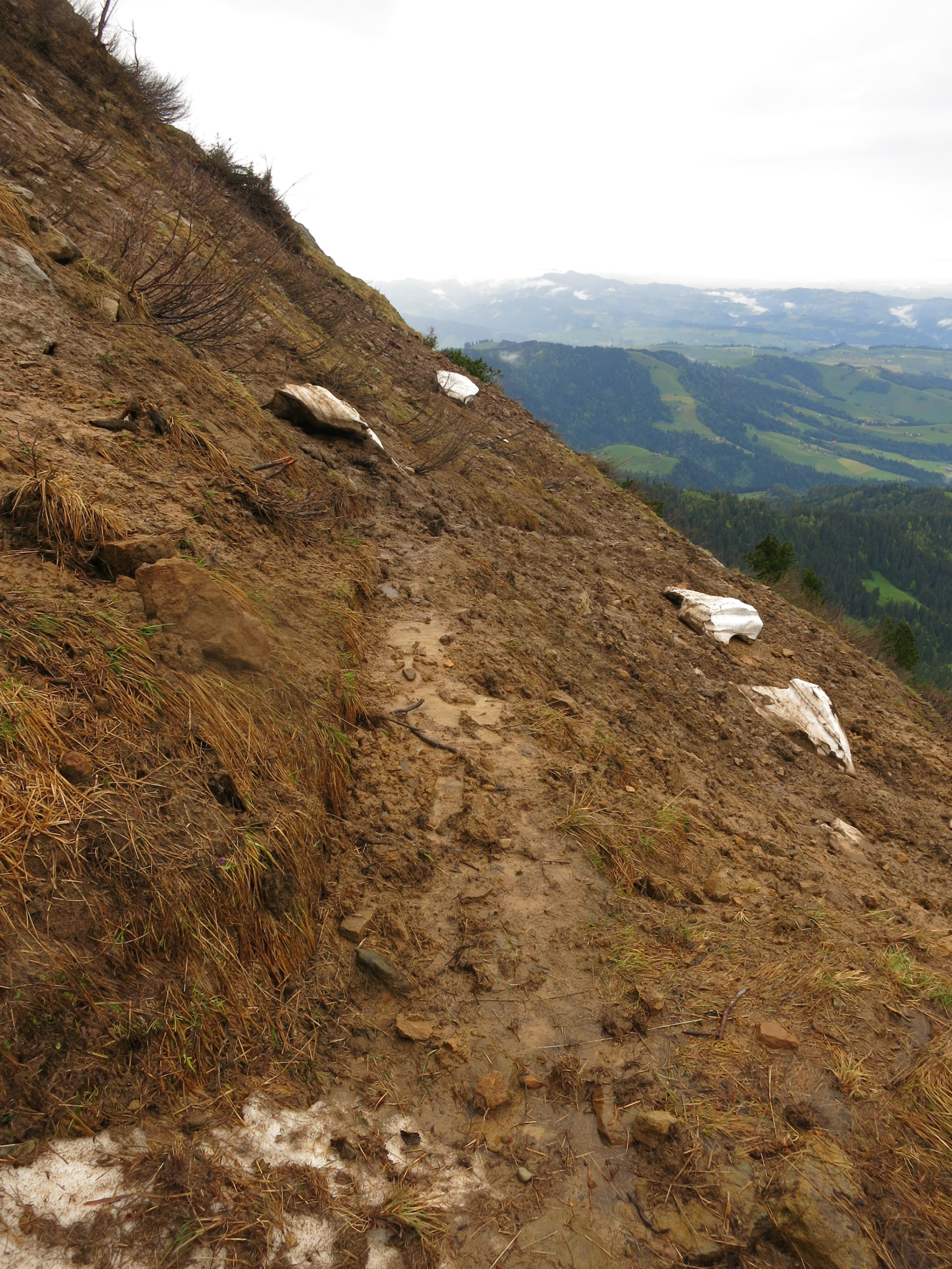 Danach folgt eine Querung im Matsch. Der Winter hat Spuren hinterlassen.