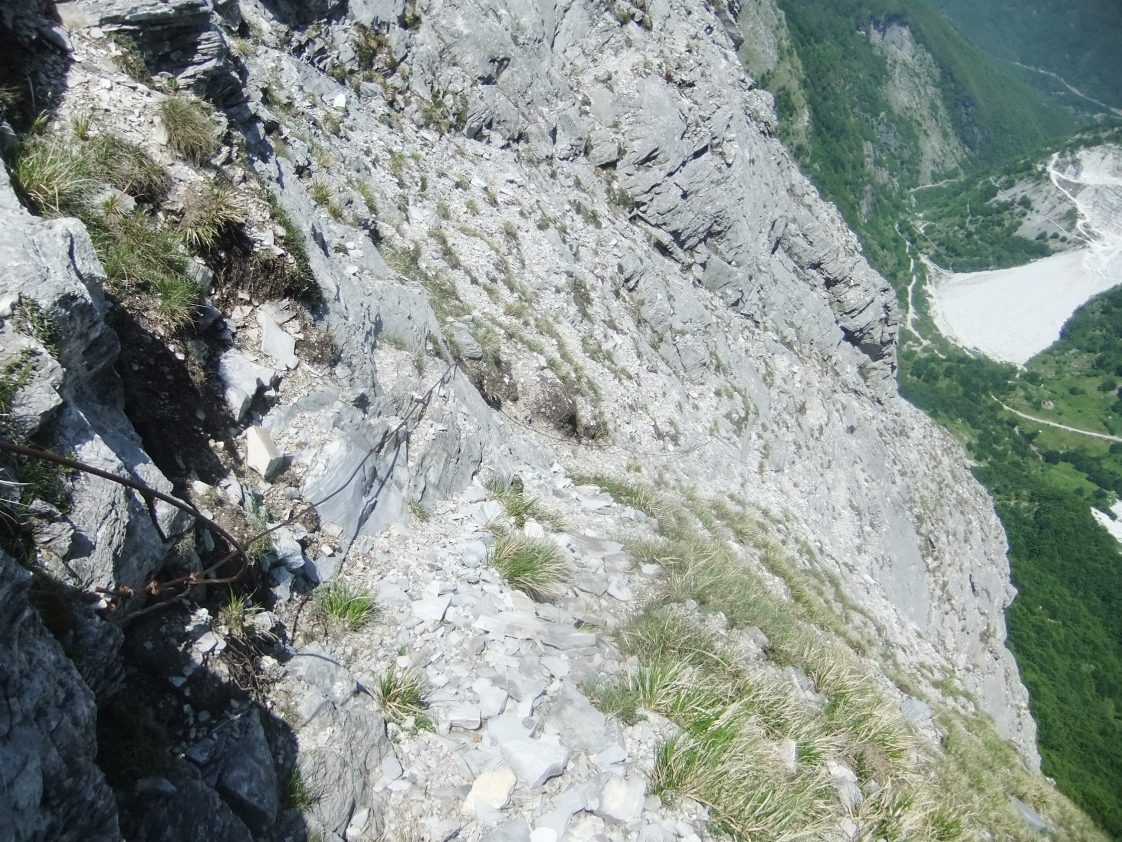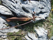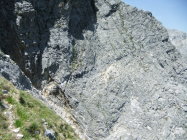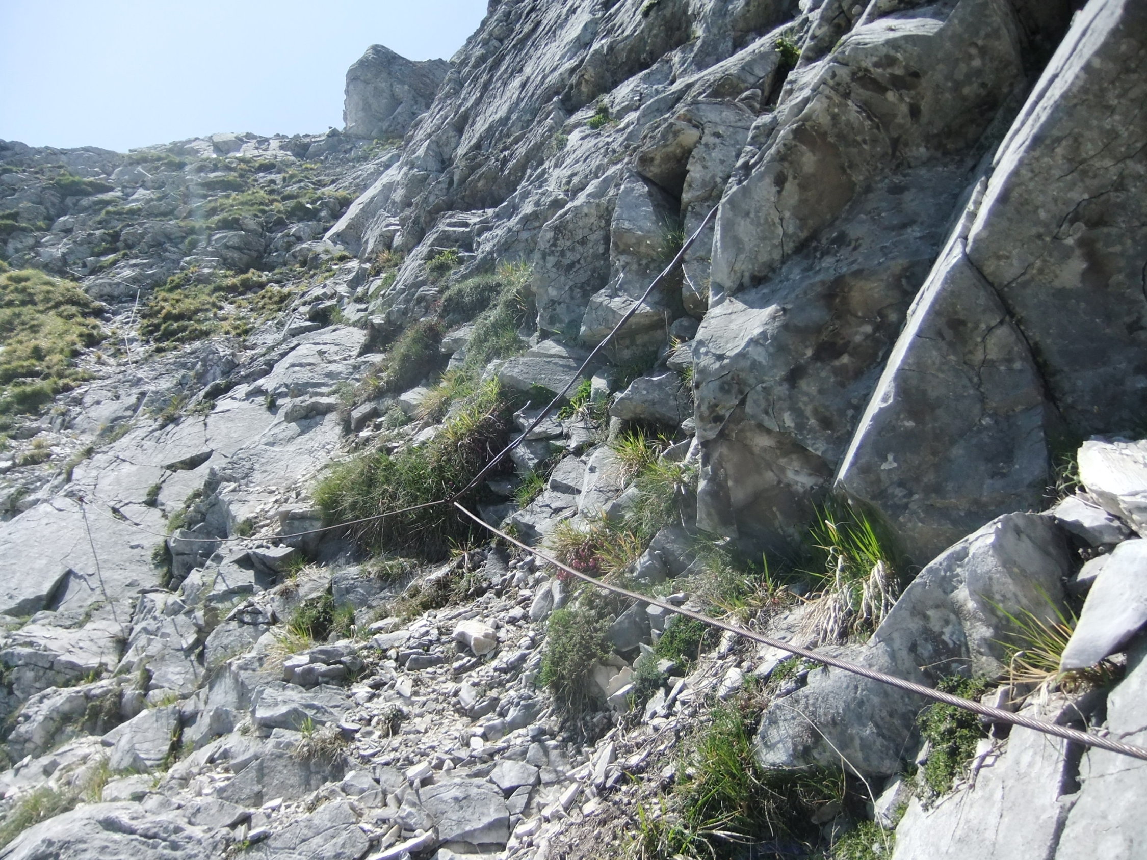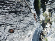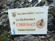 Der schnee- u. gerölllawinenanfällige Steig ist allerdings seit Jahren natürlicher Zerstörung preisgegeben. Die Hälfte der Fixpunkte ist abgebrochen, viele Seilpassagen in der Ostflanke des Monte Sella sind gerissen. Die Sperrschilder sind auch schon ausgeblichen und etwas verrottet.