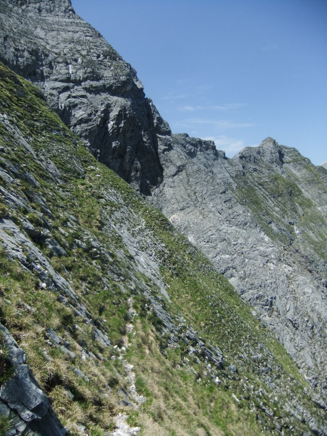 Versuch, nach der Ferrata R. Malfatti den Mte. Sella zu umrunden. Tour habe ich abgebrochen und bin umgedreht vor erster Ostrinne, da die schräge Flanke inzwischen steineübersäht ist. Keine aktuellen Trittspuren mehr erkennbar.