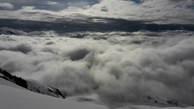 Start der Tour am 6.45 Uhr beim Furkapass, bei einer Temperatur von + 3 Grad, schon bald aber eintauchen in den Nebel, auf einer Höhe von 2700 Meter dann schönes Wetter bis zum Gipfel, mit schönen Tiefblicken auf das Wolkenmeer, der Aufstieg war heute mit den Skiern bis zum Gipfelkreuz gut machbar.