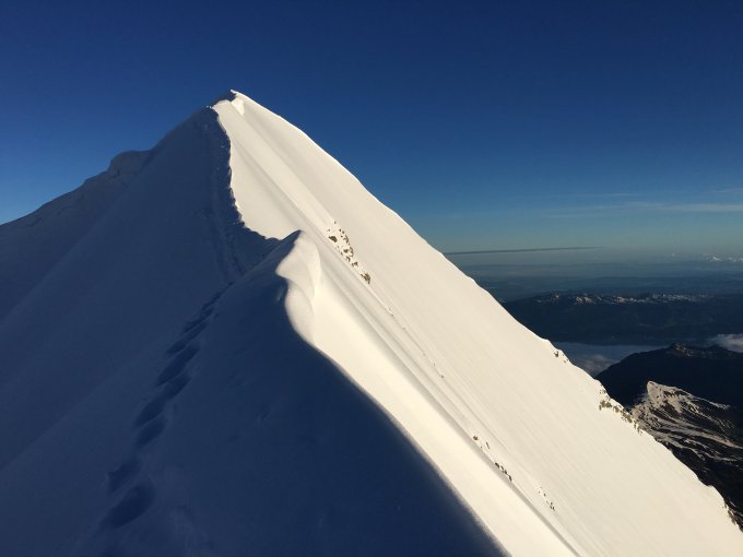 07.00: NE-Flanke direkt vom Gipfel. Perfekter Firn. Schrunde gut zu überspringen.