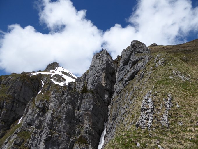 Gute Verhältnisse in diesem schönen, relativ kurzen Klettersteig (siehe Routenbeschreibung). Im Zustieg im flachen Gelände kleine Schneefelder, die aber nicht stören und bald ganz verschwinden werden. Fels trocken, was vor allem deswegen günstig ist, weil nicht alles "vernagelt" ist, und man öfters (v.a. im unteren Teil) auch Tritte und Griffe im Fels zu benützen hat. Auch der (bei Nässe heikle) Abstieg war trocken und schneefrei. Und das Wetter hielt prächtig, bis am frühen Nachmittag zeitweise Nebelschwaden aufzogen. Im Clariden-/Scherhorngebiet sah es – mindestens aus Distanz – schon am Morgen weniger gut aus.