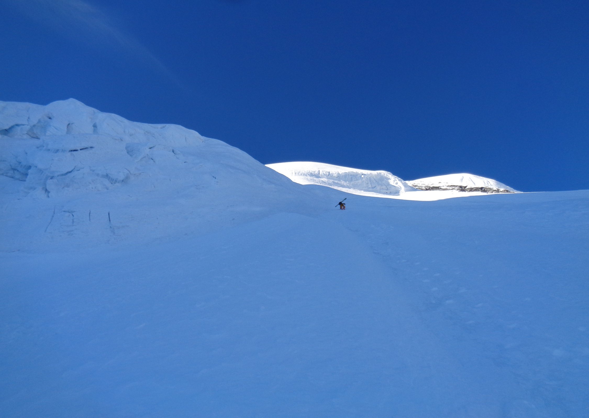 Nahezu perfekte Verhältnisse auf der ganzen Tour. Beim Start im Bundläger um ca. 4h nur kurz Skis tragen müssen, dann auf tragend gefrorener Oberfläche via Hütte zum Einstieg der Wand. Wir haben eine Aufstiegsroute weiter links in der Wand gewählt und gelangten über den Ostgrat zum Gipfel. In der Abfahrt 5-20cm Pulverauflage auf stellenweise hartem, aber nicht eisigem Untergrund. Einige kleine Triebschneeplatten losgetreten. Unten raus meist schön angesulzt.