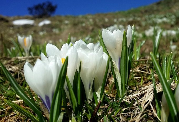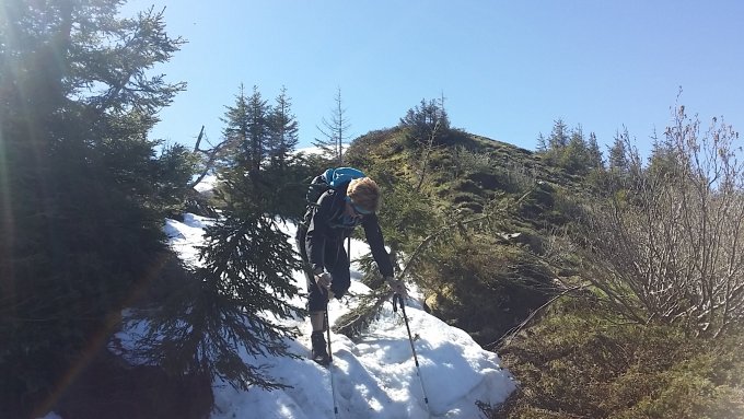 Strahlend blauer Himmel, um die 11 Grad beim Start. Trotz des Regenwetters der letzten Zeit war es keine Sumpftour. Am Nordwestgrat vom Elsenkopf lag noch Schnee, der nach der kühlen Nacht alles andere als gut trittig war.