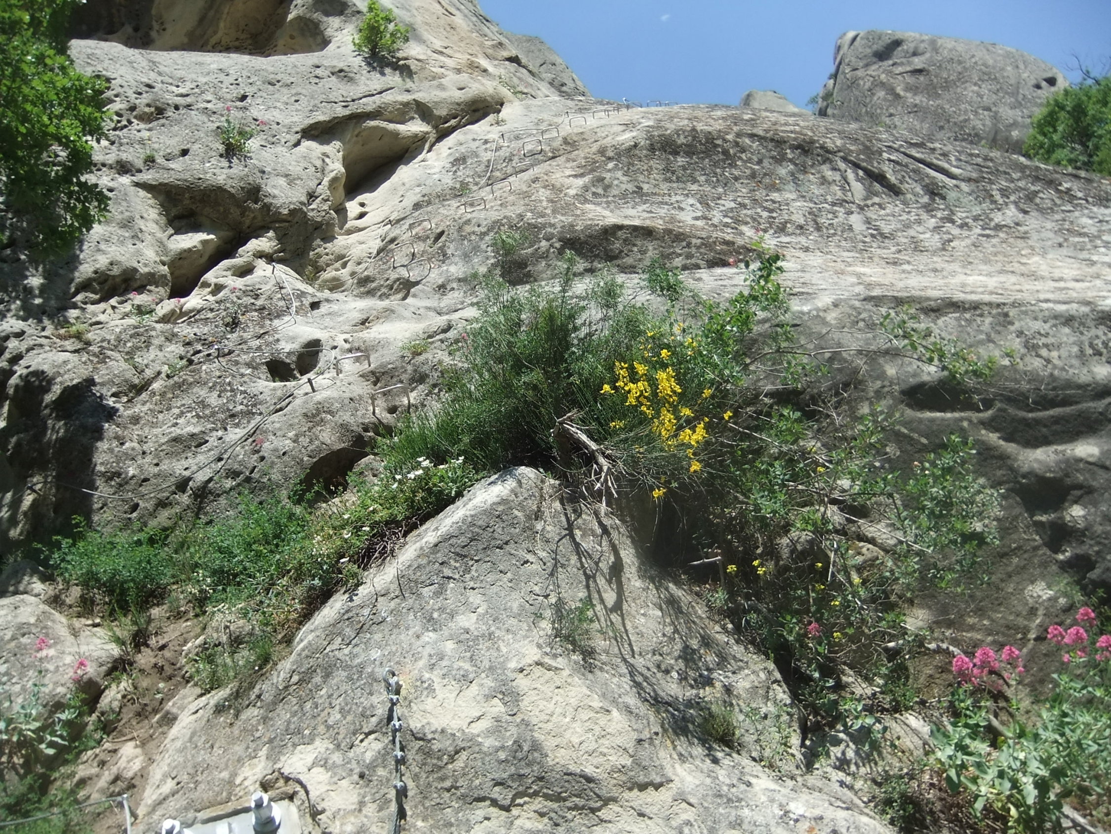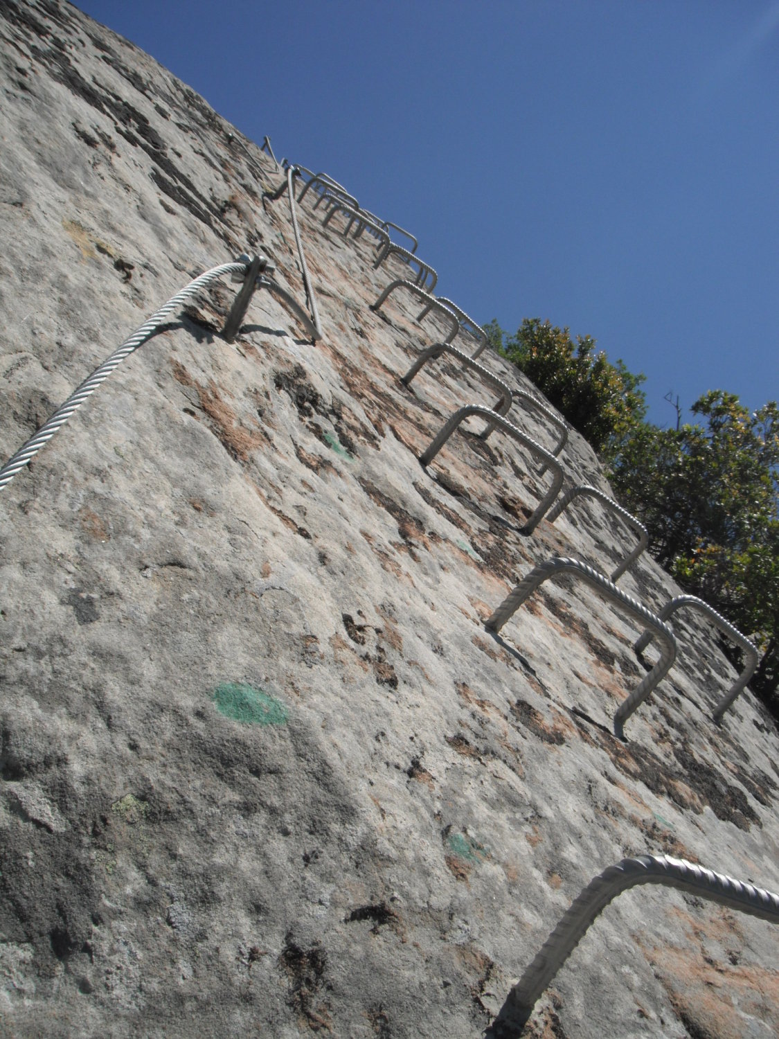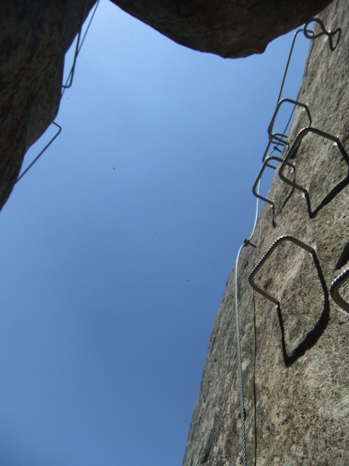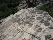 Ungewohnt sind im Klettersteig die langen verlegten Schlaufen des Sicherungsseils zwischen den Fixpunkten. Kann damit zu tun haben, daß so einfach eine Art Karabinerbruchsicherung realisiert wird. Oder um Ausdehnungsspannungen zu vermeiden bei den starken Temperaturunterschieden zwischen Sommermittagen und Winternächten, wenn das Seil straff fixiert wäre.