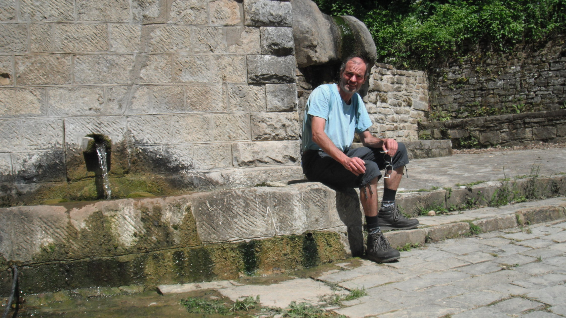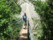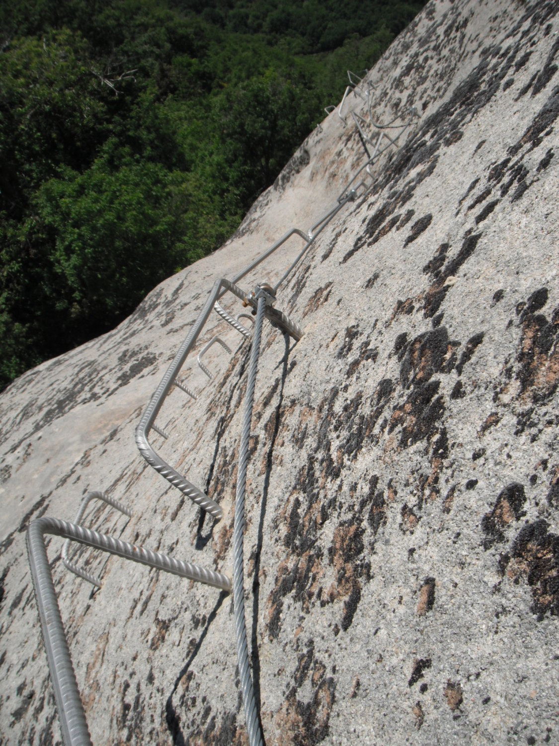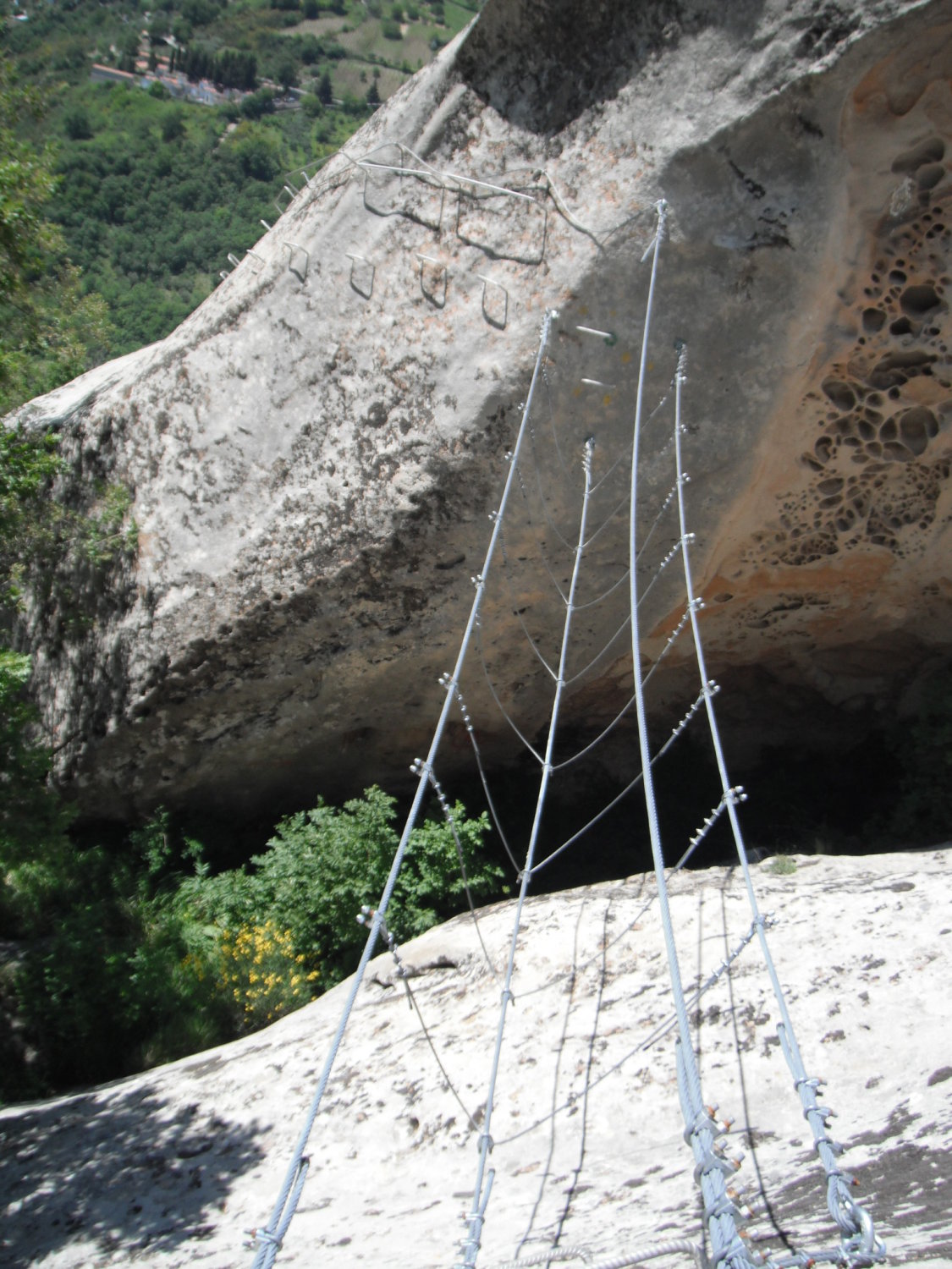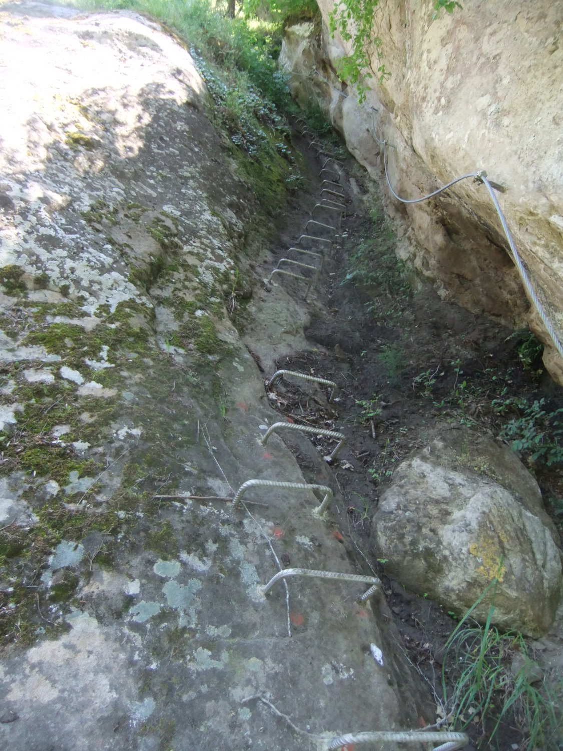 Ungewohnt sind im Klettersteig die langen verlegten Schlaufen des Sicherungsseils zwischen den Fixpunkten. Kann damit zu tun haben, daß so einfach eine Art Karabinerbruchsicherung realisiert wird. Oder um Ausdehnungsspannungen zu vermeiden bei den starken Temperaturunterschieden zwischen Sommermittagen und Winternächten, wenn das Seil straff fixiert wäre.