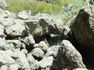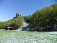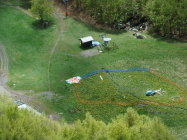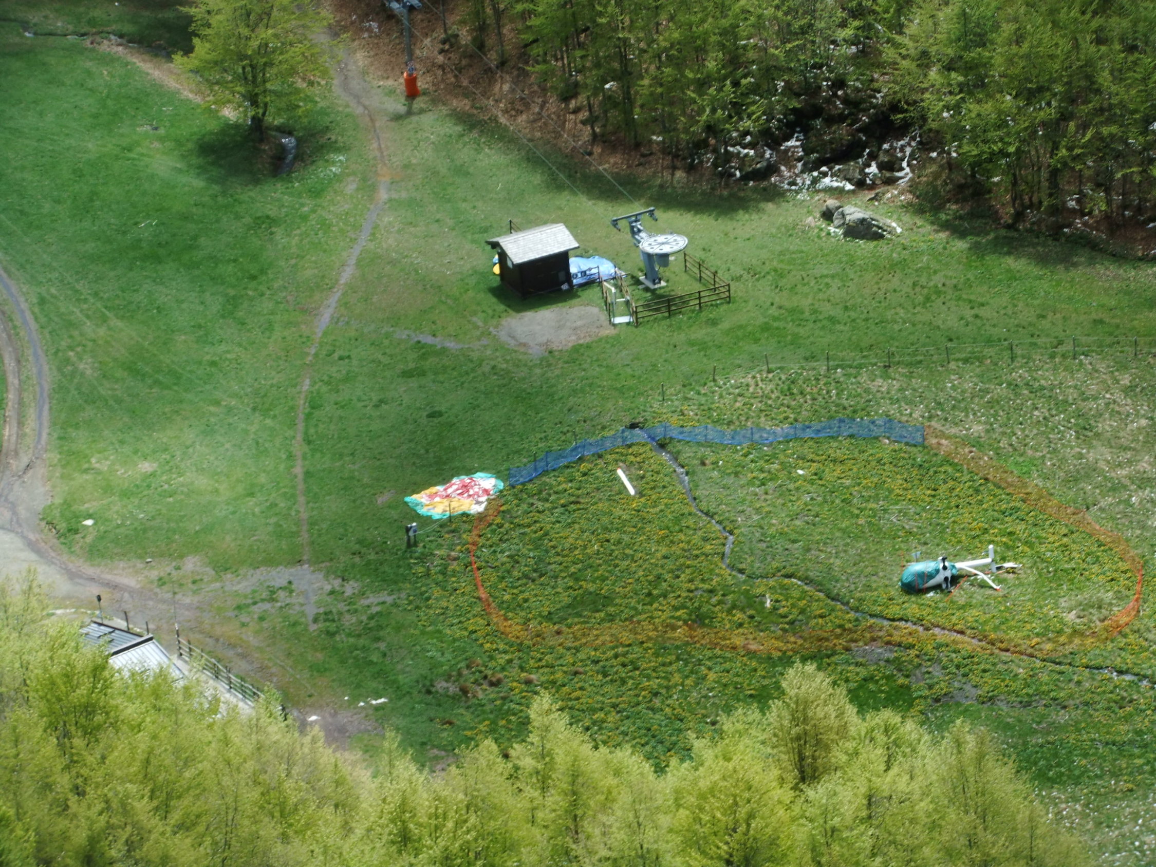 Vor der Hütte am Prato della Cipolla liegt abgedecktes Wrack abgestürzten Helikopters I-C169.