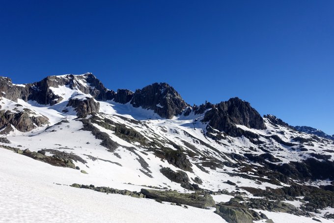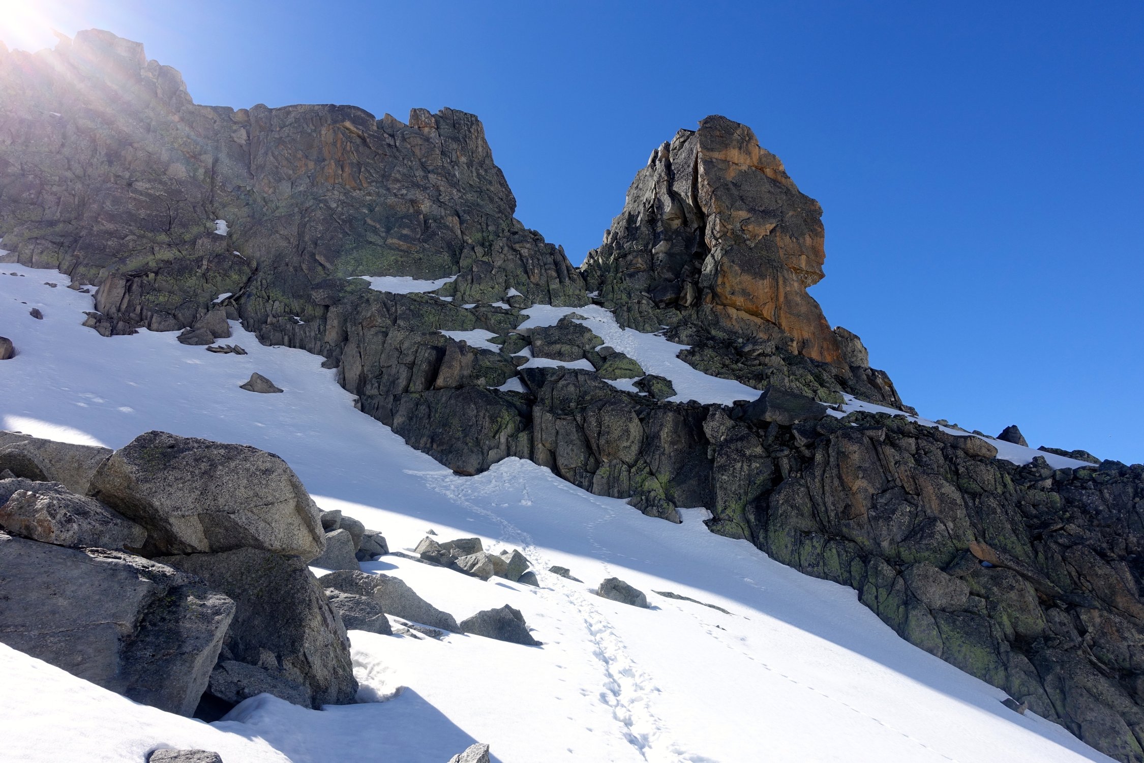 Der Abstieg via untere Bielenlücke zurück liegt alles noch im Schnee, geht aber ohne jegliche Schwierigkeiten. Aufgrund der sehr warmen Temperaturen ist hier ein tiefes Versinken im Schnee garantiert....