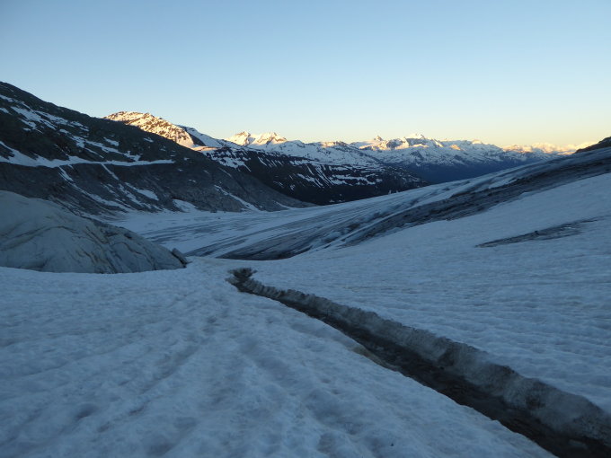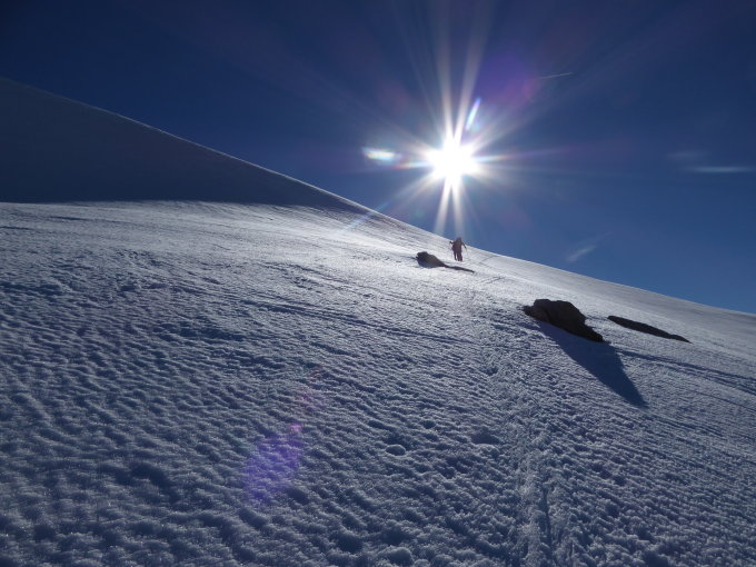 Herrliches Wetter gefrorener Schnee und gut eingeschneiter Gletscher.