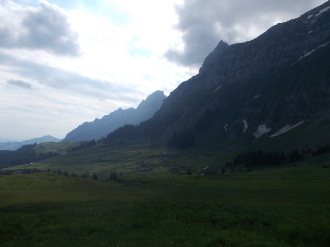 Wetterkonditionen: sehr warm. Die Einstrahlung der Sonne blieb aber wegen Wolkenaufzugs eingeschränkt, weshalb die Schneefelder glücklicherweise nicht vollkommen aufweichten. Auf dem Gipfel ob des Gewölks nur beschränkte Fernsicht. Als ich bereits auf der Meglisalp unten war, grollte es kurz mal am Säntisgipfel, das Wetter beruhigte sich aber anschließend wieder.