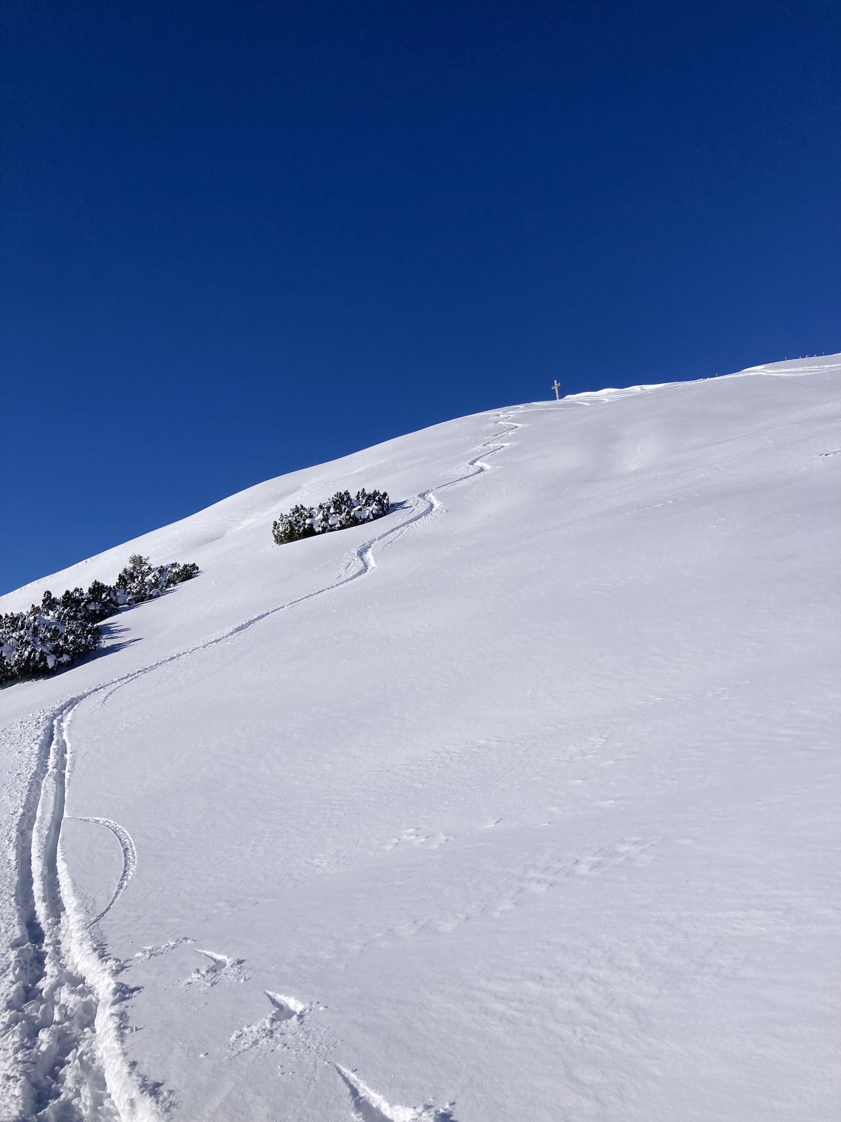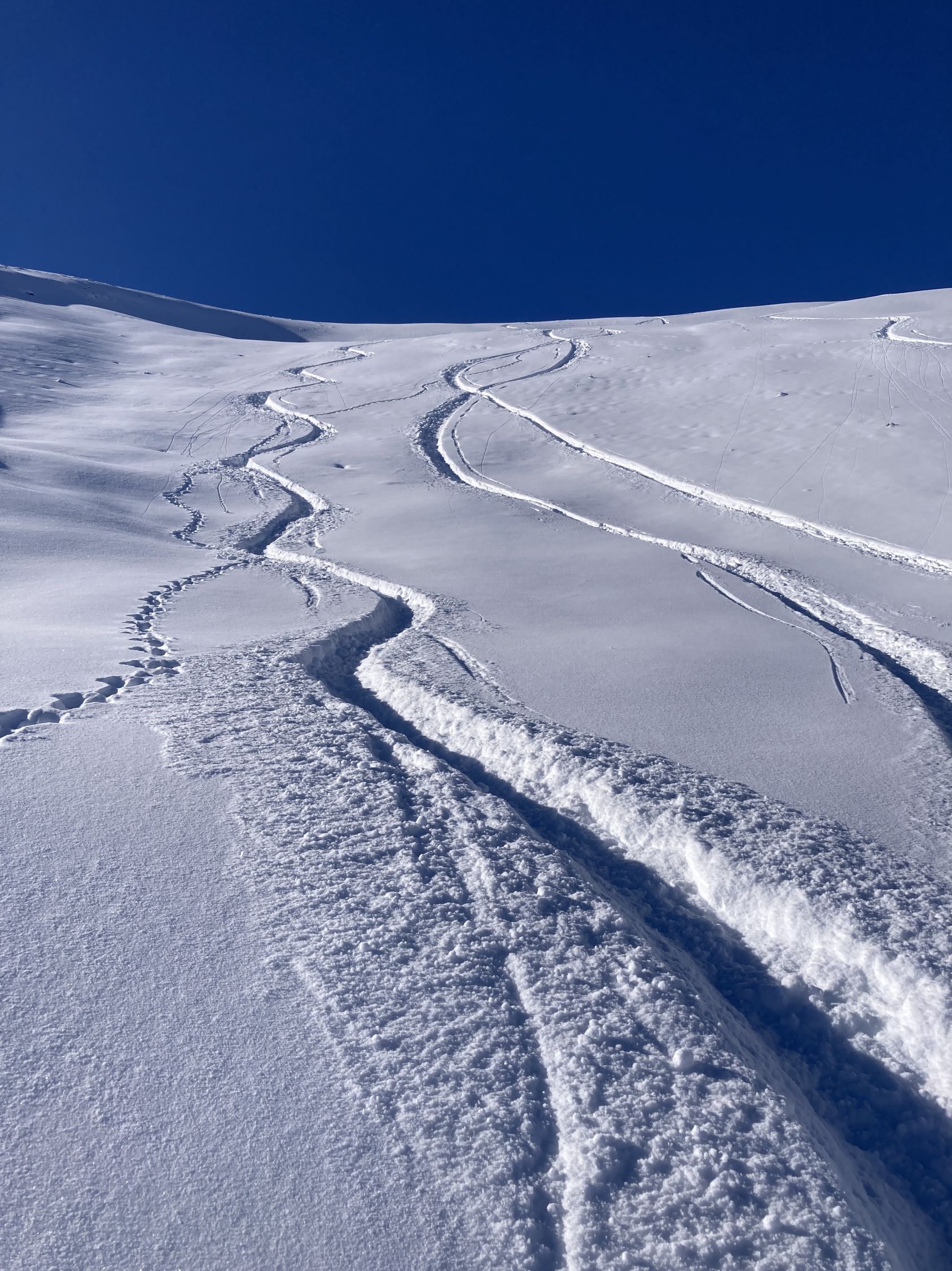 Gipfel und Bleika super zu fahren. Wenig Bodenkontakt. Die Querung nach Bleika hat zuwenig Schnee. Viel Steinkontakt. Bin daher danach direkt zu Guschg rüber.