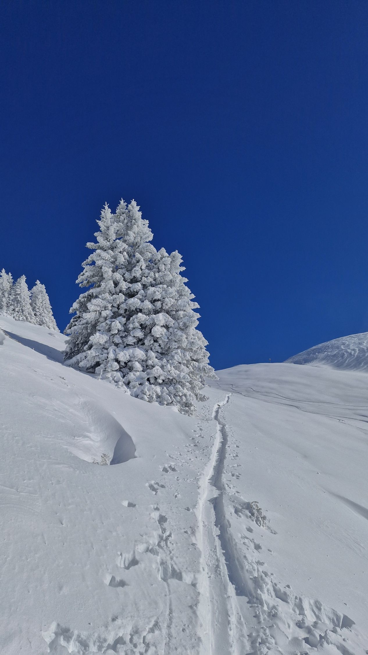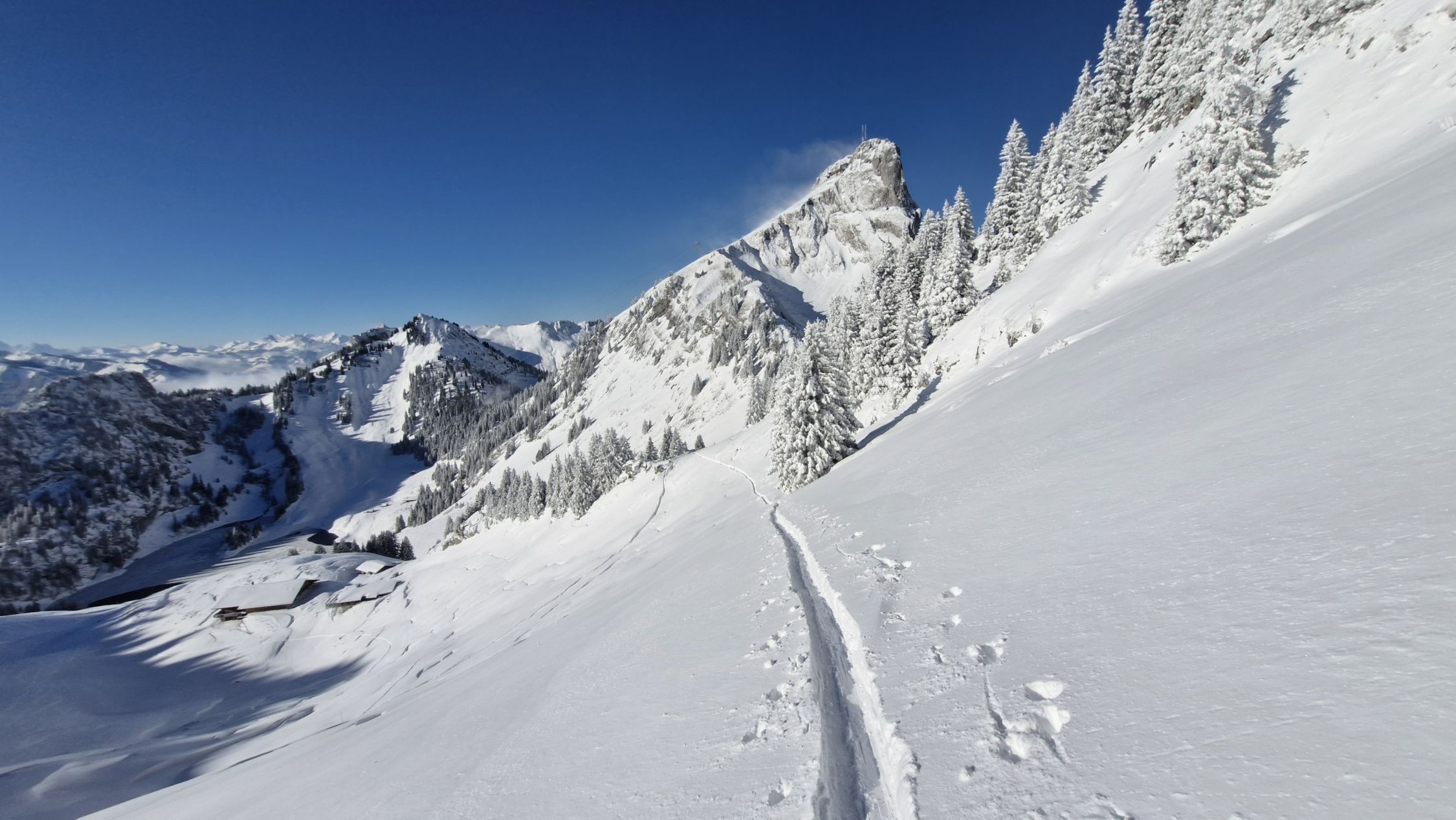 Um Chrindi ca. 30-40cm ohne Unterlage, ab Oberbärgli (1795müm) deutlich mehr. In den Mulden bodenloser Powder, herrlich! Im Gipfelbereich stark verblasen.