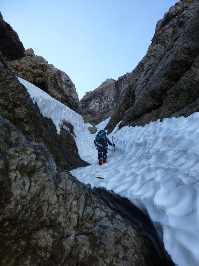 Die Graskraxelei bis zum Knorren braucht ein bisschen Spürsinn für die Routenwahl ist aber logisch: immer dem Weg des gerinsten Widerstandes folgen. Wenn es schwierig wird ist man falsch. Die starken Regenfälle im Juni haben Spuren im Schnee hinterlassen: Es hat richtig tiefe (ca. 2 m?) Gräben in den Rinnen gegeben. Den Klemmblock haben wir ca. 5m tiefer auf der rechten (in Aufstiegsrichtung) Seite im Fels umgangen.