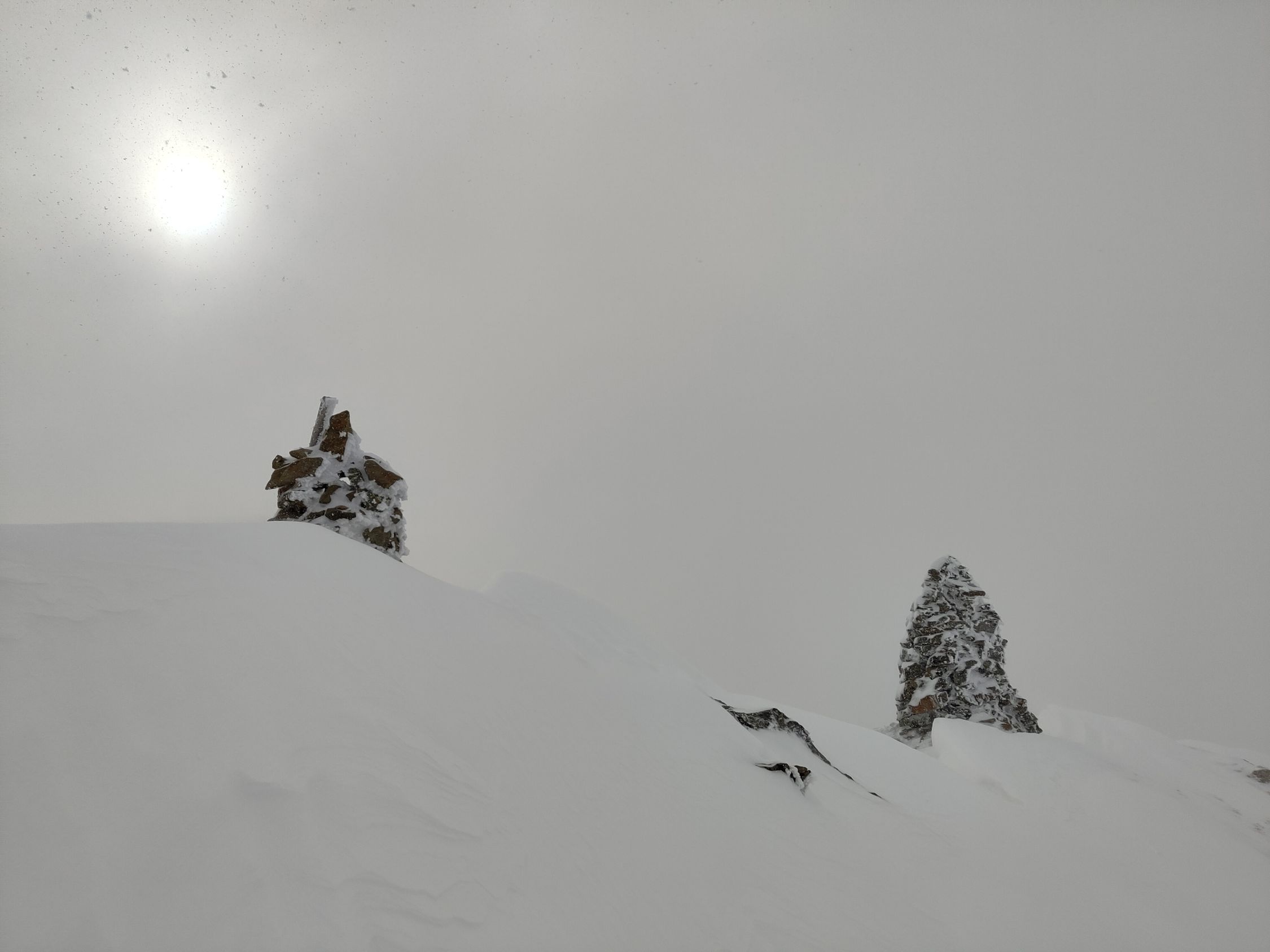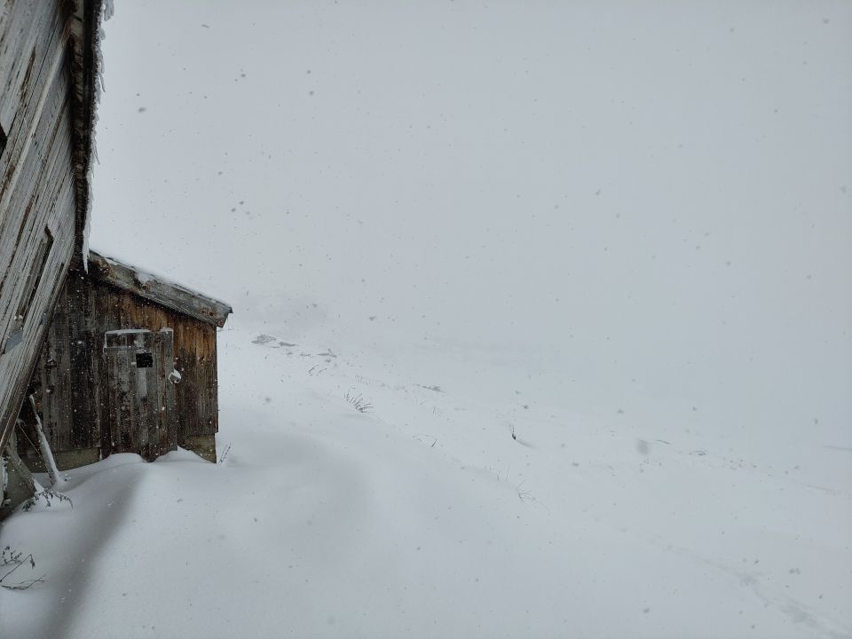 Schneefall und Wind. Sichtweite wechselhaft 100-500m.