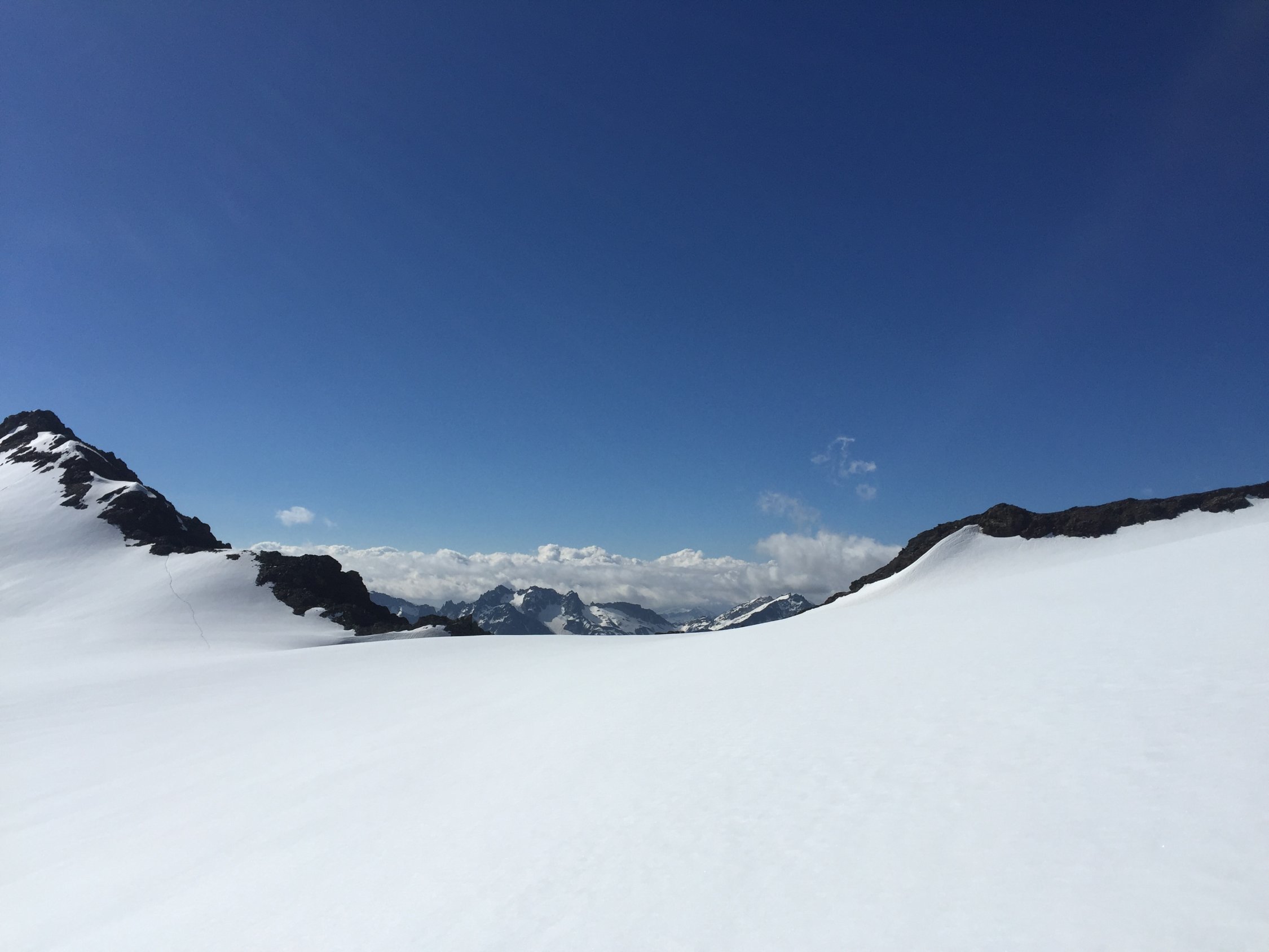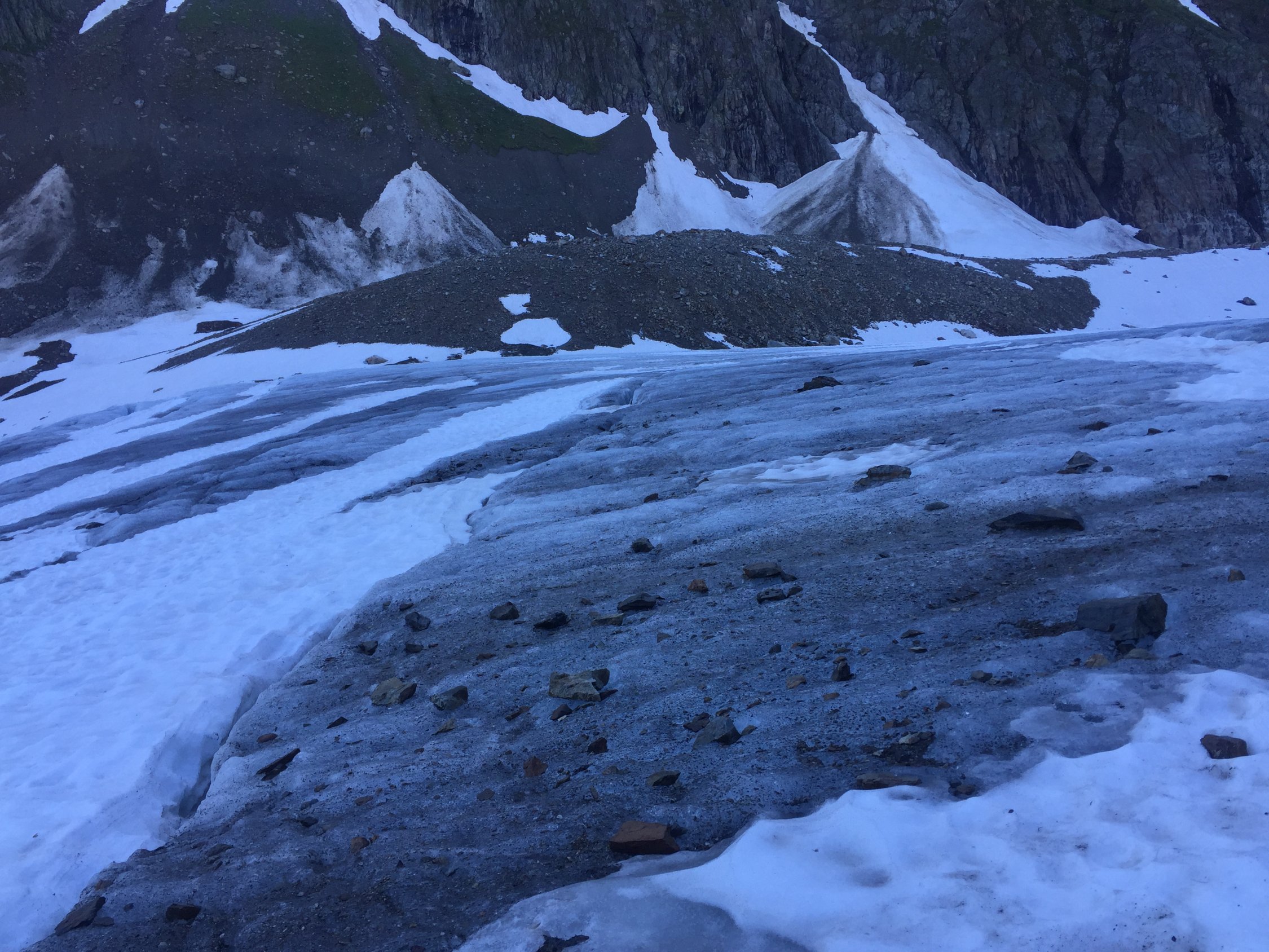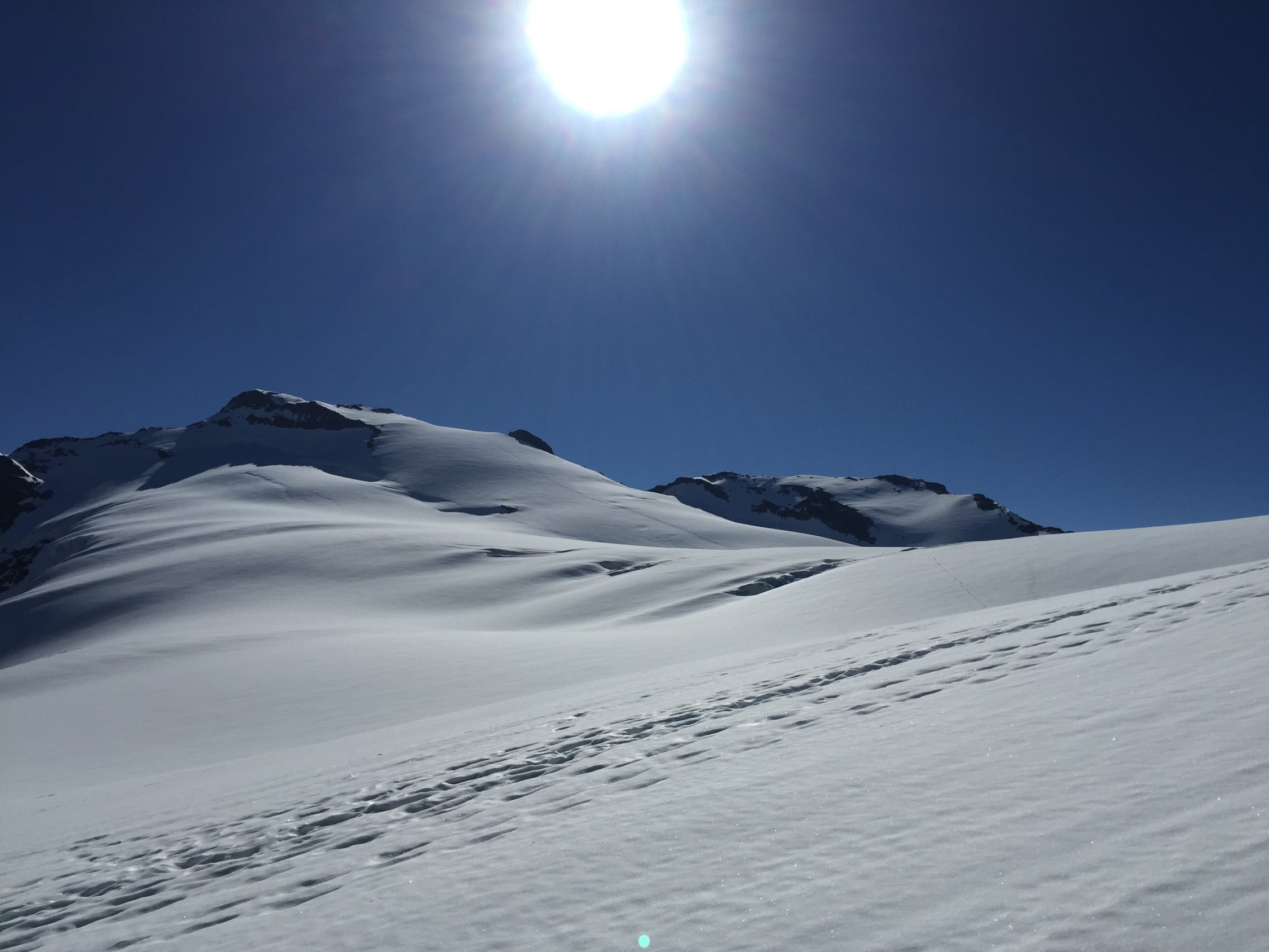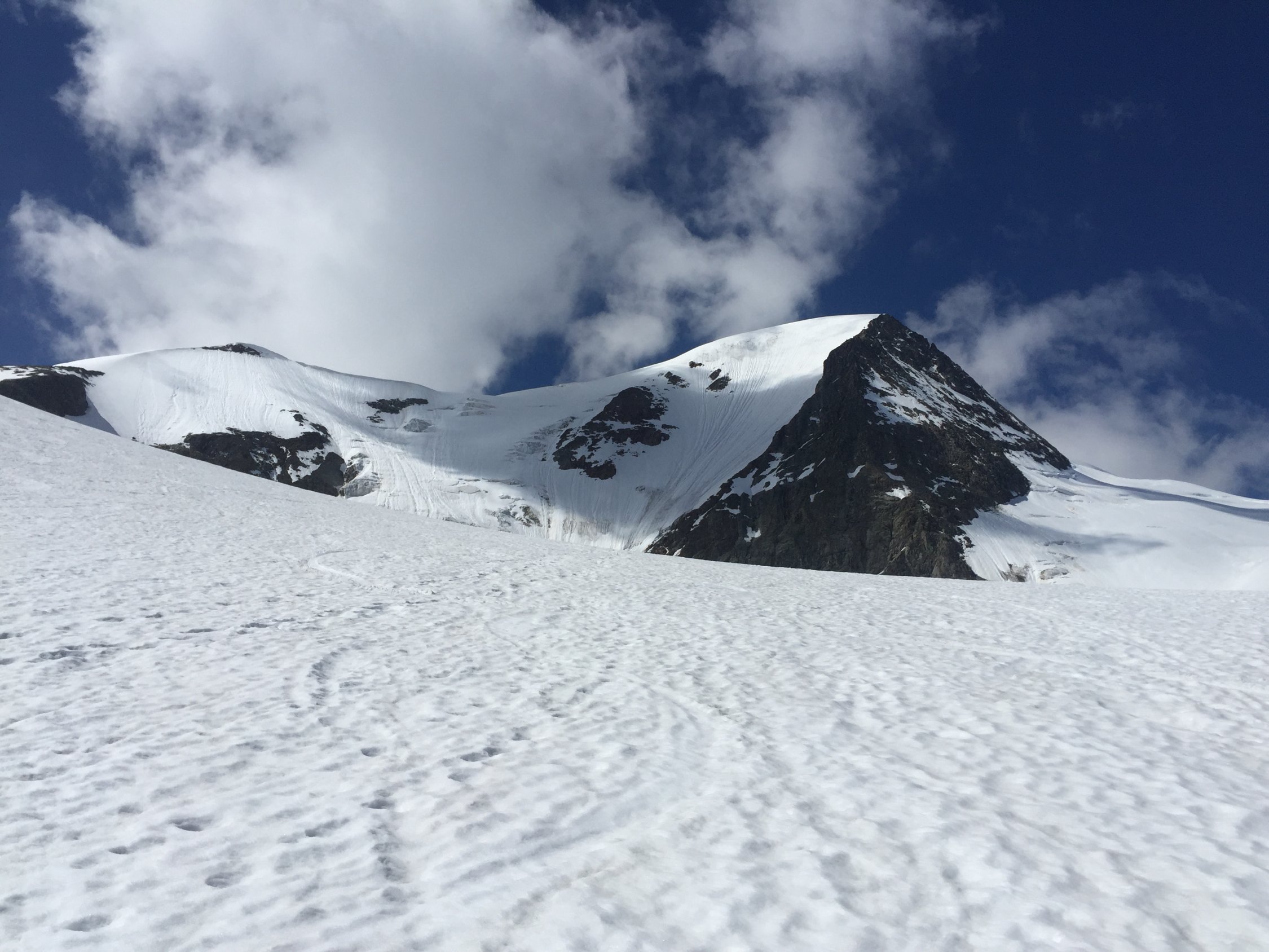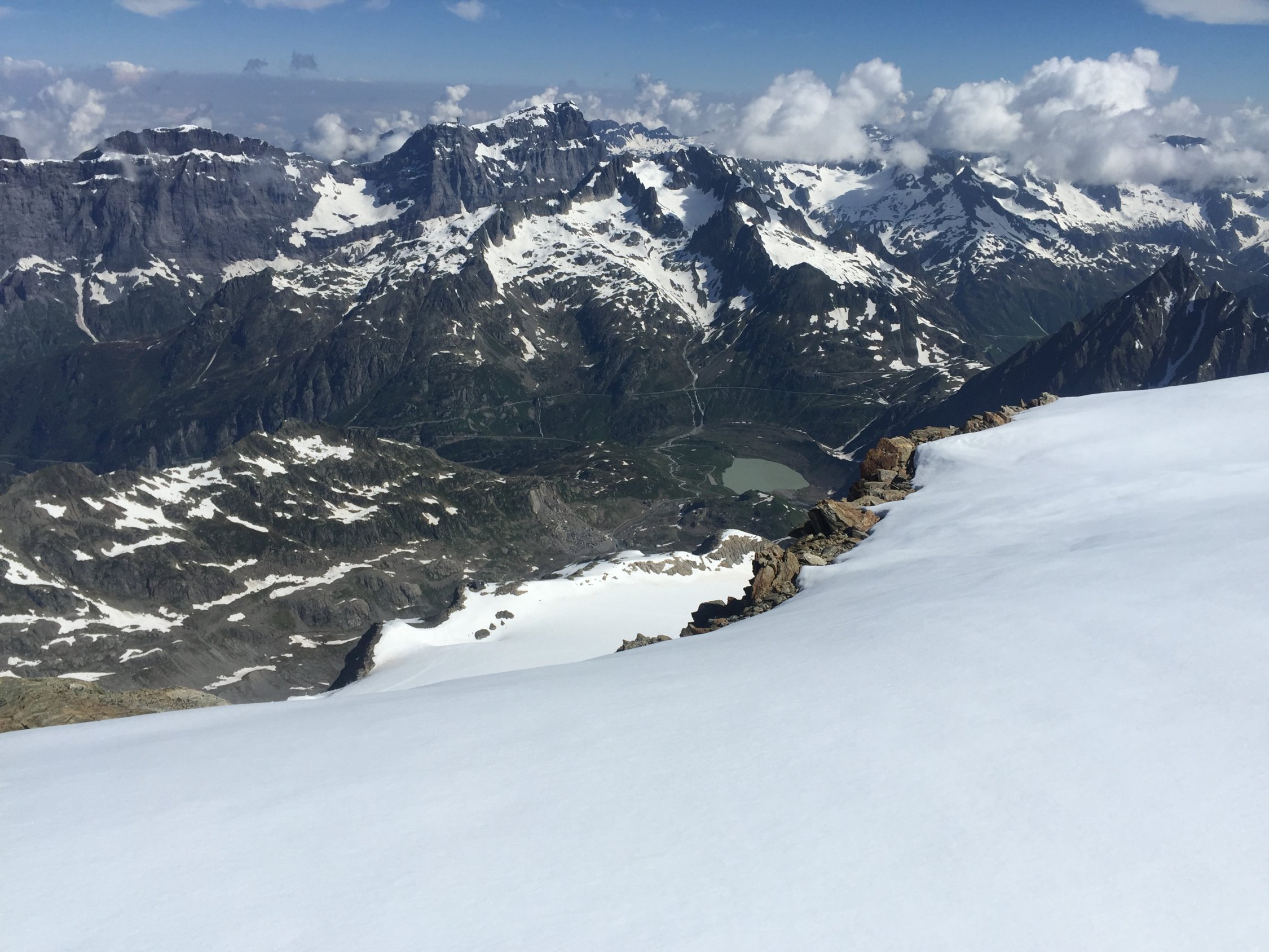Was für ein Juli-Beginn! Start um 07.00 beim PP Umpol, von dort 20 Min Skitragen bis unter Chüöbärgli. Der Schnee ist innert Wochenfrist sehr geschwunden. Auf dem Steingletscher zunächst gute Verhältnisse, aber der erste Bruch war grenzwertig. Nur noch ein schmales Band war durchgehend schneebedeckt, ansonsten bereits viel Blankeis, wo letzte Woche noch alles Schnee war. Ging gerade noch so ohne Steigeisen, aber wer hier ins Blankeis stürzt, sieht nachher wohl aus wie ein rohes Hacksteak. Oberhalb dann sofort Superverhältnisse, tragend gefroren. Weiterer Aufstieg daher problemlos, ausser mir war noch ein netter Skitourengänger am Gipfel und drei Bergsteiger, die über den Westgrat gekommen waren. Sehr schöne Gipfelrast, und diese wurde von der Abfahrt noch locker getoppt! Traumhafter Firn bis oberhalb des ersten Bruches, und das im Juli! Dann kurz ziemlich bremsiger Schnee, und nach dem Durchmogeln durch den ersten Bruch dann gut schwingbarer Sommerschnee, und dank Ausnutzen aller möglichen Schneeflecken konnte ich noch fahren bis in die Ebene vom Chüöbärgli. Klasse.
