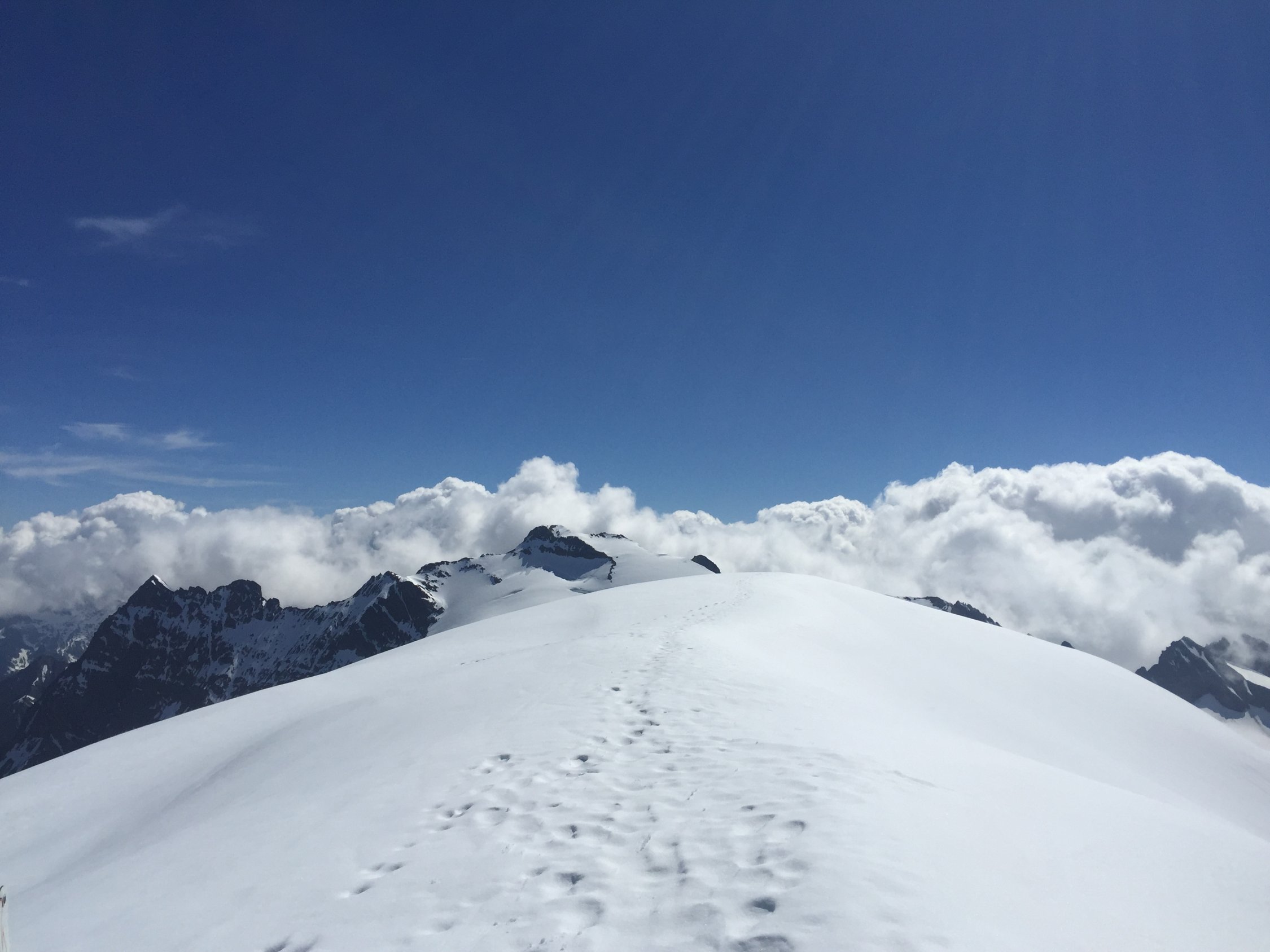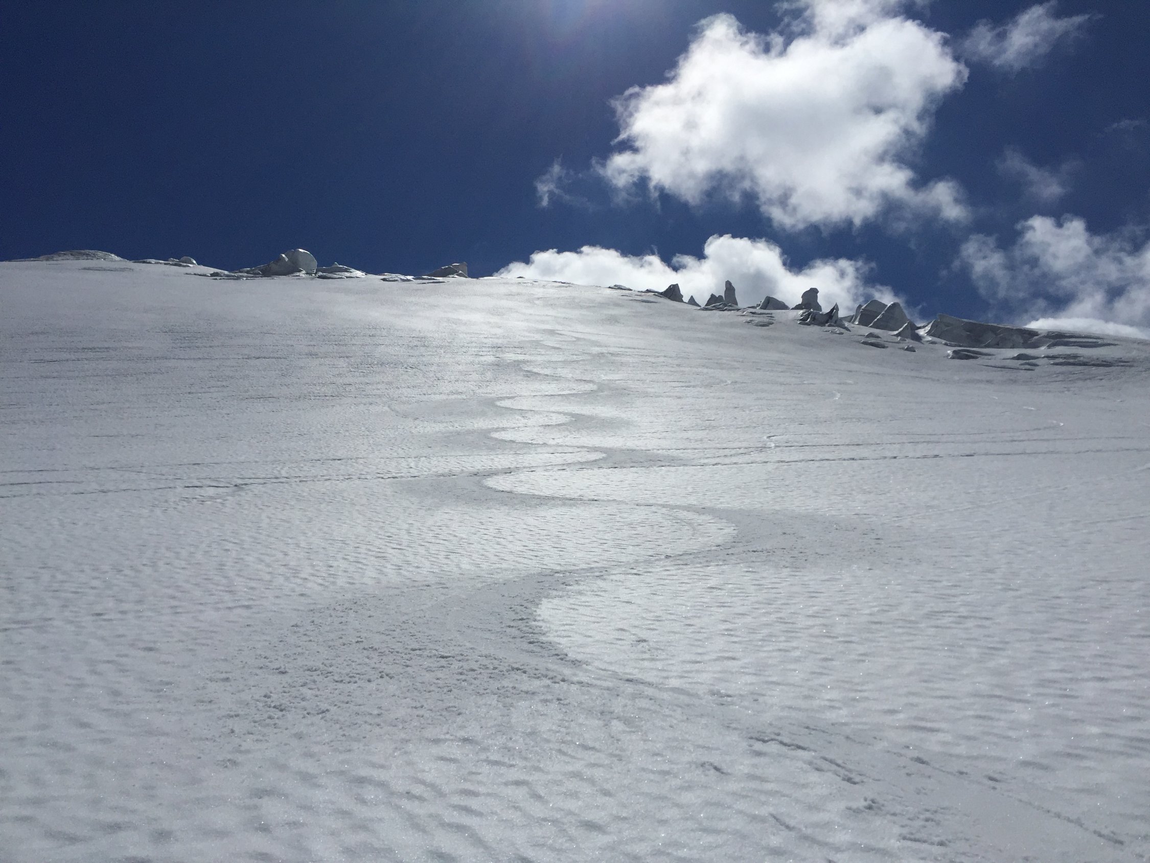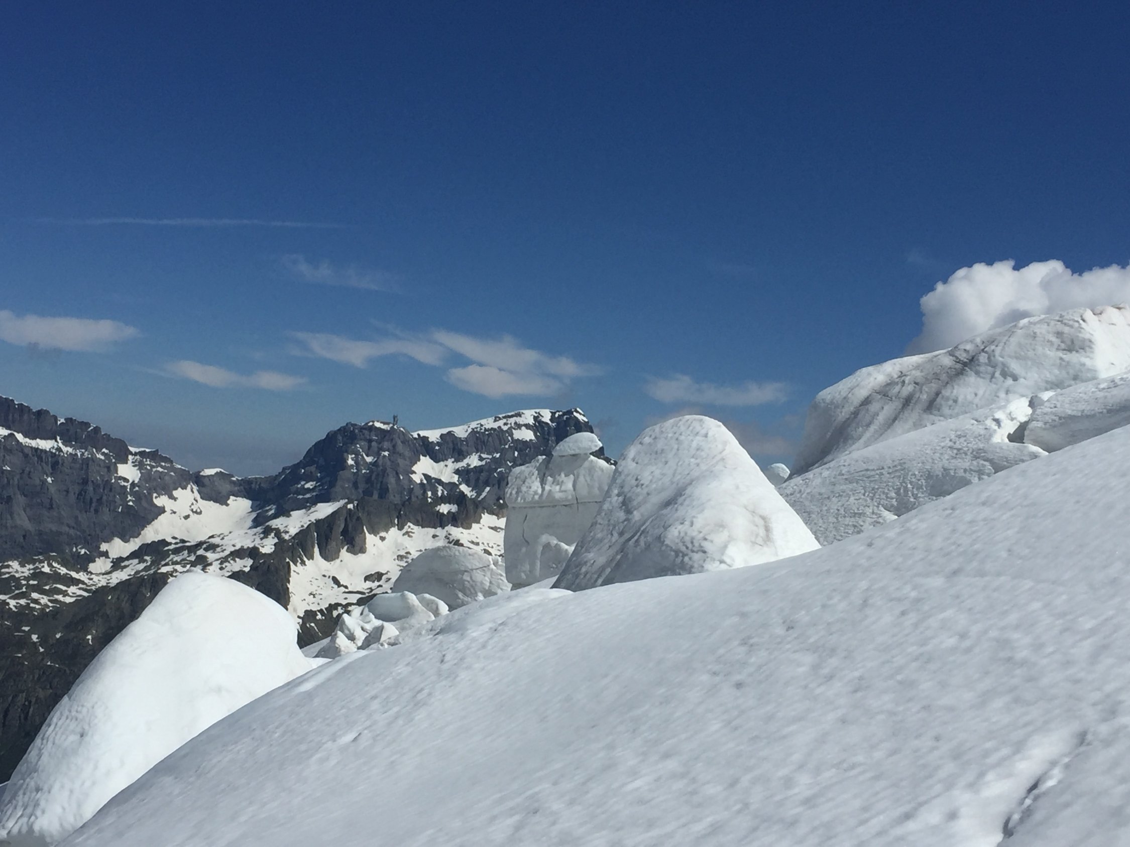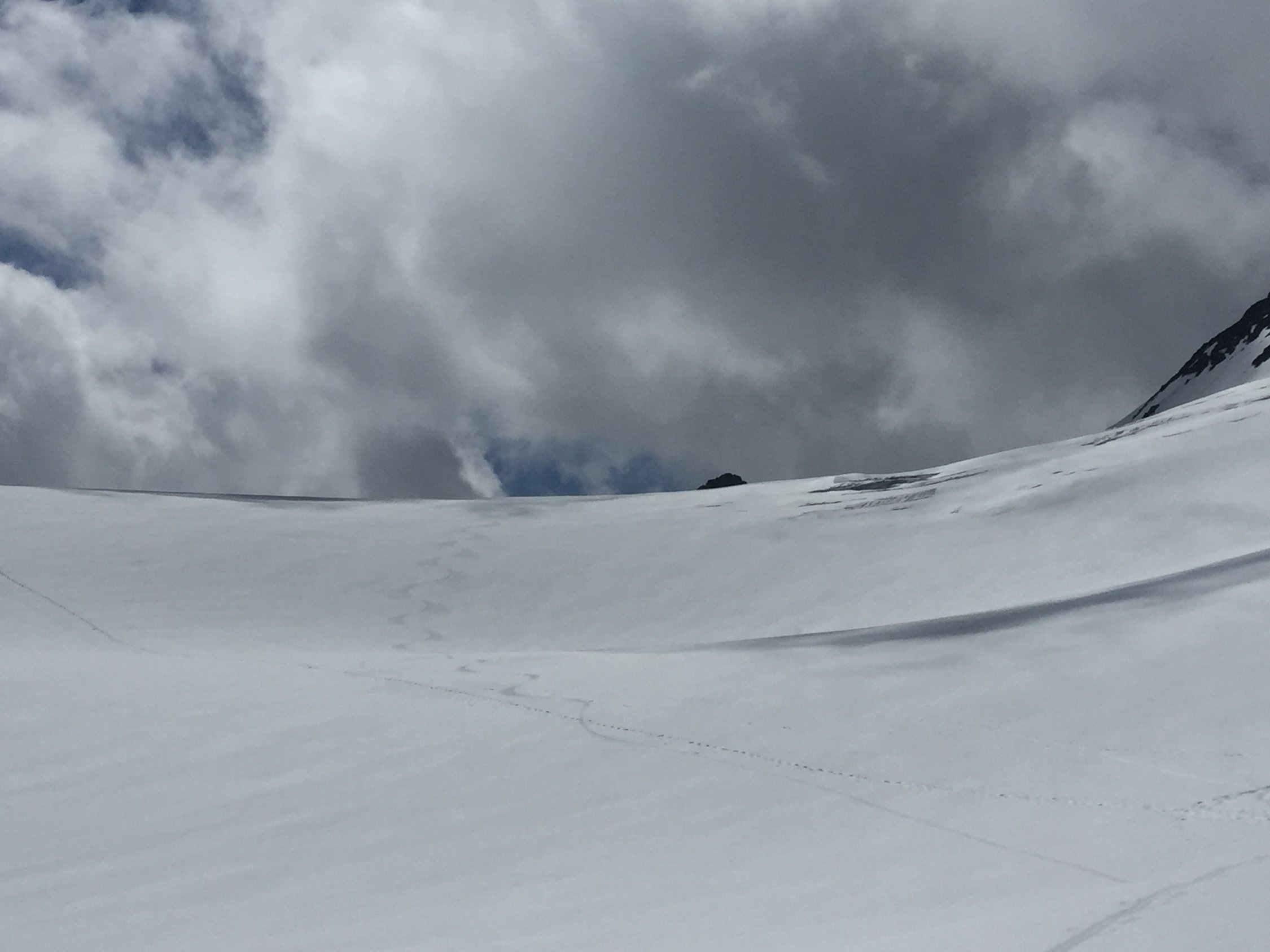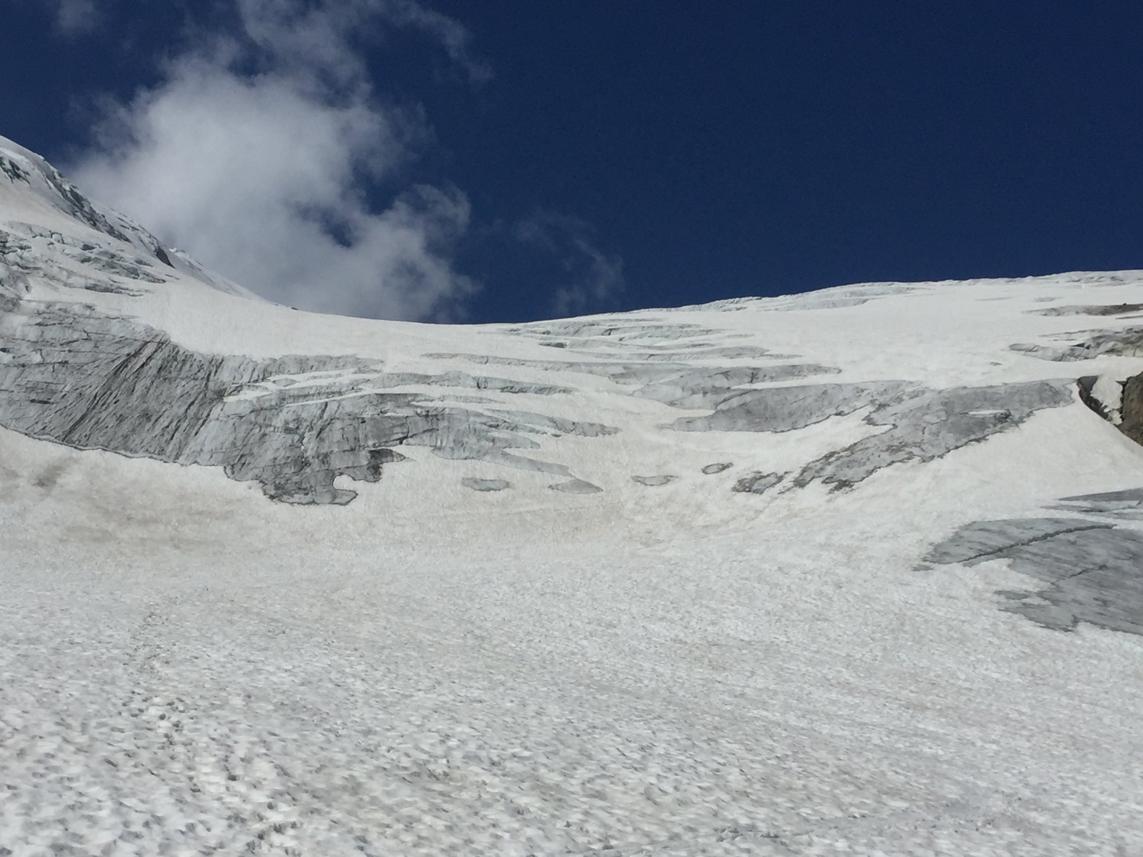 Was für ein Juli-Beginn! Start um 07.00 beim PP Umpol, von dort 20 Min Skitragen bis unter Chüöbärgli. Der Schnee ist innert Wochenfrist sehr geschwunden. Auf dem Steingletscher zunächst gute Verhältnisse, aber der erste Bruch war grenzwertig. Nur noch ein schmales Band war durchgehend schneebedeckt, ansonsten bereits viel Blankeis, wo letzte Woche noch alles Schnee war. Ging gerade noch so ohne Steigeisen, aber wer hier ins Blankeis stürzt, sieht nachher wohl aus wie ein rohes Hacksteak. Oberhalb dann sofort Superverhältnisse, tragend gefroren. Weiterer Aufstieg daher problemlos, ausser mir war noch ein netter Skitourengänger am Gipfel und drei Bergsteiger, die über den Westgrat gekommen waren. Sehr schöne Gipfelrast, und diese wurde von der Abfahrt noch locker getoppt! Traumhafter Firn bis oberhalb des ersten Bruches, und das im Juli! Dann kurz ziemlich bremsiger Schnee, und nach dem Durchmogeln durch den ersten Bruch dann gut schwingbarer Sommerschnee, und dank Ausnutzen aller möglichen Schneeflecken konnte ich noch fahren bis in die Ebene vom Chüöbärgli. Klasse.