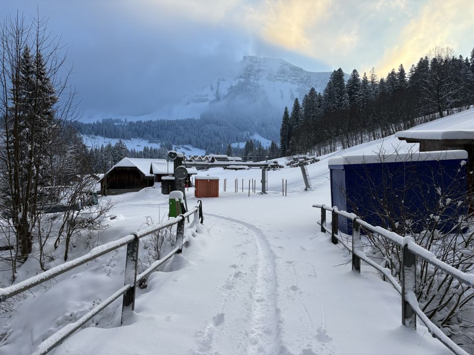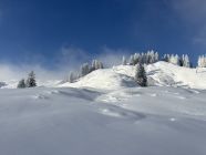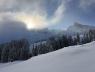Im Eriz 20-30 cm Pulver (überall ohne Unterlage), nach oben hin etwas mehr werdend (max. 50 cm), ab 1300 m mit vermehrtem Windeinfluss. Am Morgen noch grosse Windfahnen am Hohgant und Sigriswiler Grat, Wind nur auf dem Stauffen unangenehm, sobald die Sonne rauskam angenehm warm.