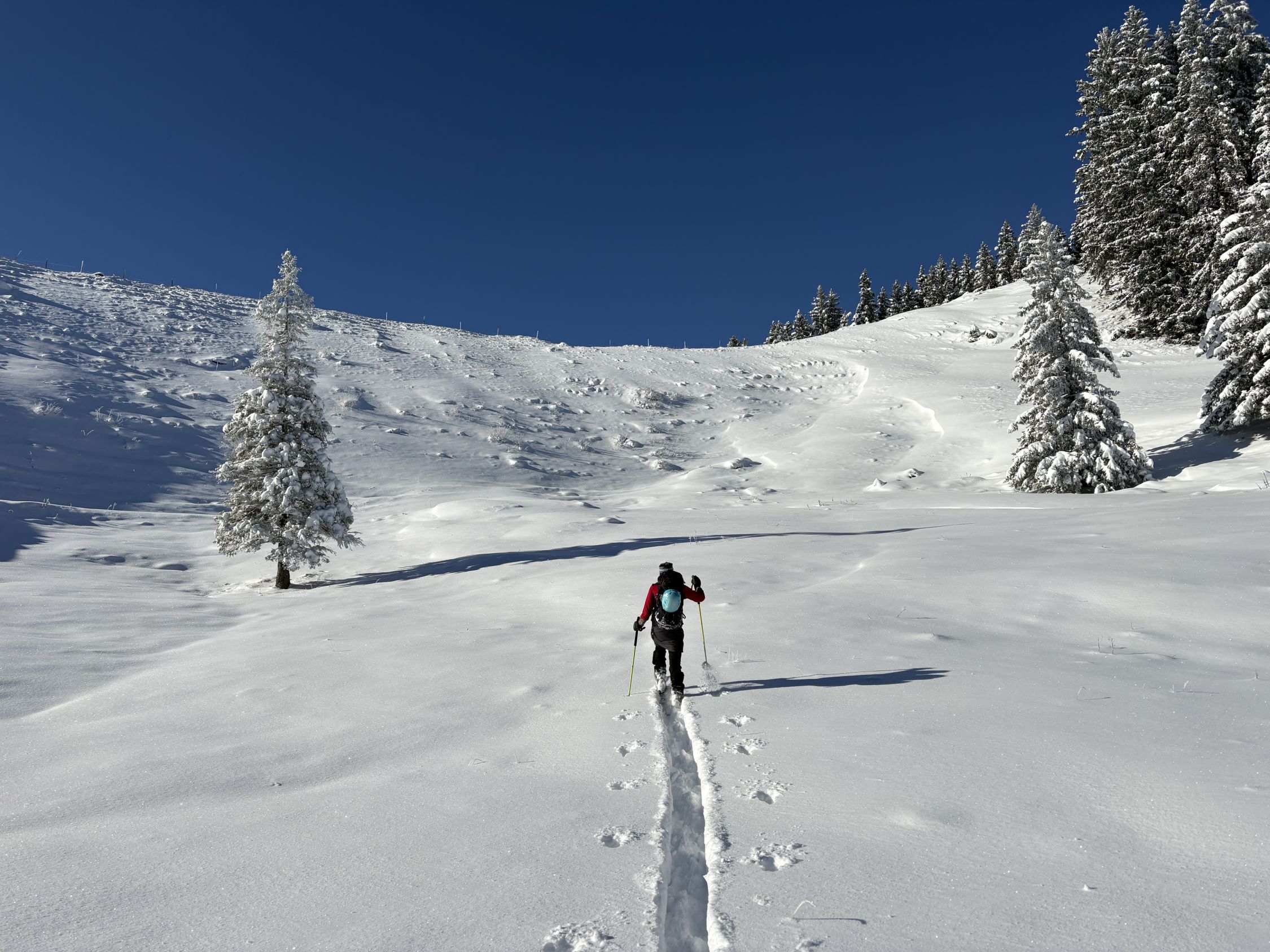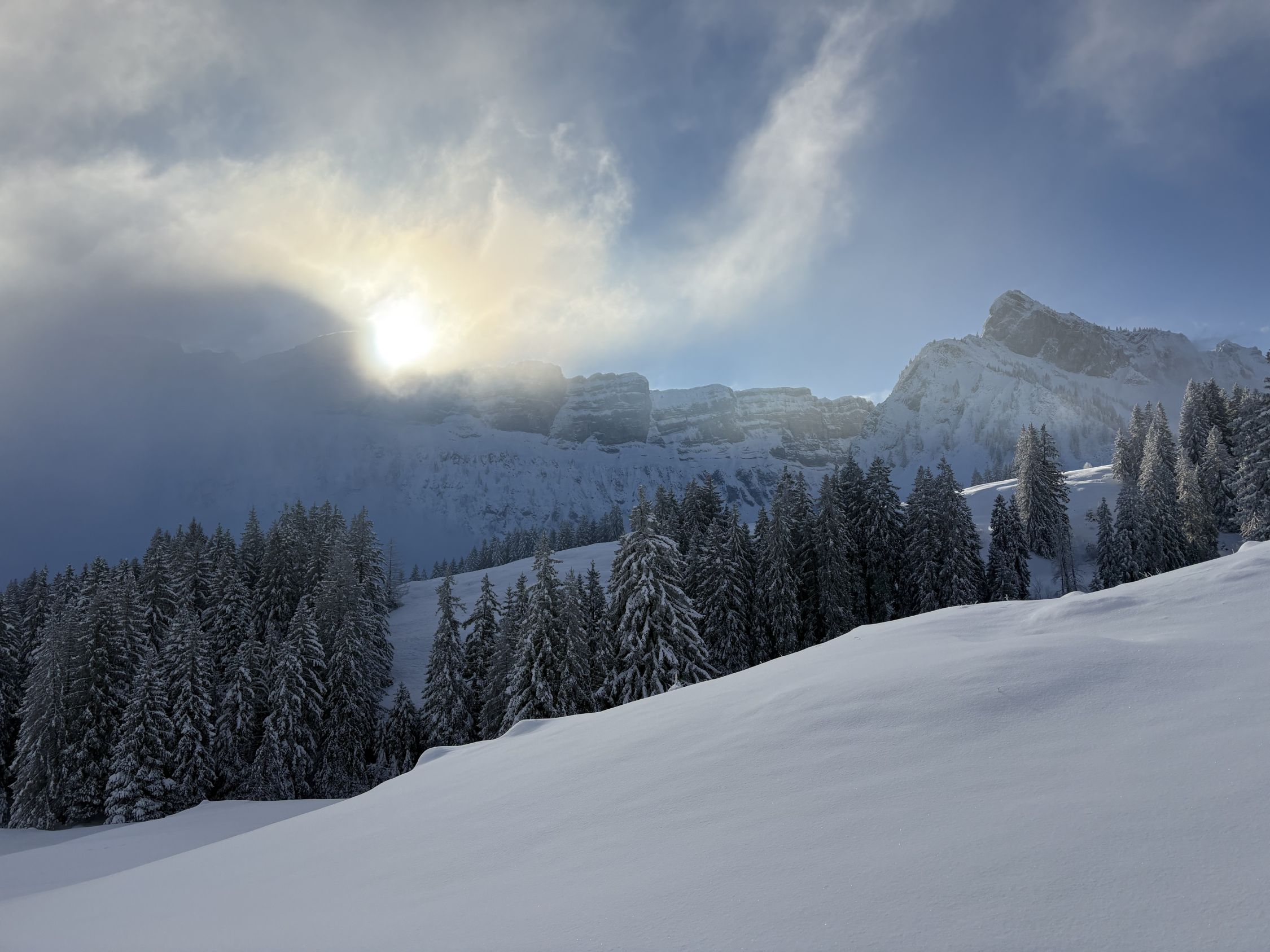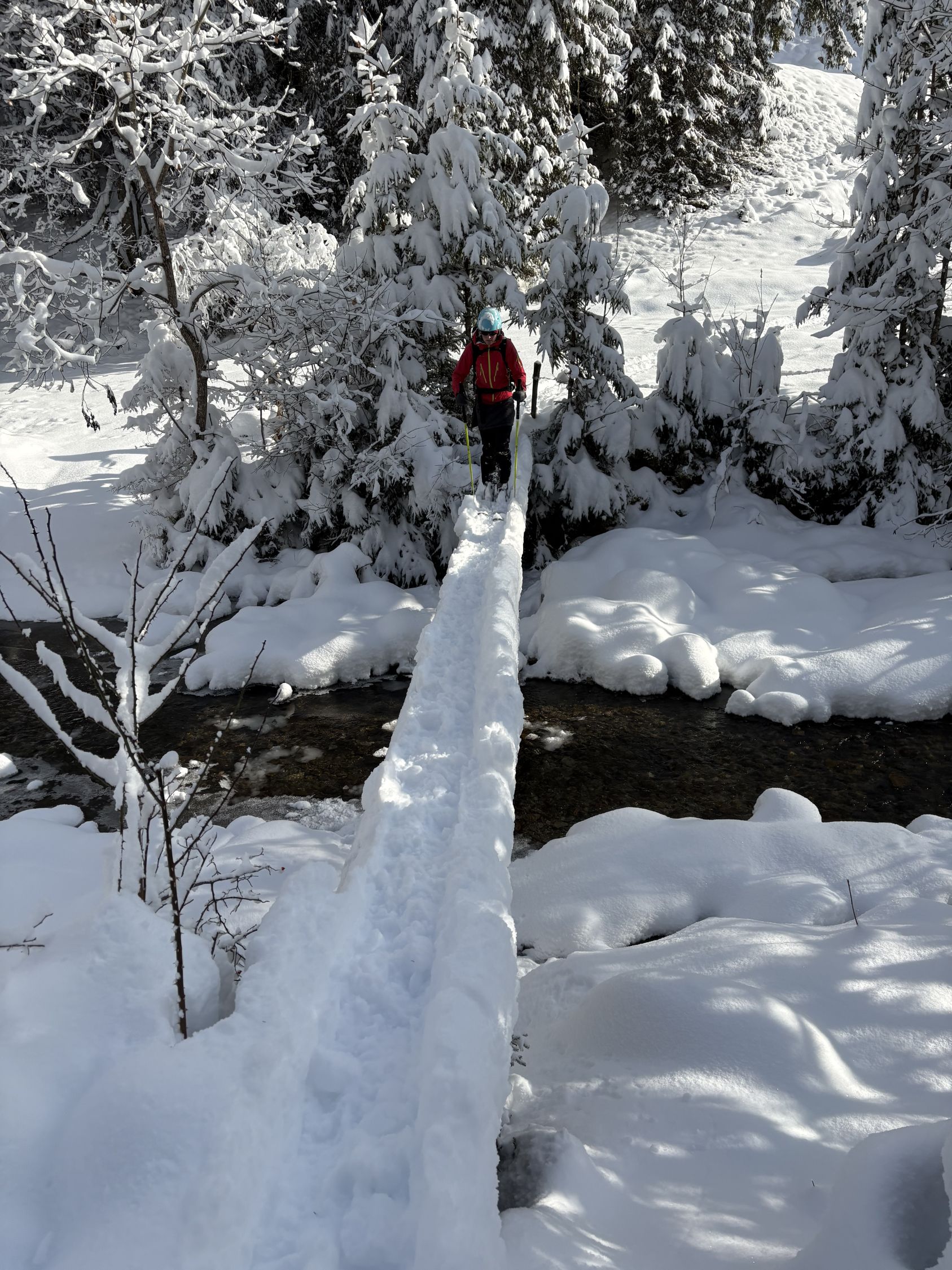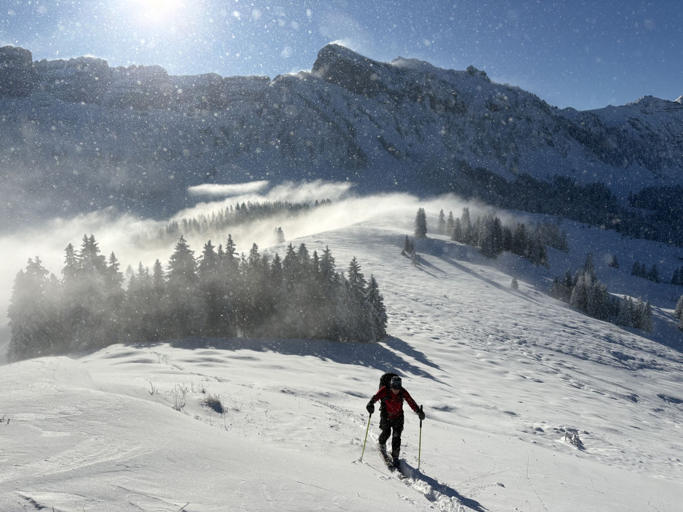 Die Querung ist nicht in erster Linie wegen der Abfahrt schön, die Kuhgangeln könnten noch besser eingeschneit sein. Dennoch ausreichend Schnee bis zur Zettenalp und einigermassen bis zur Säge. Blueme deutlich schlechter eingeschneit und insbesondere die Abfahrt unterhalb des Niesenbänkli eigentlich zu wenig Schnee. Der warme Boden und die Sonne (südseitig leichter Deckel) haben ihm hier schon ziemlich zugesetzt (10 cm), im Wald zwischen Chieni und Bloch war Tragen angesagt.