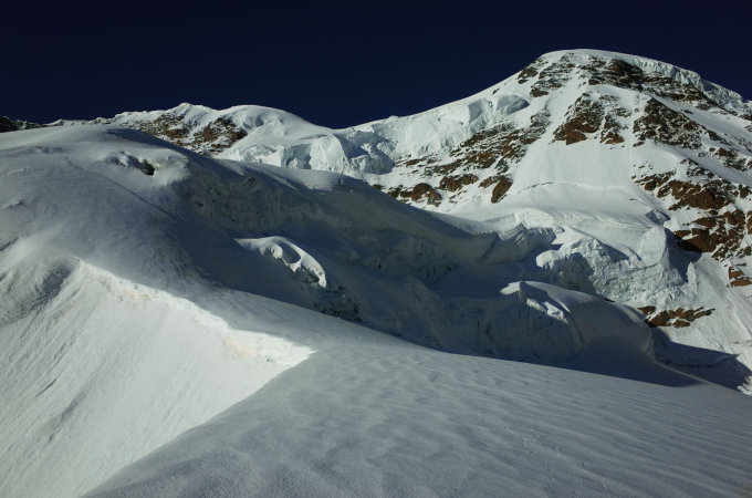 Insgesamt sehr gute Verhältnisse. Der Abstieg von der Gandegghütte auf den Unteren Theodulgletscher war problemlos, auf dem Gletscher gab es dann ein paar kurze Passagen mit tiefem Einsinken. Nach dem Passieren südlich von Pt. 2980 stiegen wir etwa 100m ab und querten den Triftjigletscher auf ca. 2850m. So konnten wir den mächtigen, aktiven Serac grossräumig umgehen. Vom Triftjisattel stiegen wir zuerst westlich vom Grat im Schnee und später über den Grat zum Triftjiplateau auf. Auch hier brach man zwischendurch mal ein, meistens war der Schnee aber tragend und schön griffig. Das Triftjiplateau querten wir bis zum westlichen Ende des Bergschrundes und stiegen von dort in der Gipfelfallinie, ca. 80m rechts der Original-Route, bei besten Verhältnissen auf. Im oberen Teil wurde der Schnee dann wieder weicher. Man konnte mit nur wenig Felskontakt auf den Gipfel aussteigen. Südseitig war die Schneedecke durchgehend kompakt und griffig.