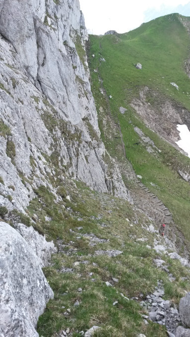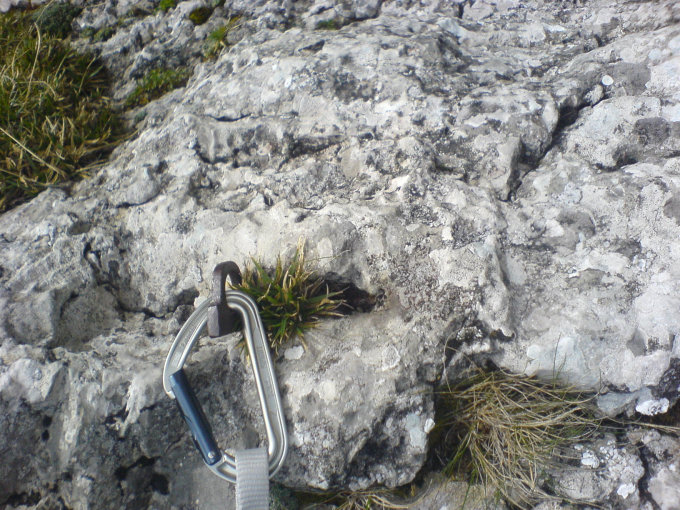 Die Verhältnisse in der Wand waren gut, Fels und Gras trocken. Die Route ist keine klassische Sportkletterroute, eher etwas für Freunde der Selbstsicherung. Wo es aber wirklich Sicherungspunkte/Stände braucht, hat es auch welche.