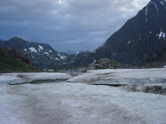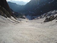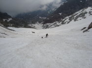 Auf Büser-/Kachelschnee, welcher trittfest jedoch nicht durchgefroren war, ging es bis zur Steilstufe am Anfang des Gletschers.