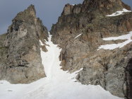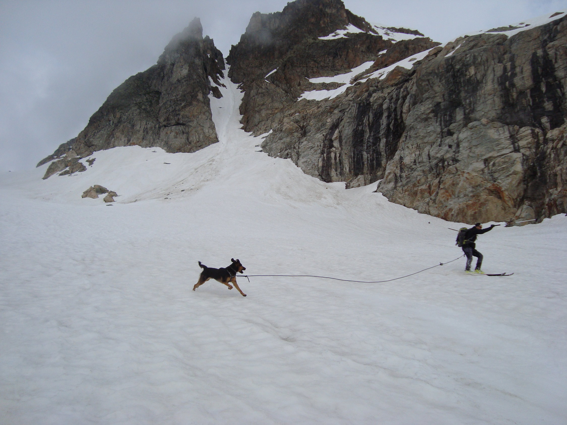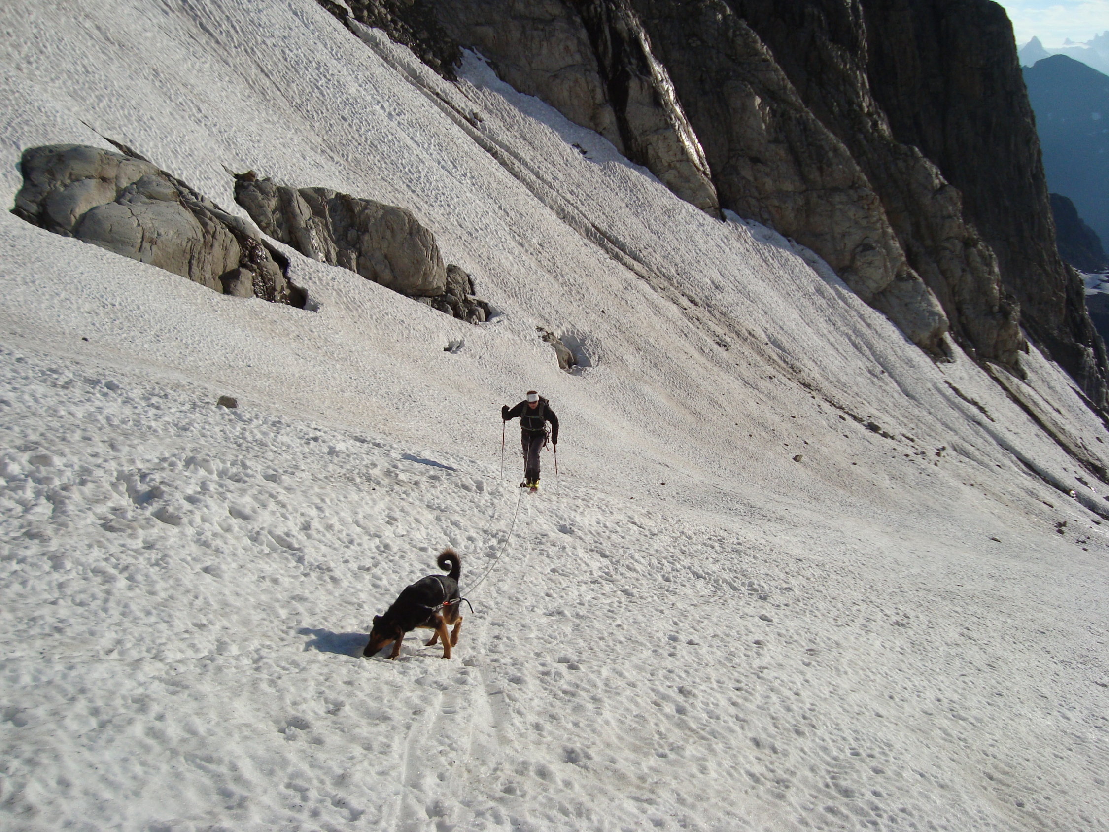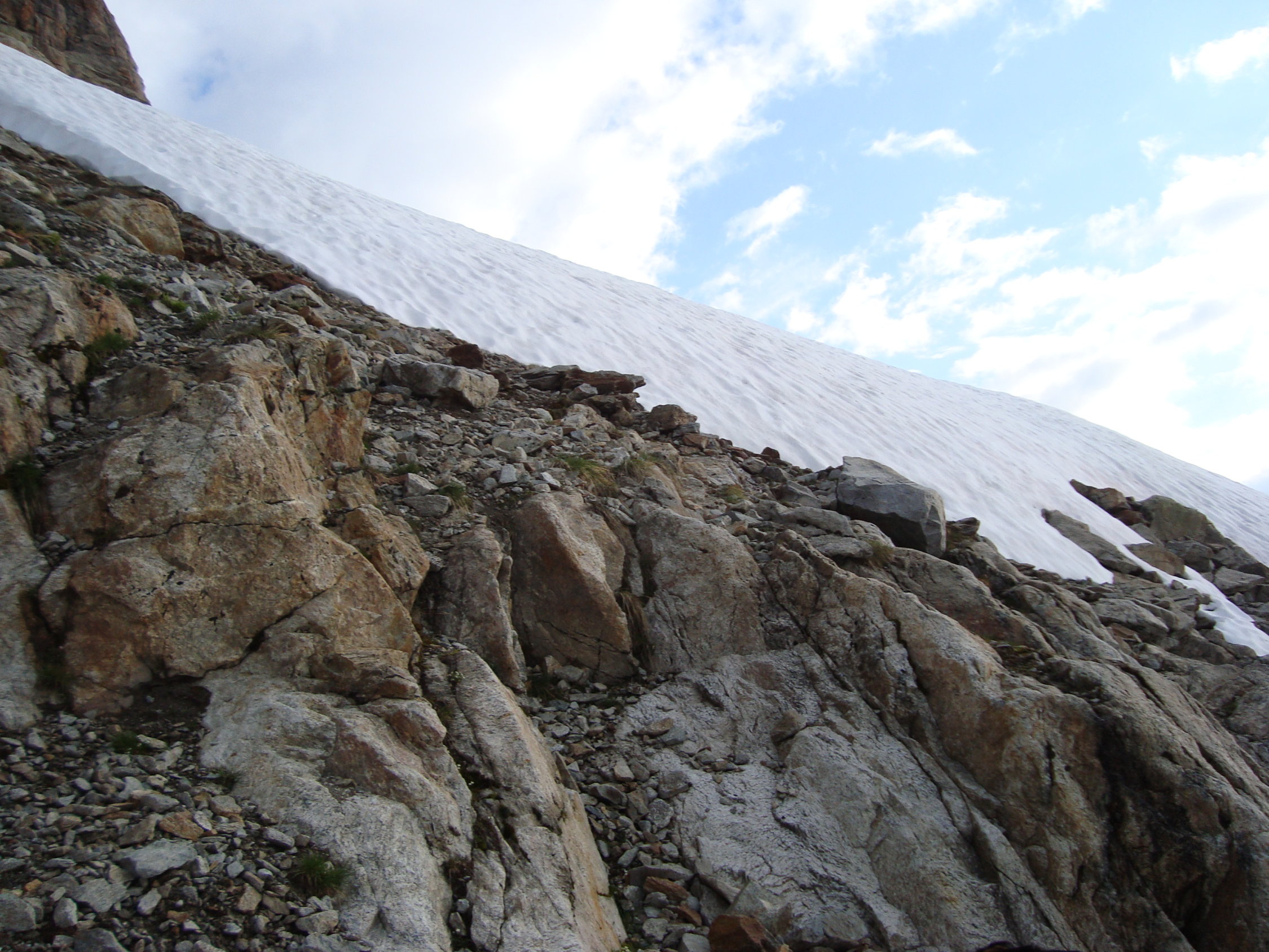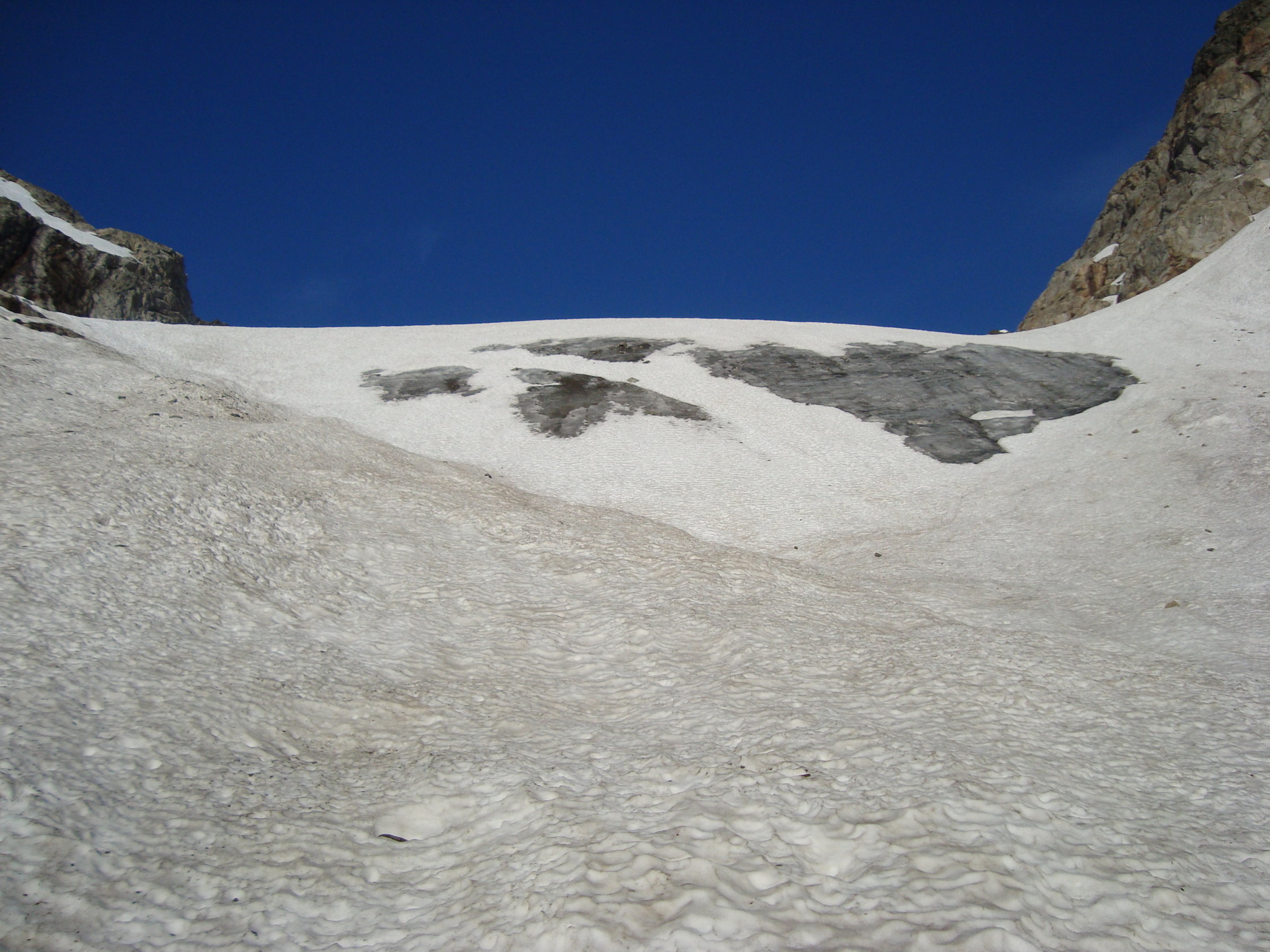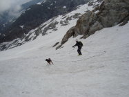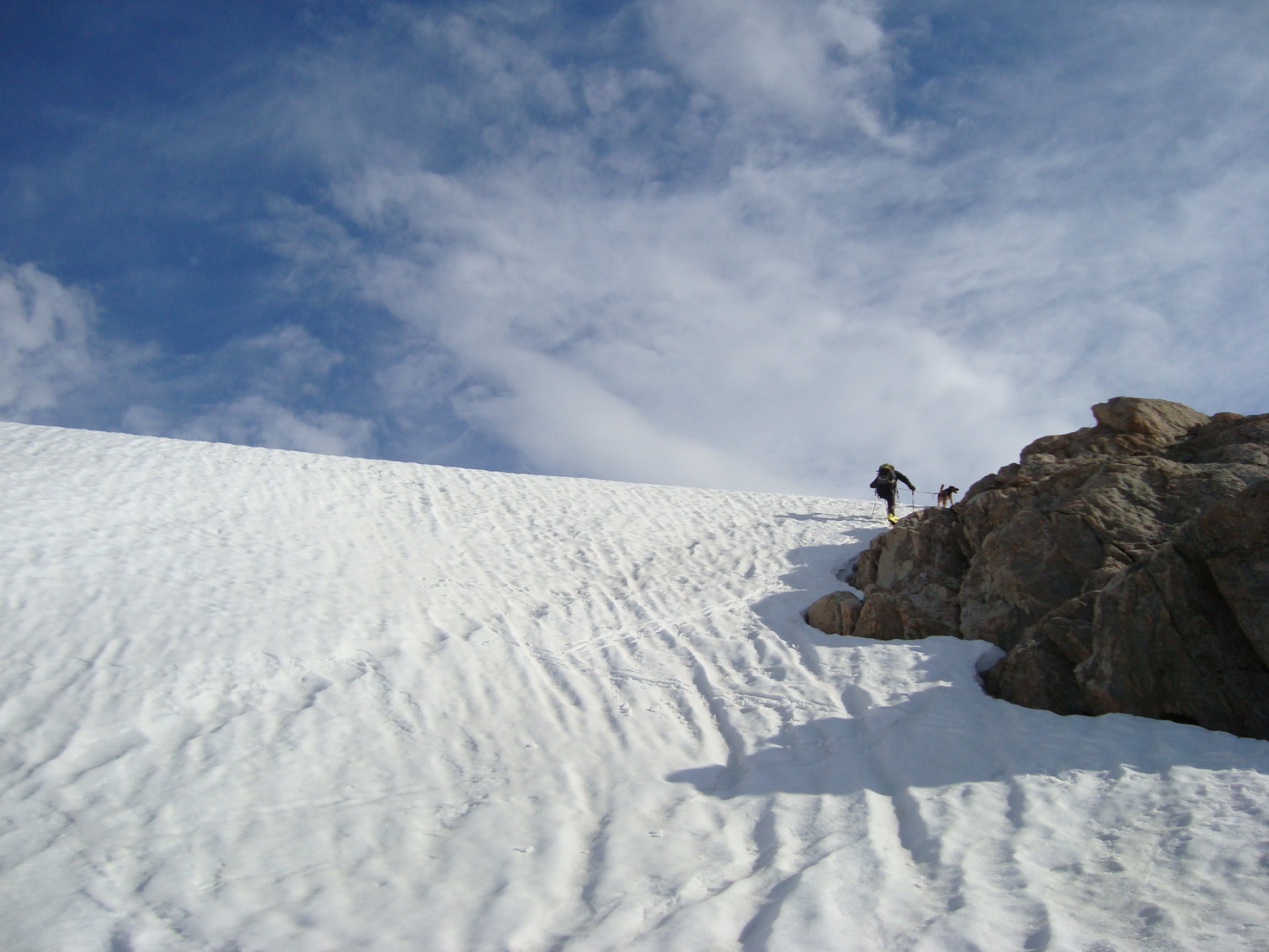 Danach auf den noch sehr gut eingeschneiten Gletscher, gegen Ende aufsteilend, zur Schlüsselpassage der Tour(Traverse). Hier rutschte die obere feuchtere Schicht gern mal unter den Skiern weg.