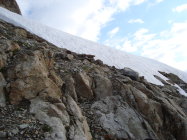 Die Traverse ist mittlerweile zum grössten Teil aper, somit sind ca.20-25Meter mit den Ski am Rucksack, in steilem Gehgelände zu bewältigen.